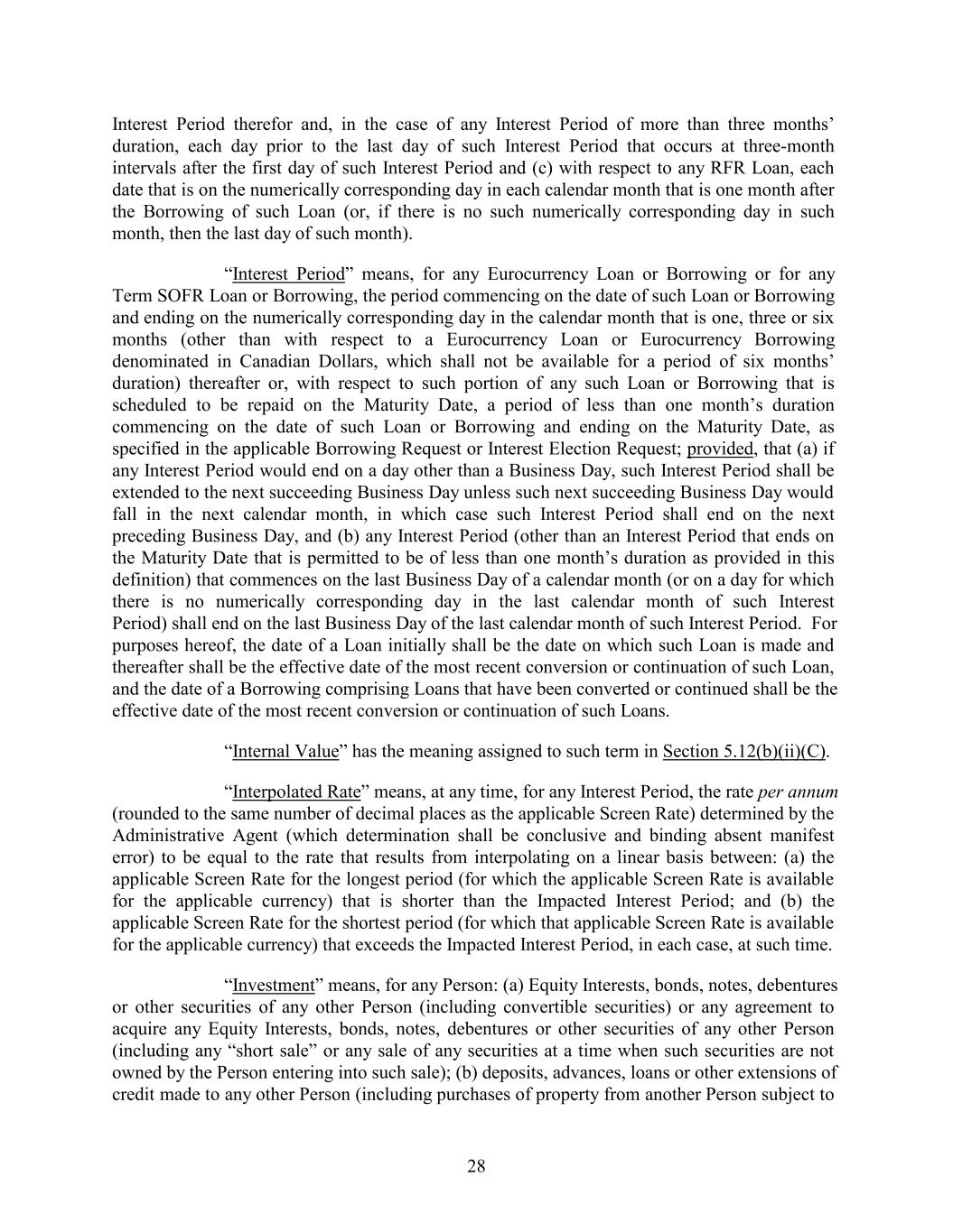 Interest Period therefor and, in the case of any Interest Period of more than three months’ duration, each day prior to the last day of such Interest Period that occurs at three-month intervals after the first day of such Interest Period and (c) with respect to any RFR Loan, each date that is on the numerically corresponding day in each calendar month that is one month after the Borrowing of such Loan (or, if there is no such numerically corresponding day in such month, then the last day of such month). “Interest Period” means, for any Eurocurrency Loan or Borrowing or for any Term SOFR Loan or Borrowing, the period commencing on the date of such Loan or Borrowing and ending on the numerically corresponding day in the calendar month that is one, three or six months (other than with respect to a Eurocurrency Loan or Eurocurrency Borrowing denominated in Canadian Dollars, which shall not be available for a period of six months’ duration) thereafter or, with respect to such portion of any such Loan or Borrowing that is scheduled to be repaid on the Maturity Date, a period of less than one month’s duration commencing on the date of such Loan or Borrowing and ending on the Maturity Date, as specified in the applicable Borrowing Request or Interest Election Request; provided, that (a) if any Interest Period would end on a day other than a Business Day, such Interest Period shall be extended to the next succeeding Business Day unless such next succeeding Business Day would fall in the next calendar month, in which case such Interest Period shall end on the next preceding Business Day, and (b) any Interest Period (other than an Interest Period that ends on the Maturity Date that is permitted to be of less than one month’s duration as provided in this definition) that commences on the last Business Day of a calendar month (or on a day for which there is no numerically corresponding day in the last calendar month of such Interest Period) shall end on the last Business Day of the last calendar month of such Interest Period. For purposes hereof, the date of a Loan initially shall be the date on which such Loan is made and thereafter shall be the effective date of the most recent conversion or continuation of such Loan, and the date of a Borrowing comprising Loans that have been converted or continued shall be the effective date of the most recent conversion or continuation of such Loans. “Internal Value” has the meaning assigned to such term in Section 5.12(b)(ii)(C). “Interpolated Rate” means, at any time, for any Interest Period, the rate per annum (rounded to the same number of decimal places as the applicable Screen Rate) determined by the Administrative Agent (which determination shall be conclusive and binding absent manifest error) to be equal to the rate that results from interpolating on a linear basis between: (a) the applicable Screen Rate for the longest period (for which the applicable Screen Rate is available for the applicable currency) that is shorter than the Impacted Interest Period; and (b) the applicable Screen Rate for the shortest period (for which that applicable Screen Rate is available for the applicable currency) that exceeds the Impacted Interest Period, in each case, at such time. “Investment” means, for any Person: (a) Equity Interests, bonds, notes, debentures or other securities of any other Person (including convertible securities) or any agreement to acquire any Equity Interests, bonds, notes, debentures or other securities of any other Person (including any “short sale” or any sale of any securities at a time when such securities are not owned by the Person entering into such sale); (b) deposits, advances, loans or other extensions of credit made to any other Person (including purchases of property from another Person subject to 28