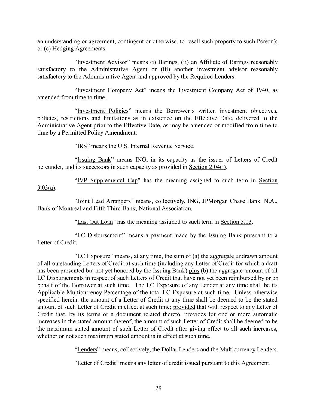an understanding or agreement, contingent or otherwise, to resell such property to such Person); or (c) Hedging Agreements. “Investment Advisor” means (i) Barings, (ii) an Affiliate of Barings reasonably satisfactory to the Administrative Agent or (iii) another investment advisor reasonably satisfactory to the Administrative Agent and approved by the Required Lenders. “Investment Company Act” means the Investment Company Act of 1940, as amended from time to time. “Investment Policies” means the Borrower’s written investment objectives, policies, restrictions and limitations as in existence on the Effective Date, delivered to the Administrative Agent prior to the Effective Date, as may be amended or modified from time to time by a Permitted Policy Amendment. “IRS” means the U.S. Internal Revenue Service. “Issuing Bank” means ING, in its capacity as the issuer of Letters of Credit hereunder, and its successors in such capacity as provided in Section 2.04(j). “IVP Supplemental Cap” has the meaning assigned to such term in Section 9.03(a). “Joint Lead Arrangers” means, collectively, ING, JPMorgan Chase Bank, N.A., Bank of Montreal and Fifth Third Bank, National Association. “Last Out Loan” has the meaning assigned to such term in Section 5.13. “LC Disbursement” means a payment made by the Issuing Bank pursuant to a Letter of Credit. “LC Exposure” means, at any time, the sum of (a) the aggregate undrawn amount of all outstanding Letters of Credit at such time (including any Letter of Credit for which a draft has been presented but not yet honored by the Issuing Bank) plus (b) the aggregate amount of all LC Disbursements in respect of such Letters of Credit that have not yet been reimbursed by or on behalf of the Borrower at such time. The LC Exposure of any Lender at any time shall be its Applicable Multicurrency Percentage of the total LC Exposure at such time. Unless otherwise specified herein, the amount of a Letter of Credit at any time shall be deemed to be the stated amount of such Letter of Credit in effect at such time; provided that with respect to any Letter of Credit that, by its terms or a document related thereto, provides for one or more automatic increases in the stated amount thereof, the amount of such Letter of Credit shall be deemed to be the maximum stated amount of such Letter of Credit after giving effect to all such increases, whether or not such maximum stated amount is in effect at such time. “Lenders” means, collectively, the Dollar Lenders and the Multicurrency Lenders. “Letter of Credit” means any letter of credit issued pursuant to this Agreement. 29