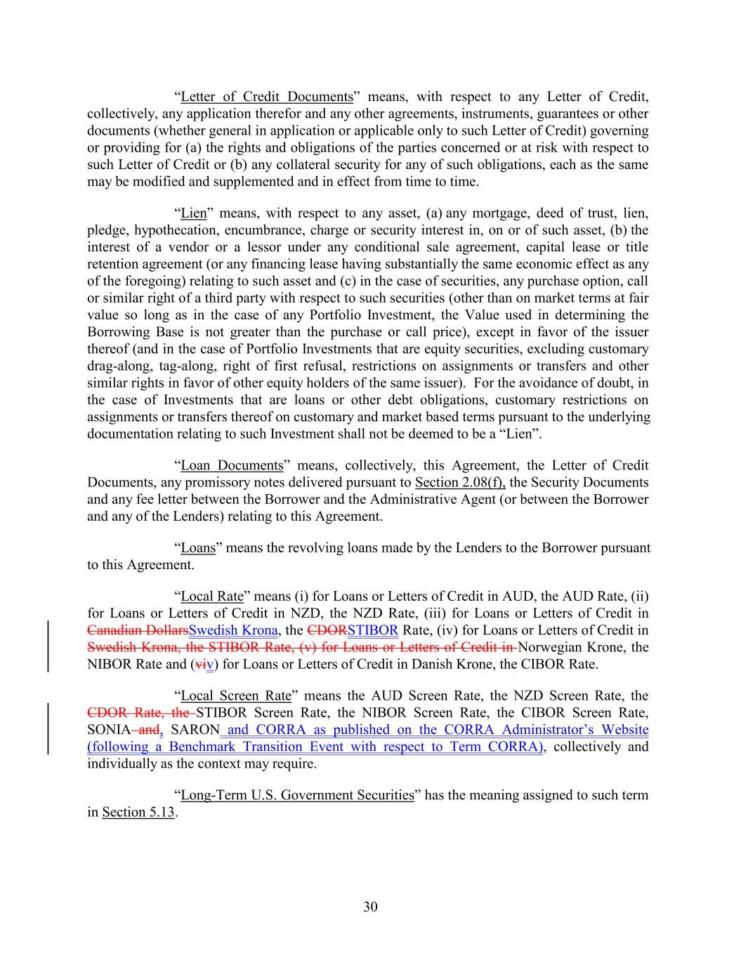 “Letter of Credit Documents” means, with respect to any Letter of Credit, collectively, any application therefor and any other agreements, instruments, guarantees or other documents (whether general in application or applicable only to such Letter of Credit) governing or providing for (a) the rights and obligations of the parties concerned or at risk with respect to such Letter of Credit or (b) any collateral security for any of such obligations, each as the same may be modified and supplemented and in effect from time to time. “Lien” means, with respect to any asset, (a) any mortgage, deed of trust, lien, pledge, hypothecation, encumbrance, charge or security interest in, on or of such asset, (b) the interest of a vendor or a lessor under any conditional sale agreement, capital lease or title retention agreement (or any financing lease having substantially the same economic effect as any of the foregoing) relating to such asset and (c) in the case of securities, any purchase option, call or similar right of a third party with respect to such securities (other than on market terms at fair value so long as in the case of any Portfolio Investment, the Value used in determining the Borrowing Base is not greater than the purchase or call price), except in favor of the issuer thereof (and in the case of Portfolio Investments that are equity securities, excluding customary drag-along, tag-along, right of first refusal, restrictions on assignments or transfers and other similar rights in favor of other equity holders of the same issuer). For the avoidance of doubt, in the case of Investments that are loans or other debt obligations, customary restrictions on assignments or transfers thereof on customary and market based terms pursuant to the underlying documentation relating to such Investment shall not be deemed to be a “Lien”. “Loan Documents” means, collectively, this Agreement, the Letter of Credit Documents, any promissory notes delivered pursuant to Section 2.08(f), the Security Documents and any fee letter between the Borrower and the Administrative Agent (or between the Borrower and any of the Lenders) relating to this Agreement. “Loans” means the revolving loans made by the Lenders to the Borrower pursuant to this Agreement. “Local Rate” means (i) for Loans or Letters of Credit in AUD, the AUD Rate, (ii) for Loans or Letters of Credit in NZD, the NZD Rate, (iii) for Loans or Letters of Credit in Canadian DollarsSwedish Krona, the CDORSTIBOR Rate, (iv) for Loans or Letters of Credit in Swedish Krona, the STIBOR Rate, (v) for Loans or Letters of Credit in Norwegian Krone, the NIBOR Rate and (viv) for Loans or Letters of Credit in Danish Krone, the CIBOR Rate. “Local Screen Rate” means the AUD Screen Rate, the NZD Screen Rate, the CDOR Rate, the STIBOR Screen Rate, the NIBOR Screen Rate, the CIBOR Screen Rate, SONIA and, SARON and CORRA as published on the CORRA Administrator’s Website (following a Benchmark Transition Event with respect to Term CORRA), collectively and individually as the context may require. “Long-Term U.S. Government Securities” has the meaning assigned to such term in Section 5.13. 30