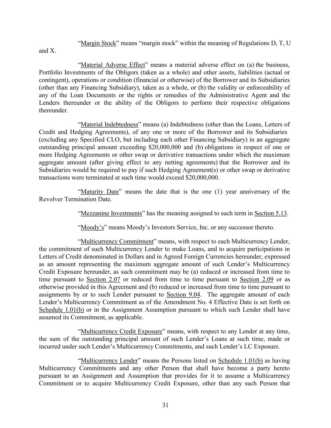 “Margin Stock” means “margin stock” within the meaning of Regulations D, T, U and X. “Material Adverse Effect” means a material adverse effect on (a) the business, Portfolio Investments of the Obligors (taken as a whole) and other assets, liabilities (actual or contingent), operations or condition (financial or otherwise) of the Borrower and its Subsidiaries (other than any Financing Subsidiary), taken as a whole, or (b) the validity or enforceability of any of the Loan Documents or the rights or remedies of the Administrative Agent and the Lenders thereunder or the ability of the Obligors to perform their respective obligations thereunder. “Material Indebtedness” means (a) Indebtedness (other than the Loans, Letters of Credit and Hedging Agreements), of any one or more of the Borrower and its Subsidiaries (excluding any Specified CLO, but including each other Financing Subsidiary) in an aggregate outstanding principal amount exceeding $20,000,000 and (b) obligations in respect of one or more Hedging Agreements or other swap or derivative transactions under which the maximum aggregate amount (after giving effect to any netting agreements) that the Borrower and its Subsidiaries would be required to pay if such Hedging Agreement(s) or other swap or derivative transactions were terminated at such time would exceed $20,000,000. “Maturity Date” means the date that is the one (1) year anniversary of the Revolver Termination Date. “Mezzanine Investments” has the meaning assigned to such term in Section 5.13. “Moody’s” means Moody’s Investors Service, Inc. or any successor thereto. “Multicurrency Commitment” means, with respect to each Multicurrency Lender, the commitment of such Multicurrency Lender to make Loans, and to acquire participations in Letters of Credit denominated in Dollars and in Agreed Foreign Currencies hereunder, expressed as an amount representing the maximum aggregate amount of such Lender’s Multicurrency Credit Exposure hereunder, as such commitment may be (a) reduced or increased from time to time pursuant to Section 2.07 or reduced from time to time pursuant to Section 2.09 or as otherwise provided in this Agreement and (b) reduced or increased from time to time pursuant to assignments by or to such Lender pursuant to Section 9.04. The aggregate amount of each Lender’s Multicurrency Commitment as of the Amendment No. 4 Effective Date is set forth on Schedule 1.01(b) or in the Assignment Assumption pursuant to which such Lender shall have assumed its Commitment, as applicable. “Multicurrency Credit Exposure” means, with respect to any Lender at any time, the sum of the outstanding principal amount of such Lender’s Loans at such time, made or incurred under such Lender’s Multicurrency Commitments, and such Lender’s LC Exposure. “Multicurrency Lender” means the Persons listed on Schedule 1.01(b) as having Multicurrency Commitments and any other Person that shall have become a party hereto pursuant to an Assignment and Assumption that provides for it to assume a Multicurrency Commitment or to acquire Multicurrency Credit Exposure, other than any such Person that 31