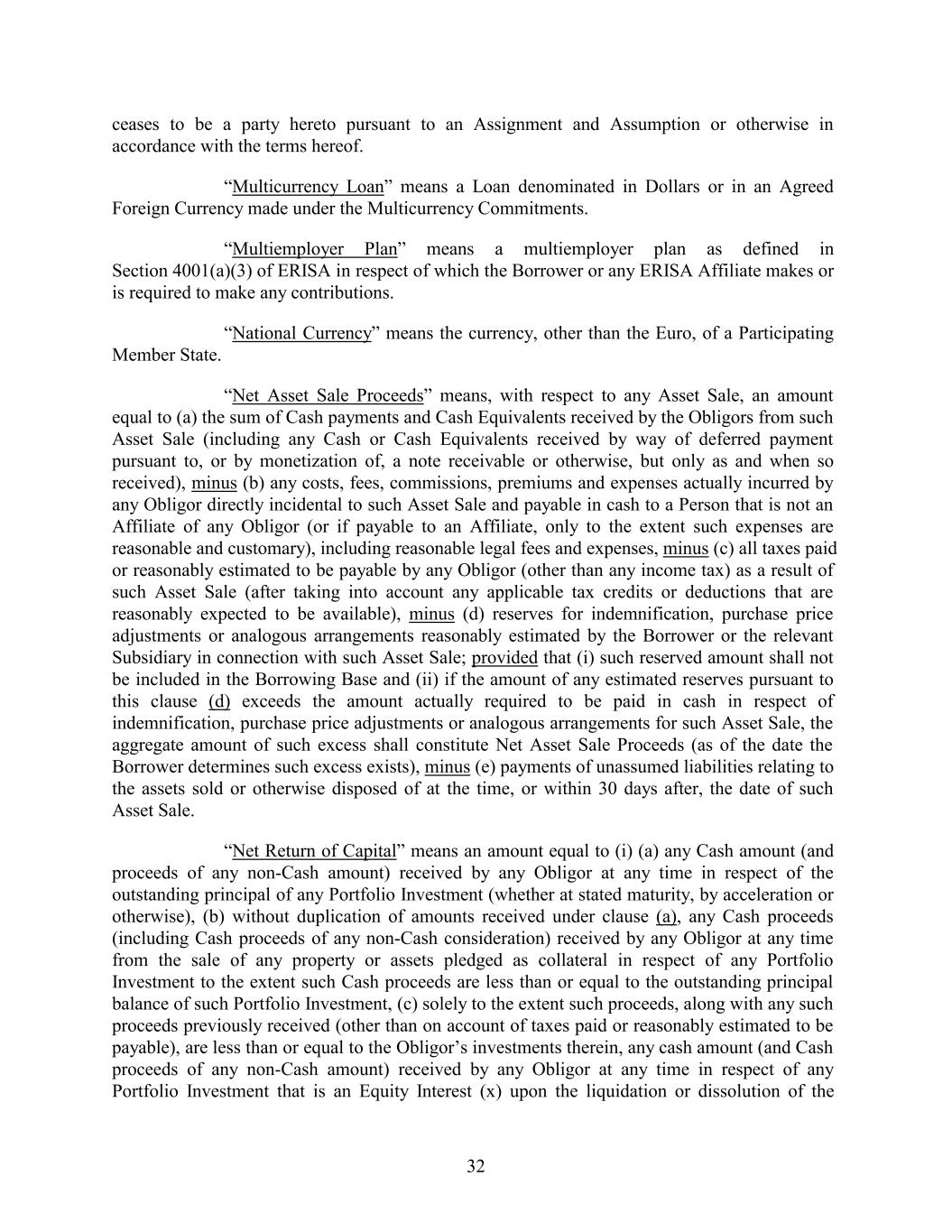 ceases to be a party hereto pursuant to an Assignment and Assumption or otherwise in accordance with the terms hereof. “Multicurrency Loan” means a Loan denominated in Dollars or in an Agreed Foreign Currency made under the Multicurrency Commitments. “Multiemployer Plan” means a multiemployer plan as defined in Section 4001(a)(3) of ERISA in respect of which the Borrower or any ERISA Affiliate makes or is required to make any contributions. “National Currency” means the currency, other than the Euro, of a Participating Member State. “Net Asset Sale Proceeds” means, with respect to any Asset Sale, an amount equal to (a) the sum of Cash payments and Cash Equivalents received by the Obligors from such Asset Sale (including any Cash or Cash Equivalents received by way of deferred payment pursuant to, or by monetization of, a note receivable or otherwise, but only as and when so received), minus (b) any costs, fees, commissions, premiums and expenses actually incurred by any Obligor directly incidental to such Asset Sale and payable in cash to a Person that is not an Affiliate of any Obligor (or if payable to an Affiliate, only to the extent such expenses are reasonable and customary), including reasonable legal fees and expenses, minus (c) all taxes paid or reasonably estimated to be payable by any Obligor (other than any income tax) as a result of such Asset Sale (after taking into account any applicable tax credits or deductions that are reasonably expected to be available), minus (d) reserves for indemnification, purchase price adjustments or analogous arrangements reasonably estimated by the Borrower or the relevant Subsidiary in connection with such Asset Sale; provided that (i) such reserved amount shall not be included in the Borrowing Base and (ii) if the amount of any estimated reserves pursuant to this clause (d) exceeds the amount actually required to be paid in cash in respect of indemnification, purchase price adjustments or analogous arrangements for such Asset Sale, the aggregate amount of such excess shall constitute Net Asset Sale Proceeds (as of the date the Borrower determines such excess exists), minus (e) payments of unassumed liabilities relating to the assets sold or otherwise disposed of at the time, or within 30 days after, the date of such Asset Sale. “Net Return of Capital” means an amount equal to (i) (a) any Cash amount (and proceeds of any non-Cash amount) received by any Obligor at any time in respect of the outstanding principal of any Portfolio Investment (whether at stated maturity, by acceleration or otherwise), (b) without duplication of amounts received under clause (a), any Cash proceeds (including Cash proceeds of any non-Cash consideration) received by any Obligor at any time from the sale of any property or assets pledged as collateral in respect of any Portfolio Investment to the extent such Cash proceeds are less than or equal to the outstanding principal balance of such Portfolio Investment, (c) solely to the extent such proceeds, along with any such proceeds previously received (other than on account of taxes paid or reasonably estimated to be payable), are less than or equal to the Obligor’s investments therein, any cash amount (and Cash proceeds of any non-Cash amount) received by any Obligor at any time in respect of any Portfolio Investment that is an Equity Interest (x) upon the liquidation or dissolution of the 32