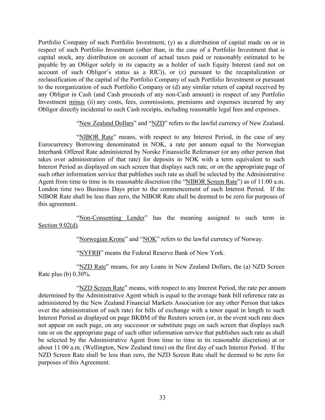 Portfolio Company of such Portfolio Investment, (y) as a distribution of capital made on or in respect of such Portfolio Investment (other than, in the case of a Portfolio Investment that is capital stock, any distribution on account of actual taxes paid or reasonably estimated to be payable by an Obligor solely in its capacity as a holder of such Equity Interest (and not on account of such Obligor’s status as a RIC)), or (z) pursuant to the recapitalization or reclassification of the capital of the Portfolio Company of such Portfolio Investment or pursuant to the reorganization of such Portfolio Company or (d) any similar return of capital received by any Obligor in Cash (and Cash proceeds of any non-Cash amount) in respect of any Portfolio Investment minus (ii) any costs, fees, commissions, premiums and expenses incurred by any Obligor directly incidental to such Cash receipts, including reasonable legal fees and expenses. “New Zealand Dollars” and “NZD” refers to the lawful currency of New Zealand. “NIBOR Rate” means, with respect to any Interest Period, in the case of any Eurocurrency Borrowing denominated in NOK, a rate per annum equal to the Norwegian Interbank Offered Rate administered by Norske Finansielle Referanser (or any other person that takes over administration of that rate) for deposits in NOK with a term equivalent to such Interest Period as displayed on such screen that displays such rate, or on the appropriate page of such other information service that publishes such rate as shall be selected by the Administrative Agent from time to time in its reasonable discretion (the “NIBOR Screen Rate”) as of 11:00 a.m. London time two Business Days prior to the commencement of such Interest Period. If the NIBOR Rate shall be less than zero, the NIBOR Rate shall be deemed to be zero for purposes of this agreement. “Non-Consenting Lender” has the meaning assigned to such term in Section 9.02(d). “Norwegian Krone” and “NOK” refers to the lawful currency of Norway. “NYFRB” means the Federal Reserve Bank of New York. “NZD Rate” means, for any Loans in New Zealand Dollars, the (a) NZD Screen Rate plus (b) 0.30%. “NZD Screen Rate” means, with respect to any Interest Period, the rate per annum determined by the Administrative Agent which is equal to the average bank bill reference rate as administered by the New Zealand Financial Markets Association (or any other Person that takes over the administration of such rate) for bills of exchange with a tenor equal in length to such Interest Period as displayed on page BKBM of the Reuters screen (or, in the event such rate does not appear on such page, on any successor or substitute page on such screen that displays such rate or on the appropriate page of such other information service that publishes such rate as shall be selected by the Administrative Agent from time to time in its reasonable discretion) at or about 11:00 a.m. (Wellington, New Zealand time) on the first day of such Interest Period. If the NZD Screen Rate shall be less than zero, the NZD Screen Rate shall be deemed to be zero for purposes of this Agreement. 33
