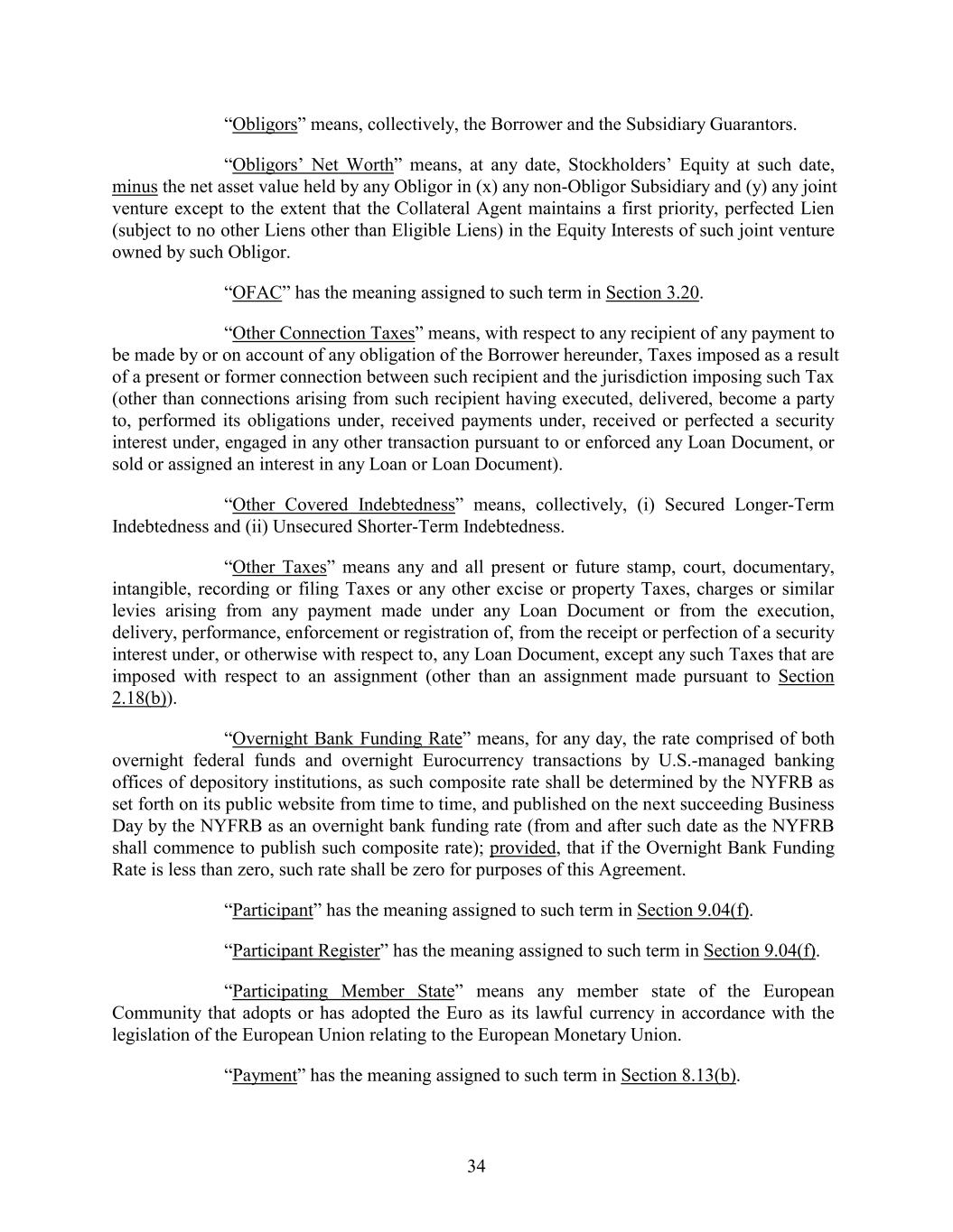 “Obligors” means, collectively, the Borrower and the Subsidiary Guarantors. “Obligors’ Net Worth” means, at any date, Stockholders’ Equity at such date, minus the net asset value held by any Obligor in (x) any non-Obligor Subsidiary and (y) any joint venture except to the extent that the Collateral Agent maintains a first priority, perfected Lien (subject to no other Liens other than Eligible Liens) in the Equity Interests of such joint venture owned by such Obligor. “OFAC” has the meaning assigned to such term in Section 3.20. “Other Connection Taxes” means, with respect to any recipient of any payment to be made by or on account of any obligation of the Borrower hereunder, Taxes imposed as a result of a present or former connection between such recipient and the jurisdiction imposing such Tax (other than connections arising from such recipient having executed, delivered, become a party to, performed its obligations under, received payments under, received or perfected a security interest under, engaged in any other transaction pursuant to or enforced any Loan Document, or sold or assigned an interest in any Loan or Loan Document). “Other Covered Indebtedness” means, collectively, (i) Secured Longer-Term Indebtedness and (ii) Unsecured Shorter-Term Indebtedness. “Other Taxes” means any and all present or future stamp, court, documentary, intangible, recording or filing Taxes or any other excise or property Taxes, charges or similar levies arising from any payment made under any Loan Document or from the execution, delivery, performance, enforcement or registration of, from the receipt or perfection of a security interest under, or otherwise with respect to, any Loan Document, except any such Taxes that are imposed with respect to an assignment (other than an assignment made pursuant to Section 2.18(b)). “Overnight Bank Funding Rate” means, for any day, the rate comprised of both overnight federal funds and overnight Eurocurrency transactions by U.S.-managed banking offices of depository institutions, as such composite rate shall be determined by the NYFRB as set forth on its public website from time to time, and published on the next succeeding Business Day by the NYFRB as an overnight bank funding rate (from and after such date as the NYFRB shall commence to publish such composite rate); provided, that if the Overnight Bank Funding Rate is less than zero, such rate shall be zero for purposes of this Agreement. “Participant” has the meaning assigned to such term in Section 9.04(f). “Participant Register” has the meaning assigned to such term in Section 9.04(f). “Participating Member State” means any member state of the European Community that adopts or has adopted the Euro as its lawful currency in accordance with the legislation of the European Union relating to the European Monetary Union. “Payment” has the meaning assigned to such term in Section 8.13(b). 34