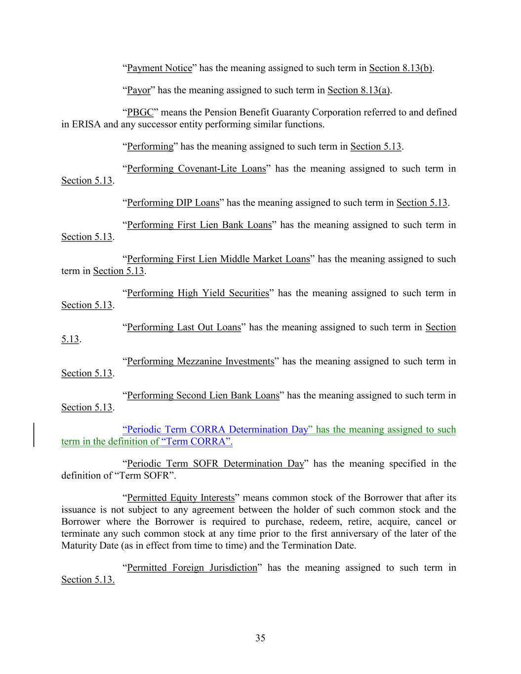 “Payment Notice” has the meaning assigned to such term in Section 8.13(b). “Payor” has the meaning assigned to such term in Section 8.13(a). “PBGC” means the Pension Benefit Guaranty Corporation referred to and defined in ERISA and any successor entity performing similar functions. “Performing” has the meaning assigned to such term in Section 5.13. “Performing Covenant-Lite Loans” has the meaning assigned to such term in Section 5.13. “Performing DIP Loans” has the meaning assigned to such term in Section 5.13. “Performing First Lien Bank Loans” has the meaning assigned to such term in Section 5.13. “Performing First Lien Middle Market Loans” has the meaning assigned to such term in Section 5.13. “Performing High Yield Securities” has the meaning assigned to such term in Section 5.13. “Performing Last Out Loans” has the meaning assigned to such term in Section 5.13. “Performing Mezzanine Investments” has the meaning assigned to such term in Section 5.13. “Performing Second Lien Bank Loans” has the meaning assigned to such term in Section 5.13. “Periodic Term CORRA Determination Day” has the meaning assigned to such term in the definition of “Term CORRA”. “Periodic Term SOFR Determination Day” has the meaning specified in the definition of “Term SOFR”. “Permitted Equity Interests” means common stock of the Borrower that after its issuance is not subject to any agreement between the holder of such common stock and the Borrower where the Borrower is required to purchase, redeem, retire, acquire, cancel or terminate any such common stock at any time prior to the first anniversary of the later of the Maturity Date (as in effect from time to time) and the Termination Date. “Permitted Foreign Jurisdiction” has the meaning assigned to such term in Section 5.13. 35