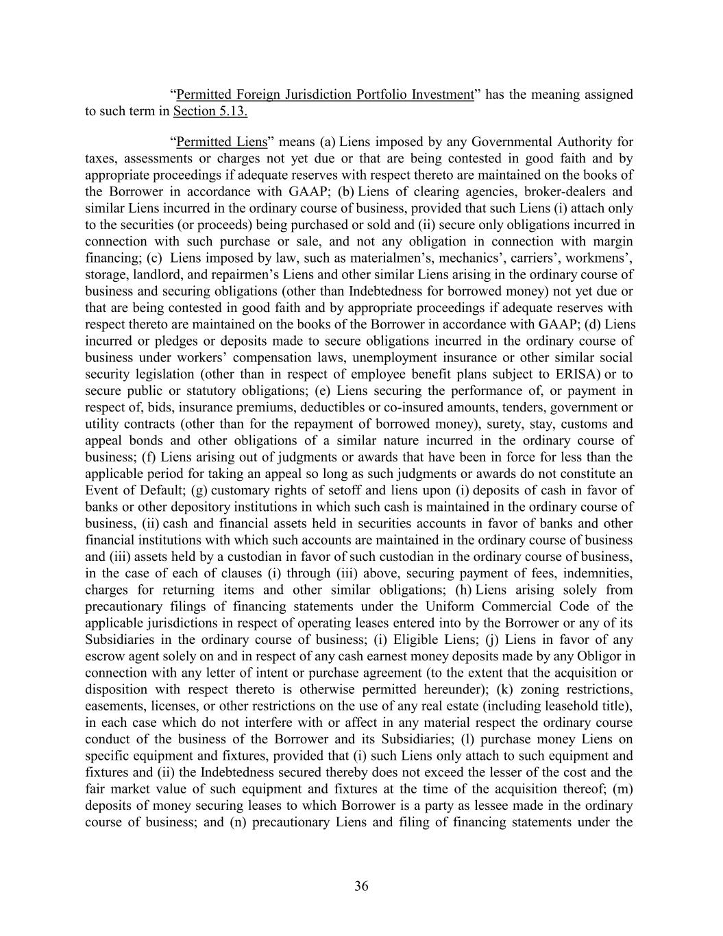 “Permitted Foreign Jurisdiction Portfolio Investment” has the meaning assigned to such term in Section 5.13. “Permitted Liens” means (a) Liens imposed by any Governmental Authority for taxes, assessments or charges not yet due or that are being contested in good faith and by appropriate proceedings if adequate reserves with respect thereto are maintained on the books of the Borrower in accordance with GAAP; (b) Liens of clearing agencies, broker-dealers and similar Liens incurred in the ordinary course of business, provided that such Liens (i) attach only to the securities (or proceeds) being purchased or sold and (ii) secure only obligations incurred in connection with such purchase or sale, and not any obligation in connection with margin financing; (c) Liens imposed by law, such as materialmen’s, mechanics’, carriers’, workmens’, storage, landlord, and repairmen’s Liens and other similar Liens arising in the ordinary course of business and securing obligations (other than Indebtedness for borrowed money) not yet due or that are being contested in good faith and by appropriate proceedings if adequate reserves with respect thereto are maintained on the books of the Borrower in accordance with GAAP; (d) Liens incurred or pledges or deposits made to secure obligations incurred in the ordinary course of business under workers’ compensation laws, unemployment insurance or other similar social security legislation (other than in respect of employee benefit plans subject to ERISA) or to secure public or statutory obligations; (e) Liens securing the performance of, or payment in respect of, bids, insurance premiums, deductibles or co-insured amounts, tenders, government or utility contracts (other than for the repayment of borrowed money), surety, stay, customs and appeal bonds and other obligations of a similar nature incurred in the ordinary course of business; (f) Liens arising out of judgments or awards that have been in force for less than the applicable period for taking an appeal so long as such judgments or awards do not constitute an Event of Default; (g) customary rights of setoff and liens upon (i) deposits of cash in favor of banks or other depository institutions in which such cash is maintained in the ordinary course of business, (ii) cash and financial assets held in securities accounts in favor of banks and other financial institutions with which such accounts are maintained in the ordinary course of business and (iii) assets held by a custodian in favor of such custodian in the ordinary course of business, in the case of each of clauses (i) through (iii) above, securing payment of fees, indemnities, charges for returning items and other similar obligations; (h) Liens arising solely from precautionary filings of financing statements under the Uniform Commercial Code of the applicable jurisdictions in respect of operating leases entered into by the Borrower or any of its Subsidiaries in the ordinary course of business; (i) Eligible Liens; (j) Liens in favor of any escrow agent solely on and in respect of any cash earnest money deposits made by any Obligor in connection with any letter of intent or purchase agreement (to the extent that the acquisition or disposition with respect thereto is otherwise permitted hereunder); (k) zoning restrictions, easements, licenses, or other restrictions on the use of any real estate (including leasehold title), in each case which do not interfere with or affect in any material respect the ordinary course conduct of the business of the Borrower and its Subsidiaries; (l) purchase money Liens on specific equipment and fixtures, provided that (i) such Liens only attach to such equipment and fixtures and (ii) the Indebtedness secured thereby does not exceed the lesser of the cost and the fair market value of such equipment and fixtures at the time of the acquisition thereof; (m) deposits of money securing leases to which Borrower is a party as lessee made in the ordinary course of business; and (n) precautionary Liens and filing of financing statements under the 36