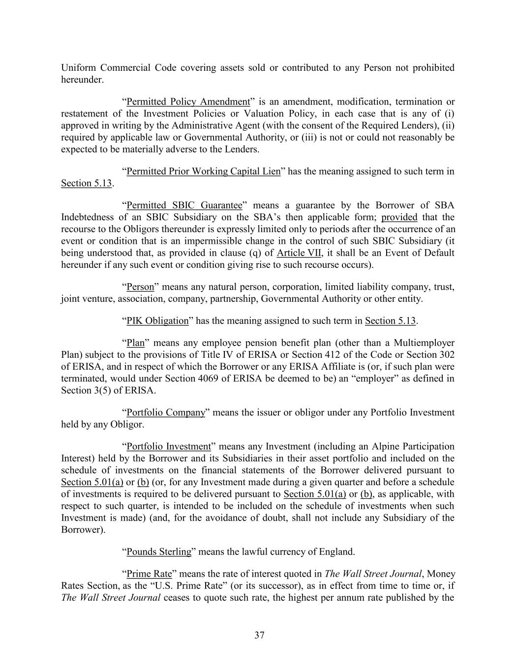 Uniform Commercial Code covering assets sold or contributed to any Person not prohibited hereunder. “Permitted Policy Amendment” is an amendment, modification, termination or restatement of the Investment Policies or Valuation Policy, in each case that is any of (i) approved in writing by the Administrative Agent (with the consent of the Required Lenders), (ii) required by applicable law or Governmental Authority, or (iii) is not or could not reasonably be expected to be materially adverse to the Lenders. “Permitted Prior Working Capital Lien” has the meaning assigned to such term in Section 5.13. “Permitted SBIC Guarantee” means a guarantee by the Borrower of SBA Indebtedness of an SBIC Subsidiary on the SBA’s then applicable form; provided that the recourse to the Obligors thereunder is expressly limited only to periods after the occurrence of an event or condition that is an impermissible change in the control of such SBIC Subsidiary (it being understood that, as provided in clause (q) of Article VII, it shall be an Event of Default hereunder if any such event or condition giving rise to such recourse occurs). “Person” means any natural person, corporation, limited liability company, trust, joint venture, association, company, partnership, Governmental Authority or other entity. “PIK Obligation” has the meaning assigned to such term in Section 5.13. “Plan” means any employee pension benefit plan (other than a Multiemployer Plan) subject to the provisions of Title IV of ERISA or Section 412 of the Code or Section 302 of ERISA, and in respect of which the Borrower or any ERISA Affiliate is (or, if such plan were terminated, would under Section 4069 of ERISA be deemed to be) an “employer” as defined in Section 3(5) of ERISA. “Portfolio Company” means the issuer or obligor under any Portfolio Investment held by any Obligor. “Portfolio Investment” means any Investment (including an Alpine Participation Interest) held by the Borrower and its Subsidiaries in their asset portfolio and included on the schedule of investments on the financial statements of the Borrower delivered pursuant to Section 5.01(a) or (b) (or, for any Investment made during a given quarter and before a schedule of investments is required to be delivered pursuant to Section 5.01(a) or (b), as applicable, with respect to such quarter, is intended to be included on the schedule of investments when such Investment is made) (and, for the avoidance of doubt, shall not include any Subsidiary of the Borrower). “Pounds Sterling” means the lawful currency of England. “Prime Rate” means the rate of interest quoted in The Wall Street Journal, Money Rates Section, as the “U.S. Prime Rate” (or its successor), as in effect from time to time or, if The Wall Street Journal ceases to quote such rate, the highest per annum rate published by the 37