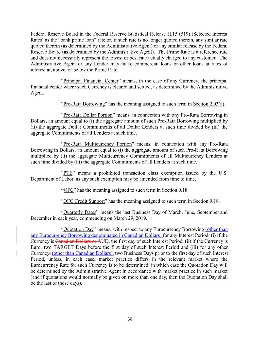 Federal Reserve Board in the Federal Reserve Statistical Release H.15 (519) (Selected Interest Rates) as the “bank prime loan” rate or, if such rate is no longer quoted therein, any similar rate quoted therein (as determined by the Administrative Agent) or any similar release by the Federal Reserve Board (as determined by the Administrative Agent). The Prime Rate is a reference rate and does not necessarily represent the lowest or best rate actually charged to any customer. The Administrative Agent or any Lender may make commercial loans or other loans at rates of interest at, above, or below the Prime Rate. “Principal Financial Center” means, in the case of any Currency, the principal financial center where such Currency is cleared and settled, as determined by the Administrative Agent. “Pro-Rata Borrowing” has the meaning assigned to such term in Section 2.03(a). “Pro-Rata Dollar Portion” means, in connection with any Pro-Rata Borrowing in Dollars, an amount equal to (i) the aggregate amount of such Pro-Rata Borrowing multiplied by (ii) the aggregate Dollar Commitments of all Dollar Lenders at such time divided by (iii) the aggregate Commitments of all Lenders at such time. “Pro-Rata Multicurrency Portion” means, in connection with any Pro-Rata Borrowing in Dollars, an amount equal to (i) the aggregate amount of such Pro-Rata Borrowing multiplied by (ii) the aggregate Multicurrency Commitments of all Multicurrency Lenders at such time divided by (iii) the aggregate Commitments of all Lenders at such time. “PTE” means a prohibited transaction class exemption issued by the U.S. Department of Labor, as any such exemption may be amended from time to time. “QFC” has the meaning assigned to such term in Section 9.18. “QFC Credit Support” has the meaning assigned to such term in Section 9.18. “Quarterly Dates” means the last Business Day of March, June, September and December in each year, commencing on March 29, 2019. “Quotation Day” means, with respect to any Eurocurrency Borrowing (other than any Eurocurrency Borrowing denominated in Canadian Dollars) for any Interest Period, (i) if the Currency is Canadian Dollars or AUD, the first day of such Interest Period, (ii) if the Currency is Euro, two TARGET Days before the first day of such Interest Period and (iii) for any other Currency, (other than Canadian Dollars), two Business Days prior to the first day of such Interest Period, unless, in each case, market practice differs in the relevant market where the Eurocurrency Rate for such Currency is to be determined, in which case the Quotation Day will be determined by the Administrative Agent in accordance with market practice in such market (and if quotations would normally be given on more than one day, then the Quotation Day shall be the last of those days). 38