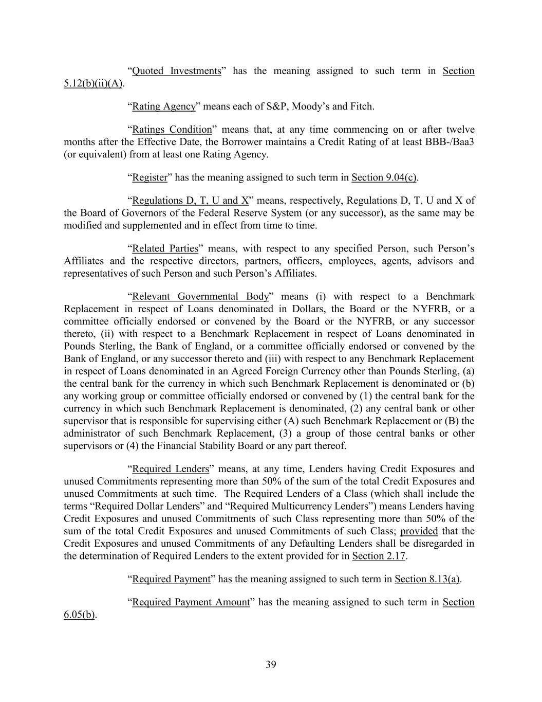 “Quoted Investments” has the meaning assigned to such term in Section 5.12(b)(ii)(A). “Rating Agency” means each of S&P, Moody’s and Fitch. “Ratings Condition” means that, at any time commencing on or after twelve months after the Effective Date, the Borrower maintains a Credit Rating of at least BBB-/Baa3 (or equivalent) from at least one Rating Agency. “Register” has the meaning assigned to such term in Section 9.04(c). “Regulations D, T, U and X” means, respectively, Regulations D, T, U and X of the Board of Governors of the Federal Reserve System (or any successor), as the same may be modified and supplemented and in effect from time to time. “Related Parties” means, with respect to any specified Person, such Person’s Affiliates and the respective directors, partners, officers, employees, agents, advisors and representatives of such Person and such Person’s Affiliates. “Relevant Governmental Body” means (i) with respect to a Benchmark Replacement in respect of Loans denominated in Dollars, the Board or the NYFRB, or a committee officially endorsed or convened by the Board or the NYFRB, or any successor thereto, (ii) with respect to a Benchmark Replacement in respect of Loans denominated in Pounds Sterling, the Bank of England, or a committee officially endorsed or convened by the Bank of England, or any successor thereto and (iii) with respect to any Benchmark Replacement in respect of Loans denominated in an Agreed Foreign Currency other than Pounds Sterling, (a) the central bank for the currency in which such Benchmark Replacement is denominated or (b) any working group or committee officially endorsed or convened by (1) the central bank for the currency in which such Benchmark Replacement is denominated, (2) any central bank or other supervisor that is responsible for supervising either (A) such Benchmark Replacement or (B) the administrator of such Benchmark Replacement, (3) a group of those central banks or other supervisors or (4) the Financial Stability Board or any part thereof. “Required Lenders” means, at any time, Lenders having Credit Exposures and unused Commitments representing more than 50% of the sum of the total Credit Exposures and unused Commitments at such time. The Required Lenders of a Class (which shall include the terms “Required Dollar Lenders” and “Required Multicurrency Lenders”) means Lenders having Credit Exposures and unused Commitments of such Class representing more than 50% of the sum of the total Credit Exposures and unused Commitments of such Class; provided that the Credit Exposures and unused Commitments of any Defaulting Lenders shall be disregarded in the determination of Required Lenders to the extent provided for in Section 2.17. “Required Payment” has the meaning assigned to such term in Section 8.13(a). “Required Payment Amount” has the meaning assigned to such term in Section 6.05(b). 39