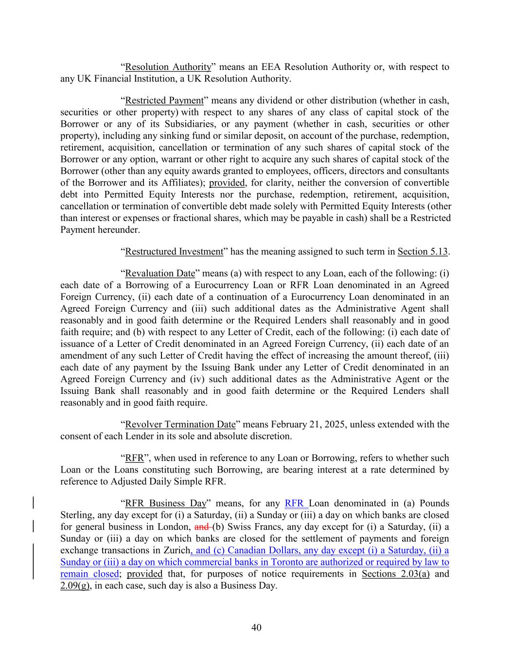 “Resolution Authority” means an EEA Resolution Authority or, with respect to any UK Financial Institution, a UK Resolution Authority. “Restricted Payment” means any dividend or other distribution (whether in cash, securities or other property) with respect to any shares of any class of capital stock of the Borrower or any of its Subsidiaries, or any payment (whether in cash, securities or other property), including any sinking fund or similar deposit, on account of the purchase, redemption, retirement, acquisition, cancellation or termination of any such shares of capital stock of the Borrower or any option, warrant or other right to acquire any such shares of capital stock of the Borrower (other than any equity awards granted to employees, officers, directors and consultants of the Borrower and its Affiliates); provided, for clarity, neither the conversion of convertible debt into Permitted Equity Interests nor the purchase, redemption, retirement, acquisition, cancellation or termination of convertible debt made solely with Permitted Equity Interests (other than interest or expenses or fractional shares, which may be payable in cash) shall be a Restricted Payment hereunder. “Restructured Investment” has the meaning assigned to such term in Section 5.13. “Revaluation Date” means (a) with respect to any Loan, each of the following: (i) each date of a Borrowing of a Eurocurrency Loan or RFR Loan denominated in an Agreed Foreign Currency, (ii) each date of a continuation of a Eurocurrency Loan denominated in an Agreed Foreign Currency and (iii) such additional dates as the Administrative Agent shall reasonably and in good faith determine or the Required Lenders shall reasonably and in good faith require; and (b) with respect to any Letter of Credit, each of the following: (i) each date of issuance of a Letter of Credit denominated in an Agreed Foreign Currency, (ii) each date of an amendment of any such Letter of Credit having the effect of increasing the amount thereof, (iii) each date of any payment by the Issuing Bank under any Letter of Credit denominated in an Agreed Foreign Currency and (iv) such additional dates as the Administrative Agent or the Issuing Bank shall reasonably and in good faith determine or the Required Lenders shall reasonably and in good faith require. “Revolver Termination Date” means February 21, 2025, unless extended with the consent of each Lender in its sole and absolute discretion. “RFR”, when used in reference to any Loan or Borrowing, refers to whether such Loan or the Loans constituting such Borrowing, are bearing interest at a rate determined by reference to Adjusted Daily Simple RFR. “RFR Business Day” means, for any RFR Loan denominated in (a) Pounds Sterling, any day except for (i) a Saturday, (ii) a Sunday or (iii) a day on which banks are closed for general business in London, and (b) Swiss Francs, any day except for (i) a Saturday, (ii) a Sunday or (iii) a day on which banks are closed for the settlement of payments and foreign exchange transactions in Zurich, and (c) Canadian Dollars, any day except (i) a Saturday, (ii) a Sunday or (iii) a day on which commercial banks in Toronto are authorized or required by law to remain closed; provided that, for purposes of notice requirements in Sections 2.03(a) and 2.09(g), in each case, such day is also a Business Day. 40