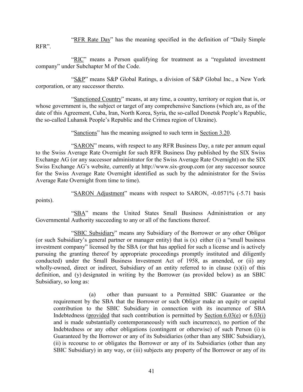 “RFR Rate Day” has the meaning specified in the definition of “Daily Simple RFR”. “RIC” means a Person qualifying for treatment as a “regulated investment company” under Subchapter M of the Code. “S&P” means S&P Global Ratings, a division of S&P Global Inc., a New York corporation, or any successor thereto. “Sanctioned Country” means, at any time, a country, territory or region that is, or whose government is, the subject or target of any comprehensive Sanctions (which are, as of the date of this Agreement, Cuba, Iran, North Korea, Syria, the so-called Donetsk People’s Republic, the so-called Luhansk People’s Republic and the Crimea region of Ukraine). “Sanctions” has the meaning assigned to such term in Section 3.20. “SARON” means, with respect to any RFR Business Day, a rate per annum equal to the Swiss Average Rate Overnight for such RFR Business Day published by the SIX Swiss Exchange AG (or any successor administrator for the Swiss Average Rate Overnight) on the SIX Swiss Exchange AG’s website, currently at http://www.six-group.com (or any successor source for the Swiss Average Rate Overnight identified as such by the administrator for the Swiss Average Rate Overnight from time to time). “SARON Adjustment” means with respect to SARON, -0.0571% (-5.71 basis points). “SBA” means the United States Small Business Administration or any Governmental Authority succeeding to any or all of the functions thereof. “SBIC Subsidiary” means any Subsidiary of the Borrower or any other Obligor (or such Subsidiary’s general partner or manager entity) that is (x) either (i) a “small business investment company” licensed by the SBA (or that has applied for such a license and is actively pursuing the granting thereof by appropriate proceedings promptly instituted and diligently conducted) under the Small Business Investment Act of 1958, as amended, or (ii) any wholly-owned, direct or indirect, Subsidiary of an entity referred to in clause (x)(i) of this definition, and (y) designated in writing by the Borrower (as provided below) as an SBIC Subsidiary, so long as: (a) other than pursuant to a Permitted SBIC Guarantee or the requirement by the SBA that the Borrower or such Obligor make an equity or capital contribution to the SBIC Subsidiary in connection with its incurrence of SBA Indebtedness (provided that such contribution is permitted by Section 6.03(e) or 6.03(i) and is made substantially contemporaneously with such incurrence), no portion of the Indebtedness or any other obligations (contingent or otherwise) of such Person (i) is Guaranteed by the Borrower or any of its Subsidiaries (other than any SBIC Subsidiary), (ii) is recourse to or obligates the Borrower or any of its Subsidiaries (other than any SBIC Subsidiary) in any way, or (iii) subjects any property of the Borrower or any of its 41