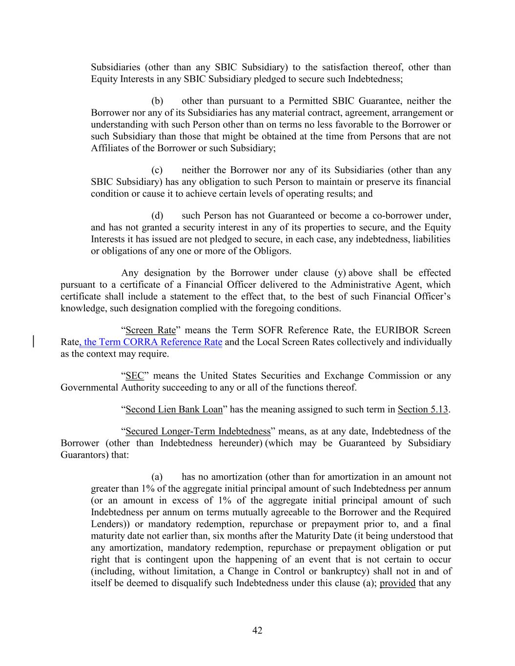 Subsidiaries (other than any SBIC Subsidiary) to the satisfaction thereof, other than Equity Interests in any SBIC Subsidiary pledged to secure such Indebtedness; (b) other than pursuant to a Permitted SBIC Guarantee, neither the Borrower nor any of its Subsidiaries has any material contract, agreement, arrangement or understanding with such Person other than on terms no less favorable to the Borrower or such Subsidiary than those that might be obtained at the time from Persons that are not Affiliates of the Borrower or such Subsidiary; (c) neither the Borrower nor any of its Subsidiaries (other than any SBIC Subsidiary) has any obligation to such Person to maintain or preserve its financial condition or cause it to achieve certain levels of operating results; and (d) such Person has not Guaranteed or become a co-borrower under, and has not granted a security interest in any of its properties to secure, and the Equity Interests it has issued are not pledged to secure, in each case, any indebtedness, liabilities or obligations of any one or more of the Obligors. Any designation by the Borrower under clause (y) above shall be effected pursuant to a certificate of a Financial Officer delivered to the Administrative Agent, which certificate shall include a statement to the effect that, to the best of such Financial Officer’s knowledge, such designation complied with the foregoing conditions. “Screen Rate” means the Term SOFR Reference Rate, the EURIBOR Screen Rate, the Term CORRA Reference Rate and the Local Screen Rates collectively and individually as the context may require. “SEC” means the United States Securities and Exchange Commission or any Governmental Authority succeeding to any or all of the functions thereof. “Second Lien Bank Loan” has the meaning assigned to such term in Section 5.13. “Secured Longer-Term Indebtedness” means, as at any date, Indebtedness of the Borrower (other than Indebtedness hereunder) (which may be Guaranteed by Subsidiary Guarantors) that: (a) has no amortization (other than for amortization in an amount not greater than 1% of the aggregate initial principal amount of such Indebtedness per annum (or an amount in excess of 1% of the aggregate initial principal amount of such Indebtedness per annum on terms mutually agreeable to the Borrower and the Required Lenders)) or mandatory redemption, repurchase or prepayment prior to, and a final maturity date not earlier than, six months after the Maturity Date (it being understood that any amortization, mandatory redemption, repurchase or prepayment obligation or put right that is contingent upon the happening of an event that is not certain to occur (including, without limitation, a Change in Control or bankruptcy) shall not in and of itself be deemed to disqualify such Indebtedness under this clause (a); provided that any 42
