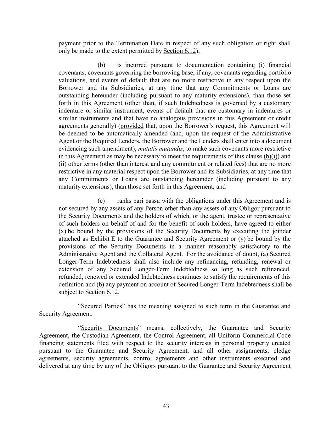 payment prior to the Termination Date in respect of any such obligation or right shall only be made to the extent permitted by Section 6.12); (b) is incurred pursuant to documentation containing (i) financial covenants, covenants governing the borrowing base, if any, covenants regarding portfolio valuations, and events of default that are no more restrictive in any respect upon the Borrower and its Subsidiaries, at any time that any Commitments or Loans are outstanding hereunder (including pursuant to any maturity extensions), than those set forth in this Agreement (other than, if such Indebtedness is governed by a customary indenture or similar instrument, events of default that are customary in indentures or similar instruments and that have no analogous provisions in this Agreement or credit agreements generally) (provided that, upon the Borrower’s request, this Agreement will be deemed to be automatically amended (and, upon the request of the Administrative Agent or the Required Lenders, the Borrower and the Lenders shall enter into a document evidencing such amendment), mutatis mutandis, to make such covenants more restrictive in this Agreement as may be necessary to meet the requirements of this clause (b)(i)) and (ii) other terms (other than interest and any commitment or related fees) that are no more restrictive in any material respect upon the Borrower and its Subsidiaries, at any time that any Commitments or Loans are outstanding hereunder (including pursuant to any maturity extensions), than those set forth in this Agreement; and (c) ranks pari passu with the obligations under this Agreement and is not secured by any assets of any Person other than any assets of any Obligor pursuant to the Security Documents and the holders of which, or the agent, trustee or representative of such holders on behalf of and for the benefit of such holders, have agreed to either (x) be bound by the provisions of the Security Documents by executing the joinder attached as Exhibit E to the Guarantee and Security Agreement or (y) be bound by the provisions of the Security Documents in a manner reasonably satisfactory to the Administrative Agent and the Collateral Agent. For the avoidance of doubt, (a) Secured Longer-Term Indebtedness shall also include any refinancing, refunding, renewal or extension of any Secured Longer-Term Indebtedness so long as such refinanced, refunded, renewed or extended Indebtedness continues to satisfy the requirements of this definition and (b) any payment on account of Secured Longer-Term Indebtedness shall be subject to Section 6.12. “Secured Parties” has the meaning assigned to such term in the Guarantee and Security Agreement. “Security Documents” means, collectively, the Guarantee and Security Agreement, the Custodian Agreement, the Control Agreement, all Uniform Commercial Code financing statements filed with respect to the security interests in personal property created pursuant to the Guarantee and Security Agreement, and all other assignments, pledge agreements, security agreements, control agreements and other instruments executed and delivered at any time by any of the Obligors pursuant to the Guarantee and Security Agreement 43