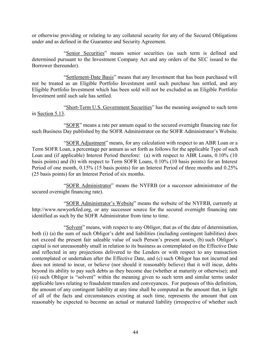 or otherwise providing or relating to any collateral security for any of the Secured Obligations under and as defined in the Guarantee and Security Agreement. “Senior Securities” means senior securities (as such term is defined and determined pursuant to the Investment Company Act and any orders of the SEC issued to the Borrower thereunder). “Settlement-Date Basis” means that any Investment that has been purchased will not be treated as an Eligible Portfolio Investment until such purchase has settled, and any Eligible Portfolio Investment which has been sold will not be excluded as an Eligible Portfolio Investment until such sale has settled. “Short-Term U.S. Government Securities” has the meaning assigned to such term in Section 5.13. “SOFR” means a rate per annum equal to the secured overnight financing rate for such Business Day published by the SOFR Administrator on the SOFR Administrator’s Website. “SOFR Adjustment” means, for any calculation with respect to an ABR Loan or a Term SOFR Loan, a percentage per annum as set forth as follows for the applicable Type of such Loan and (if applicable) Interest Period therefore: (a) with respect to ABR Loans, 0.10% (10 basis points) and (b) with respect to Term SOFR Loans, 0.10% (10 basis points) for an Interest Period of one month, 0.15% (15 basis points) for an Interest Period of three months and 0.25% (25 basis points) for an Interest Period of six months. “SOFR Administrator” means the NYFRB (or a successor administrator of the secured overnight financing rate). “SOFR Administrator’s Website” means the website of the NYFRB, currently at http://www.newyorkfed.org, or any successor source for the secured overnight financing rate identified as such by the SOFR Administrator from time to time. “Solvent” means, with respect to any Obligor, that as of the date of determination, both (i) (a) the sum of such Obligor’s debt and liabilities (including contingent liabilities) does not exceed the present fair saleable value of such Person’s present assets, (b) such Obligor’s capital is not unreasonably small in relation to its business as contemplated on the Effective Date and reflected in any projections delivered to the Lenders or with respect to any transaction contemplated or undertaken after the Effective Date, and (c) such Obligor has not incurred and does not intend to incur, or believe (nor should it reasonably believe) that it will incur, debts beyond its ability to pay such debts as they become due (whether at maturity or otherwise); and (ii) such Obligor is “solvent” within the meaning given to such term and similar terms under applicable laws relating to fraudulent transfers and conveyances. For purposes of this definition, the amount of any contingent liability at any time shall be computed as the amount that, in light of all of the facts and circumstances existing at such time, represents the amount that can reasonably be expected to become an actual or matured liability (irrespective of whether such 44