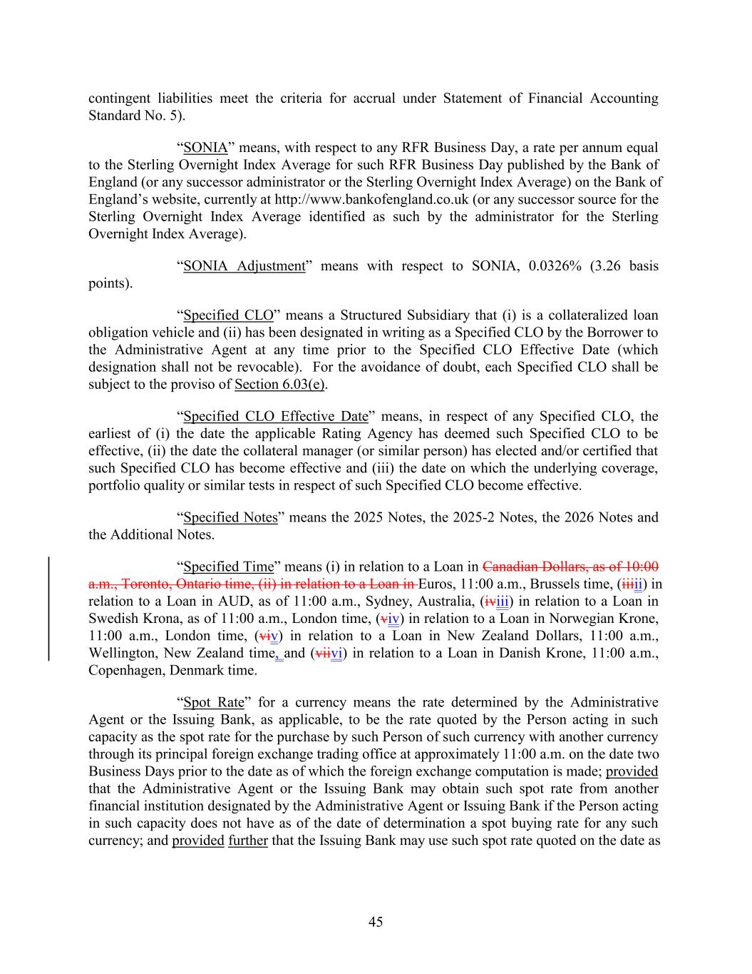contingent liabilities meet the criteria for accrual under Statement of Financial Accounting Standard No. 5). “SONIA” means, with respect to any RFR Business Day, a rate per annum equal to the Sterling Overnight Index Average for such RFR Business Day published by the Bank of England (or any successor administrator or the Sterling Overnight Index Average) on the Bank of England’s website, currently at http://www.bankofengland.co.uk (or any successor source for the Sterling Overnight Index Average identified as such by the administrator for the Sterling Overnight Index Average). “SONIA Adjustment” means with respect to SONIA, 0.0326% (3.26 basis points). “Specified CLO” means a Structured Subsidiary that (i) is a collateralized loan obligation vehicle and (ii) has been designated in writing as a Specified CLO by the Borrower to the Administrative Agent at any time prior to the Specified CLO Effective Date (which designation shall not be revocable). For the avoidance of doubt, each Specified CLO shall be subject to the proviso of Section 6.03(e). “Specified CLO Effective Date” means, in respect of any Specified CLO, the earliest of (i) the date the applicable Rating Agency has deemed such Specified CLO to be effective, (ii) the date the collateral manager (or similar person) has elected and/or certified that such Specified CLO has become effective and (iii) the date on which the underlying coverage, portfolio quality or similar tests in respect of such Specified CLO become effective. “Specified Notes” means the 2025 Notes, the 2025-2 Notes, the 2026 Notes and the Additional Notes. “Specified Time” means (i) in relation to a Loan in Canadian Dollars, as of 10:00 a.m., Toronto, Ontario time, (ii) in relation to a Loan in Euros, 11:00 a.m., Brussels time, (iiiii) in relation to a Loan in AUD, as of 11:00 a.m., Sydney, Australia, (iviii) in relation to a Loan in Swedish Krona, as of 11:00 a.m., London time, (viv) in relation to a Loan in Norwegian Krone, 11:00 a.m., London time, (viv) in relation to a Loan in New Zealand Dollars, 11:00 a.m., Wellington, New Zealand time, and (viivi) in relation to a Loan in Danish Krone, 11:00 a.m., Copenhagen, Denmark time. “Spot Rate” for a currency means the rate determined by the Administrative Agent or the Issuing Bank, as applicable, to be the rate quoted by the Person acting in such capacity as the spot rate for the purchase by such Person of such currency with another currency through its principal foreign exchange trading office at approximately 11:00 a.m. on the date two Business Days prior to the date as of which the foreign exchange computation is made; provided that the Administrative Agent or the Issuing Bank may obtain such spot rate from another financial institution designated by the Administrative Agent or Issuing Bank if the Person acting in such capacity does not have as of the date of determination a spot buying rate for any such currency; and provided further that the Issuing Bank may use such spot rate quoted on the date as 45