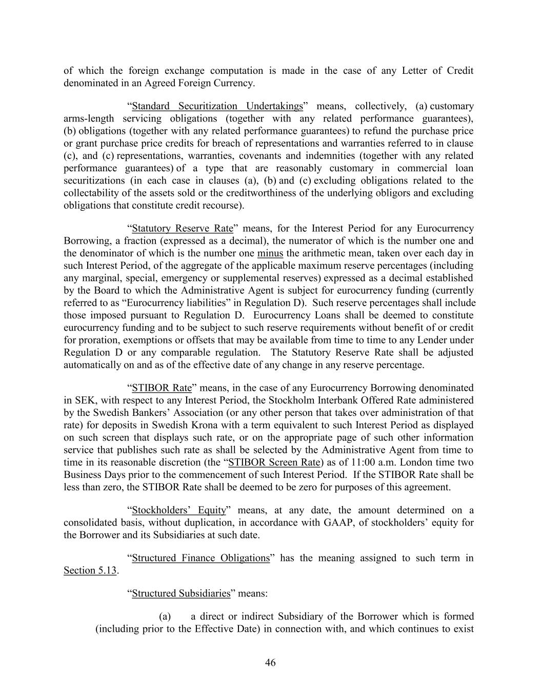 of which the foreign exchange computation is made in the case of any Letter of Credit denominated in an Agreed Foreign Currency. “Standard Securitization Undertakings” means, collectively, (a) customary arms-length servicing obligations (together with any related performance guarantees), (b) obligations (together with any related performance guarantees) to refund the purchase price or grant purchase price credits for breach of representations and warranties referred to in clause (c), and (c) representations, warranties, covenants and indemnities (together with any related performance guarantees) of a type that are reasonably customary in commercial loan securitizations (in each case in clauses (a), (b) and (c) excluding obligations related to the collectability of the assets sold or the creditworthiness of the underlying obligors and excluding obligations that constitute credit recourse). “Statutory Reserve Rate” means, for the Interest Period for any Eurocurrency Borrowing, a fraction (expressed as a decimal), the numerator of which is the number one and the denominator of which is the number one minus the arithmetic mean, taken over each day in such Interest Period, of the aggregate of the applicable maximum reserve percentages (including any marginal, special, emergency or supplemental reserves) expressed as a decimal established by the Board to which the Administrative Agent is subject for eurocurrency funding (currently referred to as “Eurocurrency liabilities” in Regulation D). Such reserve percentages shall include those imposed pursuant to Regulation D. Eurocurrency Loans shall be deemed to constitute eurocurrency funding and to be subject to such reserve requirements without benefit of or credit for proration, exemptions or offsets that may be available from time to time to any Lender under Regulation D or any comparable regulation. The Statutory Reserve Rate shall be adjusted automatically on and as of the effective date of any change in any reserve percentage. “STIBOR Rate” means, in the case of any Eurocurrency Borrowing denominated in SEK, with respect to any Interest Period, the Stockholm Interbank Offered Rate administered by the Swedish Bankers’ Association (or any other person that takes over administration of that rate) for deposits in Swedish Krona with a term equivalent to such Interest Period as displayed on such screen that displays such rate, or on the appropriate page of such other information service that publishes such rate as shall be selected by the Administrative Agent from time to time in its reasonable discretion (the “STIBOR Screen Rate) as of 11:00 a.m. London time two Business Days prior to the commencement of such Interest Period. If the STIBOR Rate shall be less than zero, the STIBOR Rate shall be deemed to be zero for purposes of this agreement. “Stockholders’ Equity” means, at any date, the amount determined on a consolidated basis, without duplication, in accordance with GAAP, of stockholders’ equity for the Borrower and its Subsidiaries at such date. “Structured Finance Obligations” has the meaning assigned to such term in Section 5.13. “Structured Subsidiaries” means: (a) a direct or indirect Subsidiary of the Borrower which is formed (including prior to the Effective Date) in connection with, and which continues to exist 46
