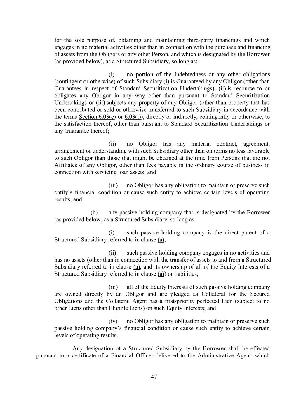 for the sole purpose of, obtaining and maintaining third-party financings and which engages in no material activities other than in connection with the purchase and financing of assets from the Obligors or any other Person, and which is designated by the Borrower (as provided below), as a Structured Subsidiary, so long as: (i) no portion of the Indebtedness or any other obligations (contingent or otherwise) of such Subsidiary (i) is Guaranteed by any Obligor (other than Guarantees in respect of Standard Securitization Undertakings), (ii) is recourse to or obligates any Obligor in any way other than pursuant to Standard Securitization Undertakings or (iii) subjects any property of any Obligor (other than property that has been contributed or sold or otherwise transferred to such Subsidiary in accordance with the terms Section 6.03(e) or 6.03(i)), directly or indirectly, contingently or otherwise, to the satisfaction thereof, other than pursuant to Standard Securitization Undertakings or any Guarantee thereof; (ii) no Obligor has any material contract, agreement, arrangement or understanding with such Subsidiary other than on terms no less favorable to such Obligor than those that might be obtained at the time from Persons that are not Affiliates of any Obligor, other than fees payable in the ordinary course of business in connection with servicing loan assets; and (iii) no Obligor has any obligation to maintain or preserve such entity’s financial condition or cause such entity to achieve certain levels of operating results; and (b) any passive holding company that is designated by the Borrower (as provided below) as a Structured Subsidiary, so long as: (i) such passive holding company is the direct parent of a Structured Subsidiary referred to in clause (a); (ii) such passive holding company engages in no activities and has no assets (other than in connection with the transfer of assets to and from a Structured Subsidiary referred to in clause (a), and its ownership of all of the Equity Interests of a Structured Subsidiary referred to in clause (a)) or liabilities; (iii) all of the Equity Interests of such passive holding company are owned directly by an Obligor and are pledged as Collateral for the Secured Obligations and the Collateral Agent has a first-priority perfected Lien (subject to no other Liens other than Eligible Liens) on such Equity Interests; and (iv) no Obligor has any obligation to maintain or preserve such passive holding company’s financial condition or cause such entity to achieve certain levels of operating results. Any designation of a Structured Subsidiary by the Borrower shall be effected pursuant to a certificate of a Financial Officer delivered to the Administrative Agent, which 47