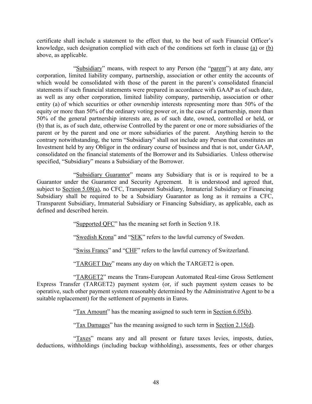 certificate shall include a statement to the effect that, to the best of such Financial Officer’s knowledge, such designation complied with each of the conditions set forth in clause (a) or (b) above, as applicable. “Subsidiary” means, with respect to any Person (the “parent”) at any date, any corporation, limited liability company, partnership, association or other entity the accounts of which would be consolidated with those of the parent in the parent’s consolidated financial statements if such financial statements were prepared in accordance with GAAP as of such date, as well as any other corporation, limited liability company, partnership, association or other entity (a) of which securities or other ownership interests representing more than 50% of the equity or more than 50% of the ordinary voting power or, in the case of a partnership, more than 50% of the general partnership interests are, as of such date, owned, controlled or held, or (b) that is, as of such date, otherwise Controlled by the parent or one or more subsidiaries of the parent or by the parent and one or more subsidiaries of the parent. Anything herein to the contrary notwithstanding, the term “Subsidiary” shall not include any Person that constitutes an Investment held by any Obligor in the ordinary course of business and that is not, under GAAP, consolidated on the financial statements of the Borrower and its Subsidiaries. Unless otherwise specified, “Subsidiary” means a Subsidiary of the Borrower. “Subsidiary Guarantor” means any Subsidiary that is or is required to be a Guarantor under the Guarantee and Security Agreement. It is understood and agreed that, subject to Section 5.08(a), no CFC, Transparent Subsidiary, Immaterial Subsidiary or Financing Subsidiary shall be required to be a Subsidiary Guarantor as long as it remains a CFC, Transparent Subsidiary, Immaterial Subsidiary or Financing Subsidiary, as applicable, each as defined and described herein. “Supported QFC” has the meaning set forth in Section 9.18. “Swedish Krona” and “SEK” refers to the lawful currency of Sweden. “Swiss Francs” and “CHF” refers to the lawful currency of Switzerland. “TARGET Day” means any day on which the TARGET2 is open. “TARGET2” means the Trans-European Automated Real-time Gross Settlement Express Transfer (TARGET2) payment system (or, if such payment system ceases to be operative, such other payment system reasonably determined by the Administrative Agent to be a suitable replacement) for the settlement of payments in Euros. “Tax Amount” has the meaning assigned to such term in Section 6.05(b). “Tax Damages” has the meaning assigned to such term in Section 2.15(d). “Taxes” means any and all present or future taxes levies, imposts, duties, deductions, withholdings (including backup withholding), assessments, fees or other charges 48