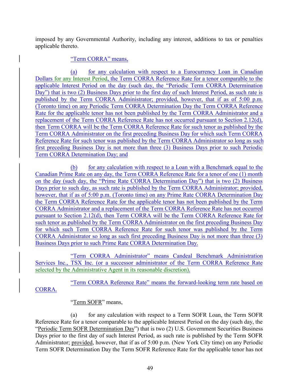 imposed by any Governmental Authority, including any interest, additions to tax or penalties applicable thereto. “Term CORRA” means, (a) for any calculation with respect to a Eurocurrency Loan in Canadian Dollars for any Interest Period, the Term CORRA Reference Rate for a tenor comparable to the applicable Interest Period on the day (such day, the “Periodic Term CORRA Determination Day”) that is two (2) Business Days prior to the first day of such Interest Period, as such rate is published by the Term CORRA Administrator; provided, however, that if as of 5:00 p.m. (Toronto time) on any Periodic Term CORRA Determination Day the Term CORRA Reference Rate for the applicable tenor has not been published by the Term CORRA Administrator and a replacement of the Term CORRA Reference Rate has not occurred pursuant to Section 2.12(d), then Term CORRA will be the Term CORRA Reference Rate for such tenor as published by the Term CORRA Administrator on the first preceding Business Day for which such Term CORRA Reference Rate for such tenor was published by the Term CORRA Administrator so long as such first preceding Business Day is not more than three (3) Business Days prior to such Periodic Term CORRA Determination Day; and (b) for any calculation with respect to a Loan with a Benchmark equal to the Canadian Prime Rate on any day, the Term CORRA Reference Rate for a tenor of one (1) month on the day (such day, the “Prime Rate CORRA Determination Day”) that is two (2) Business Days prior to such day, as such rate is published by the Term CORRA Administrator; provided, however, that if as of 5:00 p.m. (Toronto time) on any Prime Rate CORRA Determination Day the Term CORRA Reference Rate for the applicable tenor has not been published by the Term CORRA Administrator and a replacement of the Term CORRA Reference Rate has not occurred pursuant to Section 2.12(d), then Term CORRA will be the Term CORRA Reference Rate for such tenor as published by the Term CORRA Administrator on the first preceding Business Day for which such Term CORRA Reference Rate for such tenor was published by the Term CORRA Administrator so long as such first preceding Business Day is not more than three (3) Business Days prior to such Prime Rate CORRA Determination Day. “Term CORRA Administrator” means Candeal Benchmark Administration Services Inc., TSX Inc. (or a successor administrator of the Term CORRA Reference Rate selected by the Administrative Agent in its reasonable discretion). “Term CORRA Reference Rate” means the forward-looking term rate based on CORRA. “Term SOFR” means, (a) for any calculation with respect to a Term SOFR Loan, the Term SOFR Reference Rate for a tenor comparable to the applicable Interest Period on the day (such day, the “Periodic Term SOFR Determination Day”) that is two (2) U.S. Government Securities Business Days prior to the first day of such Interest Period, as such rate is published by the Term SOFR Administrator; provided, however, that if as of 5:00 p.m. (New York City time) on any Periodic Term SOFR Determination Day the Term SOFR Reference Rate for the applicable tenor has not 49