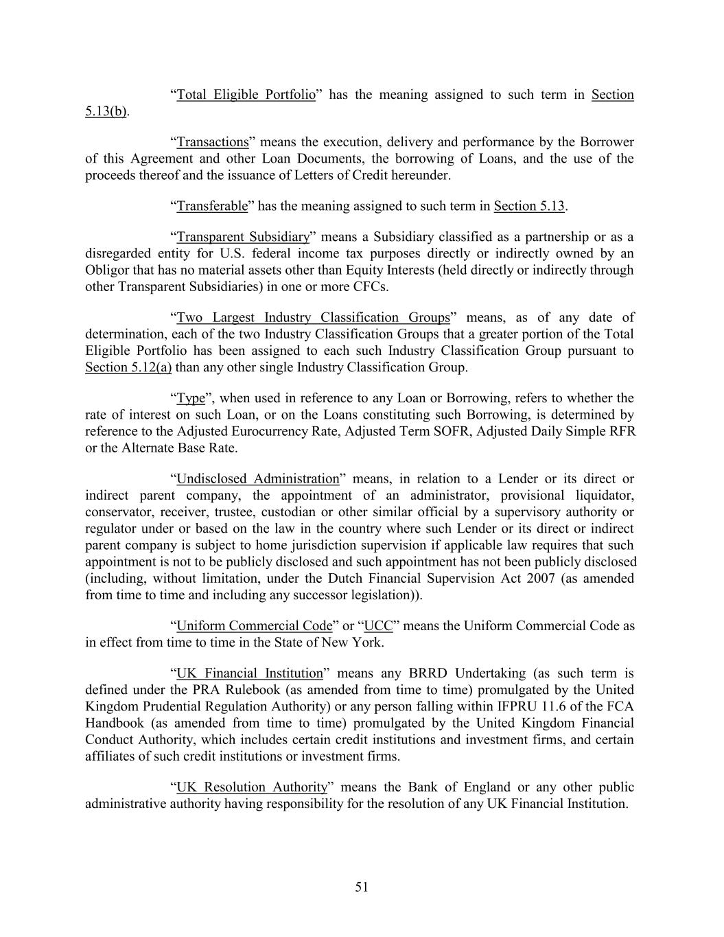 “Total Eligible Portfolio” has the meaning assigned to such term in Section 5.13(b). “Transactions” means the execution, delivery and performance by the Borrower of this Agreement and other Loan Documents, the borrowing of Loans, and the use of the proceeds thereof and the issuance of Letters of Credit hereunder. “Transferable” has the meaning assigned to such term in Section 5.13. “Transparent Subsidiary” means a Subsidiary classified as a partnership or as a disregarded entity for U.S. federal income tax purposes directly or indirectly owned by an Obligor that has no material assets other than Equity Interests (held directly or indirectly through other Transparent Subsidiaries) in one or more CFCs. “Two Largest Industry Classification Groups” means, as of any date of determination, each of the two Industry Classification Groups that a greater portion of the Total Eligible Portfolio has been assigned to each such Industry Classification Group pursuant to Section 5.12(a) than any other single Industry Classification Group. “Type”, when used in reference to any Loan or Borrowing, refers to whether the rate of interest on such Loan, or on the Loans constituting such Borrowing, is determined by reference to the Adjusted Eurocurrency Rate, Adjusted Term SOFR, Adjusted Daily Simple RFR or the Alternate Base Rate. “Undisclosed Administration” means, in relation to a Lender or its direct or indirect parent company, the appointment of an administrator, provisional liquidator, conservator, receiver, trustee, custodian or other similar official by a supervisory authority or regulator under or based on the law in the country where such Lender or its direct or indirect parent company is subject to home jurisdiction supervision if applicable law requires that such appointment is not to be publicly disclosed and such appointment has not been publicly disclosed (including, without limitation, under the Dutch Financial Supervision Act 2007 (as amended from time to time and including any successor legislation)). “Uniform Commercial Code” or “UCC” means the Uniform Commercial Code as in effect from time to time in the State of New York. “UK Financial Institution” means any BRRD Undertaking (as such term is defined under the PRA Rulebook (as amended from time to time) promulgated by the United Kingdom Prudential Regulation Authority) or any person falling within IFPRU 11.6 of the FCA Handbook (as amended from time to time) promulgated by the United Kingdom Financial Conduct Authority, which includes certain credit institutions and investment firms, and certain affiliates of such credit institutions or investment firms. “UK Resolution Authority” means the Bank of England or any other public administrative authority having responsibility for the resolution of any UK Financial Institution. 51