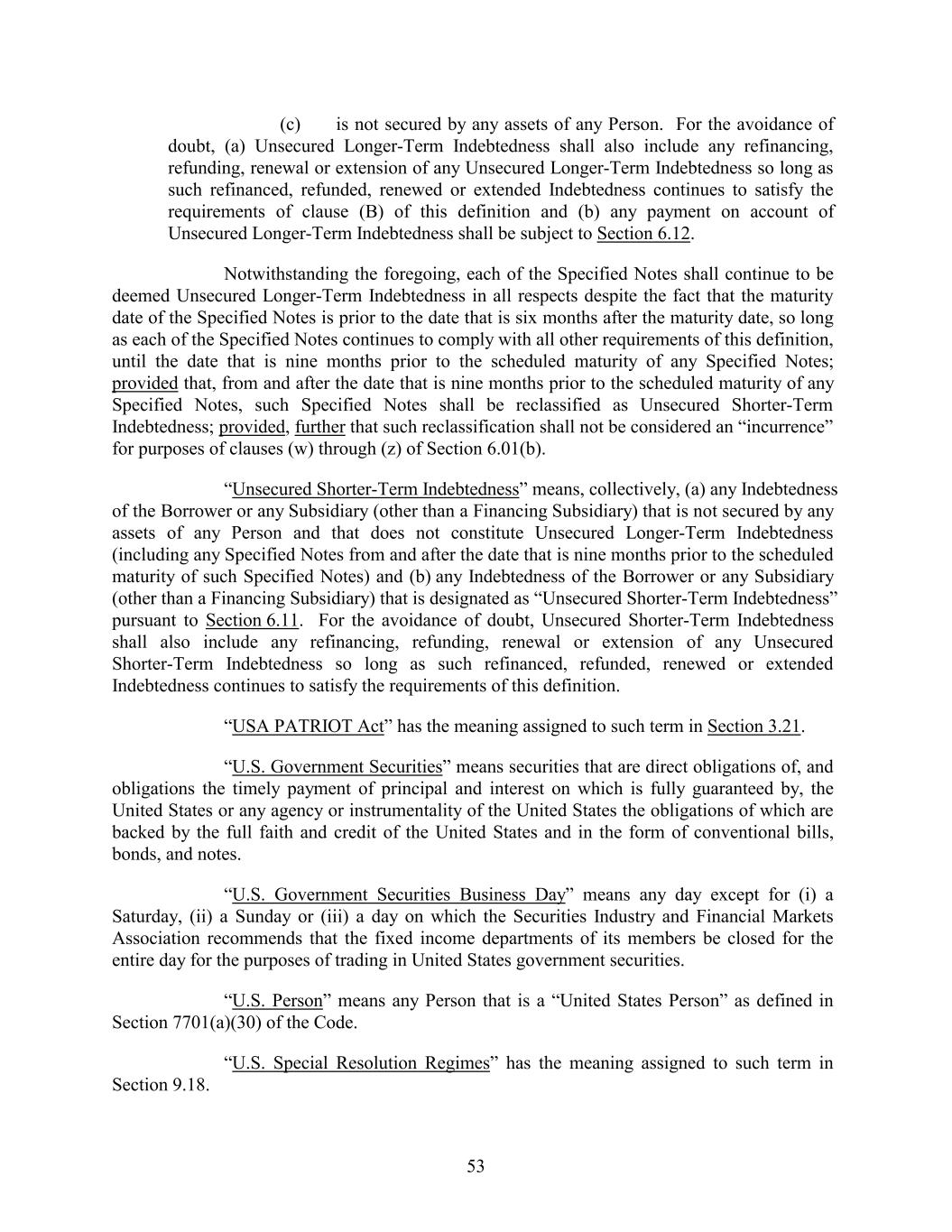 (c) is not secured by any assets of any Person. For the avoidance of doubt, (a) Unsecured Longer-Term Indebtedness shall also include any refinancing, refunding, renewal or extension of any Unsecured Longer-Term Indebtedness so long as such refinanced, refunded, renewed or extended Indebtedness continues to satisfy the requirements of clause (B) of this definition and (b) any payment on account of Unsecured Longer-Term Indebtedness shall be subject to Section 6.12. Notwithstanding the foregoing, each of the Specified Notes shall continue to be deemed Unsecured Longer-Term Indebtedness in all respects despite the fact that the maturity date of the Specified Notes is prior to the date that is six months after the maturity date, so long as each of the Specified Notes continues to comply with all other requirements of this definition, until the date that is nine months prior to the scheduled maturity of any Specified Notes; provided that, from and after the date that is nine months prior to the scheduled maturity of any Specified Notes, such Specified Notes shall be reclassified as Unsecured Shorter-Term Indebtedness; provided, further that such reclassification shall not be considered an “incurrence” for purposes of clauses (w) through (z) of Section 6.01(b). “Unsecured Shorter-Term Indebtedness” means, collectively, (a) any Indebtedness of the Borrower or any Subsidiary (other than a Financing Subsidiary) that is not secured by any assets of any Person and that does not constitute Unsecured Longer-Term Indebtedness (including any Specified Notes from and after the date that is nine months prior to the scheduled maturity of such Specified Notes) and (b) any Indebtedness of the Borrower or any Subsidiary (other than a Financing Subsidiary) that is designated as “Unsecured Shorter-Term Indebtedness” pursuant to Section 6.11. For the avoidance of doubt, Unsecured Shorter-Term Indebtedness shall also include any refinancing, refunding, renewal or extension of any Unsecured Shorter-Term Indebtedness so long as such refinanced, refunded, renewed or extended Indebtedness continues to satisfy the requirements of this definition. “USA PATRIOT Act” has the meaning assigned to such term in Section 3.21. “U.S. Government Securities” means securities that are direct obligations of, and obligations the timely payment of principal and interest on which is fully guaranteed by, the United States or any agency or instrumentality of the United States the obligations of which are backed by the full faith and credit of the United States and in the form of conventional bills, bonds, and notes. “U.S. Government Securities Business Day” means any day except for (i) a Saturday, (ii) a Sunday or (iii) a day on which the Securities Industry and Financial Markets Association recommends that the fixed income departments of its members be closed for the entire day for the purposes of trading in United States government securities. “U.S. Person” means any Person that is a “United States Person” as defined in Section 7701(a)(30) of the Code. “U.S. Special Resolution Regimes” has the meaning assigned to such term in Section 9.18. 53