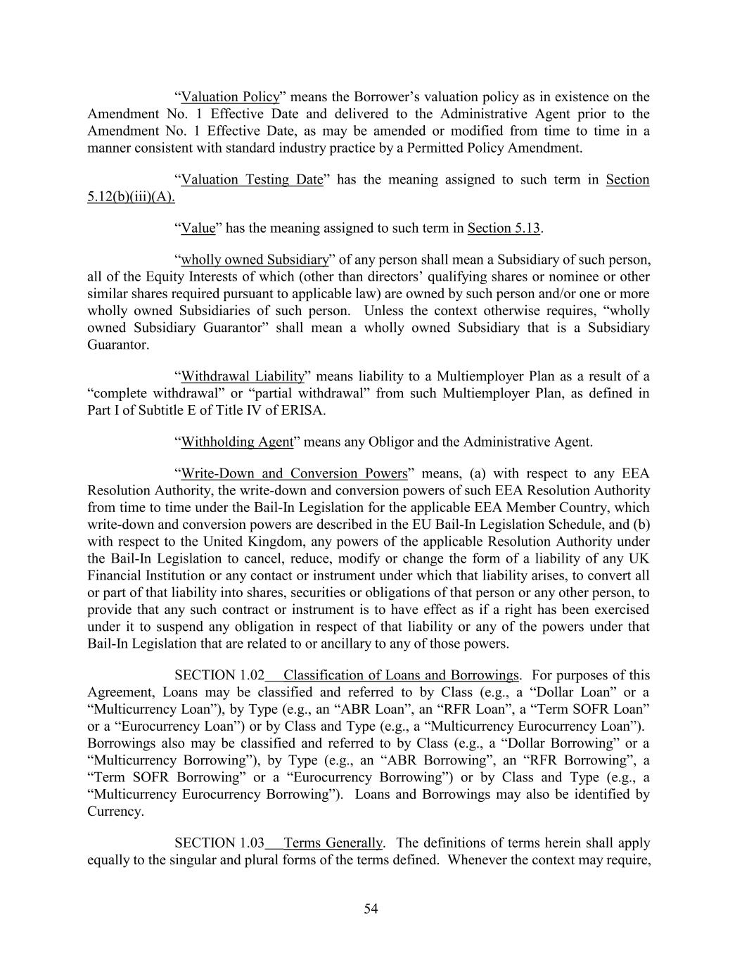 “Valuation Policy” means the Borrower’s valuation policy as in existence on the Amendment No. 1 Effective Date and delivered to the Administrative Agent prior to the Amendment No. 1 Effective Date, as may be amended or modified from time to time in a manner consistent with standard industry practice by a Permitted Policy Amendment. “Valuation Testing Date” has the meaning assigned to such term in Section 5.12(b)(iii)(A). “Value” has the meaning assigned to such term in Section 5.13. “wholly owned Subsidiary” of any person shall mean a Subsidiary of such person, all of the Equity Interests of which (other than directors’ qualifying shares or nominee or other similar shares required pursuant to applicable law) are owned by such person and/or one or more wholly owned Subsidiaries of such person. Unless the context otherwise requires, “wholly owned Subsidiary Guarantor” shall mean a wholly owned Subsidiary that is a Subsidiary Guarantor. “Withdrawal Liability” means liability to a Multiemployer Plan as a result of a “complete withdrawal” or “partial withdrawal” from such Multiemployer Plan, as defined in Part I of Subtitle E of Title IV of ERISA. “Withholding Agent” means any Obligor and the Administrative Agent. “Write-Down and Conversion Powers” means, (a) with respect to any EEA Resolution Authority, the write-down and conversion powers of such EEA Resolution Authority from time to time under the Bail-In Legislation for the applicable EEA Member Country, which write-down and conversion powers are described in the EU Bail-In Legislation Schedule, and (b) with respect to the United Kingdom, any powers of the applicable Resolution Authority under the Bail-In Legislation to cancel, reduce, modify or change the form of a liability of any UK Financial Institution or any contact or instrument under which that liability arises, to convert all or part of that liability into shares, securities or obligations of that person or any other person, to provide that any such contract or instrument is to have effect as if a right has been exercised under it to suspend any obligation in respect of that liability or any of the powers under that Bail-In Legislation that are related to or ancillary to any of those powers. SECTION 1.02 Classification of Loans and Borrowings. For purposes of this Agreement, Loans may be classified and referred to by Class (e.g., a “Dollar Loan” or a “Multicurrency Loan”), by Type (e.g., an “ABR Loan”, an “RFR Loan”, a “Term SOFR Loan” or a “Eurocurrency Loan”) or by Class and Type (e.g., a “Multicurrency Eurocurrency Loan”). Borrowings also may be classified and referred to by Class (e.g., a “Dollar Borrowing” or a “Multicurrency Borrowing”), by Type (e.g., an “ABR Borrowing”, an “RFR Borrowing”, a “Term SOFR Borrowing” or a “Eurocurrency Borrowing”) or by Class and Type (e.g., a “Multicurrency Eurocurrency Borrowing”). Loans and Borrowings may also be identified by Currency. SECTION 1.03 Terms Generally. The definitions of terms herein shall apply equally to the singular and plural forms of the terms defined. Whenever the context may require, 54