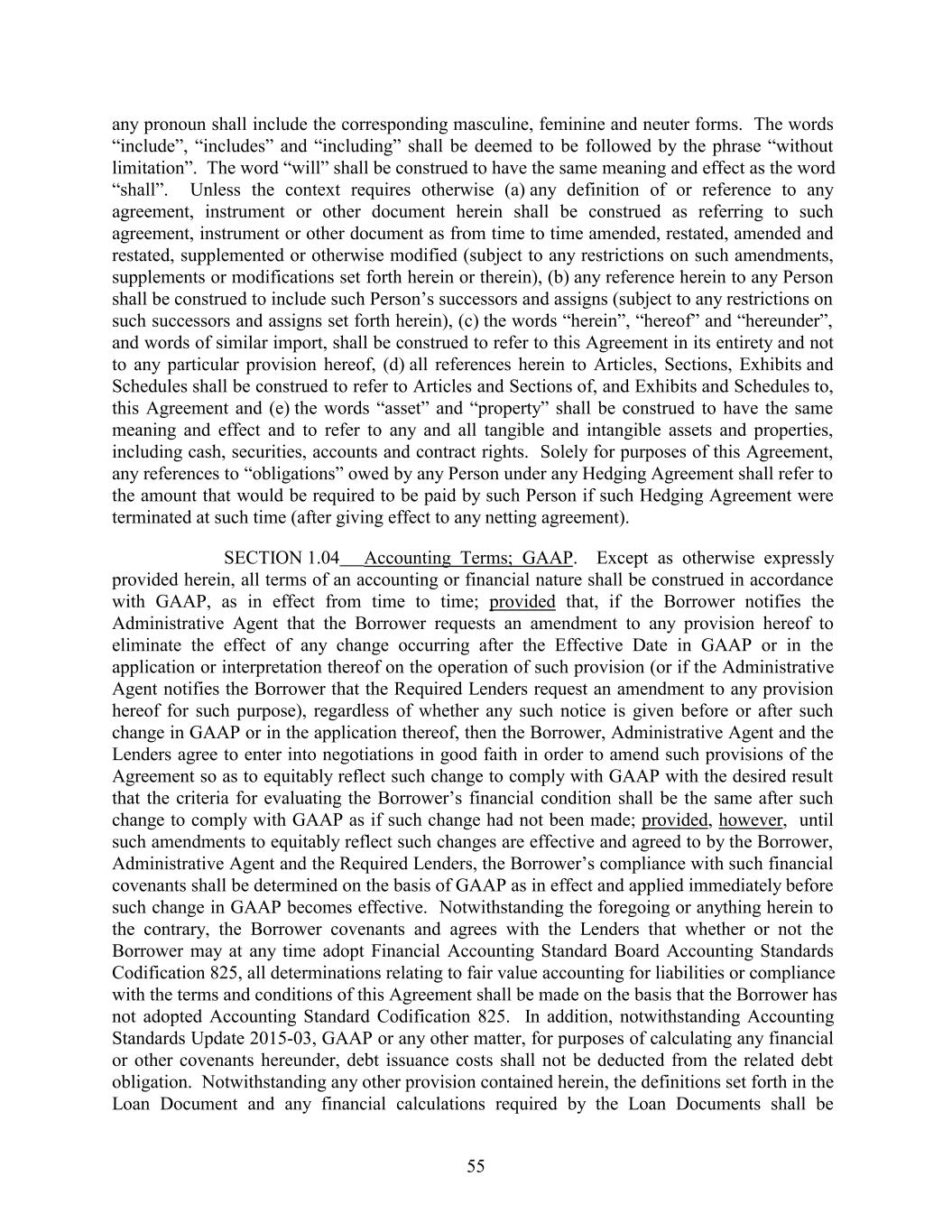 any pronoun shall include the corresponding masculine, feminine and neuter forms. The words “include”, “includes” and “including” shall be deemed to be followed by the phrase “without limitation”. The word “will” shall be construed to have the same meaning and effect as the word “shall”. Unless the context requires otherwise (a) any definition of or reference to any agreement, instrument or other document herein shall be construed as referring to such agreement, instrument or other document as from time to time amended, restated, amended and restated, supplemented or otherwise modified (subject to any restrictions on such amendments, supplements or modifications set forth herein or therein), (b) any reference herein to any Person shall be construed to include such Person’s successors and assigns (subject to any restrictions on such successors and assigns set forth herein), (c) the words “herein”, “hereof” and “hereunder”, and words of similar import, shall be construed to refer to this Agreement in its entirety and not to any particular provision hereof, (d) all references herein to Articles, Sections, Exhibits and Schedules shall be construed to refer to Articles and Sections of, and Exhibits and Schedules to, this Agreement and (e) the words “asset” and “property” shall be construed to have the same meaning and effect and to refer to any and all tangible and intangible assets and properties, including cash, securities, accounts and contract rights. Solely for purposes of this Agreement, any references to “obligations” owed by any Person under any Hedging Agreement shall refer to the amount that would be required to be paid by such Person if such Hedging Agreement were terminated at such time (after giving effect to any netting agreement). SECTION 1.04 Accounting Terms; GAAP. Except as otherwise expressly provided herein, all terms of an accounting or financial nature shall be construed in accordance with GAAP, as in effect from time to time; provided that, if the Borrower notifies the Administrative Agent that the Borrower requests an amendment to any provision hereof to eliminate the effect of any change occurring after the Effective Date in GAAP or in the application or interpretation thereof on the operation of such provision (or if the Administrative Agent notifies the Borrower that the Required Lenders request an amendment to any provision hereof for such purpose), regardless of whether any such notice is given before or after such change in GAAP or in the application thereof, then the Borrower, Administrative Agent and the Lenders agree to enter into negotiations in good faith in order to amend such provisions of the Agreement so as to equitably reflect such change to comply with GAAP with the desired result that the criteria for evaluating the Borrower’s financial condition shall be the same after such change to comply with GAAP as if such change had not been made; provided, however, until such amendments to equitably reflect such changes are effective and agreed to by the Borrower, Administrative Agent and the Required Lenders, the Borrower’s compliance with such financial covenants shall be determined on the basis of GAAP as in effect and applied immediately before such change in GAAP becomes effective. Notwithstanding the foregoing or anything herein to the contrary, the Borrower covenants and agrees with the Lenders that whether or not the Borrower may at any time adopt Financial Accounting Standard Board Accounting Standards Codification 825, all determinations relating to fair value accounting for liabilities or compliance with the terms and conditions of this Agreement shall be made on the basis that the Borrower has not adopted Accounting Standard Codification 825. In addition, notwithstanding Accounting Standards Update 2015-03, GAAP or any other matter, for purposes of calculating any financial or other covenants hereunder, debt issuance costs shall not be deducted from the related debt obligation. Notwithstanding any other provision contained herein, the definitions set forth in the Loan Document and any financial calculations required by the Loan Documents shall be 55