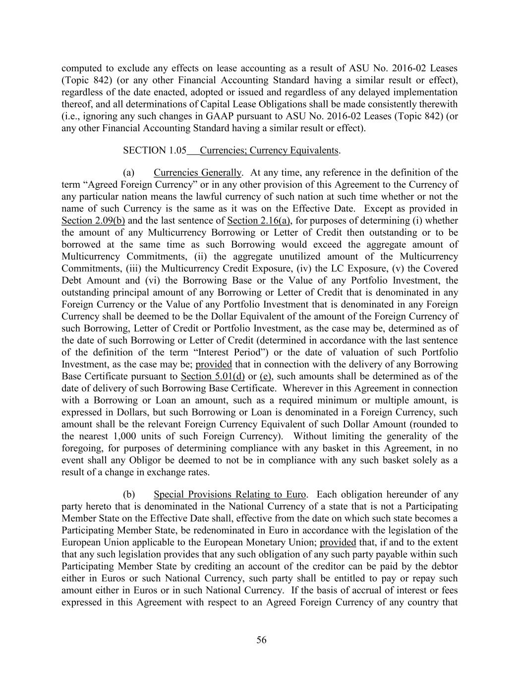 computed to exclude any effects on lease accounting as a result of ASU No. 2016-02 Leases (Topic 842) (or any other Financial Accounting Standard having a similar result or effect), regardless of the date enacted, adopted or issued and regardless of any delayed implementation thereof, and all determinations of Capital Lease Obligations shall be made consistently therewith (i.e., ignoring any such changes in GAAP pursuant to ASU No. 2016-02 Leases (Topic 842) (or any other Financial Accounting Standard having a similar result or effect). SECTION 1.05 Currencies; Currency Equivalents. (a) Currencies Generally. At any time, any reference in the definition of the term “Agreed Foreign Currency” or in any other provision of this Agreement to the Currency of any particular nation means the lawful currency of such nation at such time whether or not the name of such Currency is the same as it was on the Effective Date. Except as provided in Section 2.09(b) and the last sentence of Section 2.16(a), for purposes of determining (i) whether the amount of any Multicurrency Borrowing or Letter of Credit then outstanding or to be borrowed at the same time as such Borrowing would exceed the aggregate amount of Multicurrency Commitments, (ii) the aggregate unutilized amount of the Multicurrency Commitments, (iii) the Multicurrency Credit Exposure, (iv) the LC Exposure, (v) the Covered Debt Amount and (vi) the Borrowing Base or the Value of any Portfolio Investment, the outstanding principal amount of any Borrowing or Letter of Credit that is denominated in any Foreign Currency or the Value of any Portfolio Investment that is denominated in any Foreign Currency shall be deemed to be the Dollar Equivalent of the amount of the Foreign Currency of such Borrowing, Letter of Credit or Portfolio Investment, as the case may be, determined as of the date of such Borrowing or Letter of Credit (determined in accordance with the last sentence of the definition of the term “Interest Period”) or the date of valuation of such Portfolio Investment, as the case may be; provided that in connection with the delivery of any Borrowing Base Certificate pursuant to Section 5.01(d) or (e), such amounts shall be determined as of the date of delivery of such Borrowing Base Certificate. Wherever in this Agreement in connection with a Borrowing or Loan an amount, such as a required minimum or multiple amount, is expressed in Dollars, but such Borrowing or Loan is denominated in a Foreign Currency, such amount shall be the relevant Foreign Currency Equivalent of such Dollar Amount (rounded to the nearest 1,000 units of such Foreign Currency). Without limiting the generality of the foregoing, for purposes of determining compliance with any basket in this Agreement, in no event shall any Obligor be deemed to not be in compliance with any such basket solely as a result of a change in exchange rates. (b) Special Provisions Relating to Euro. Each obligation hereunder of any party hereto that is denominated in the National Currency of a state that is not a Participating Member State on the Effective Date shall, effective from the date on which such state becomes a Participating Member State, be redenominated in Euro in accordance with the legislation of the European Union applicable to the European Monetary Union; provided that, if and to the extent that any such legislation provides that any such obligation of any such party payable within such Participating Member State by crediting an account of the creditor can be paid by the debtor either in Euros or such National Currency, such party shall be entitled to pay or repay such amount either in Euros or in such National Currency. If the basis of accrual of interest or fees expressed in this Agreement with respect to an Agreed Foreign Currency of any country that 56