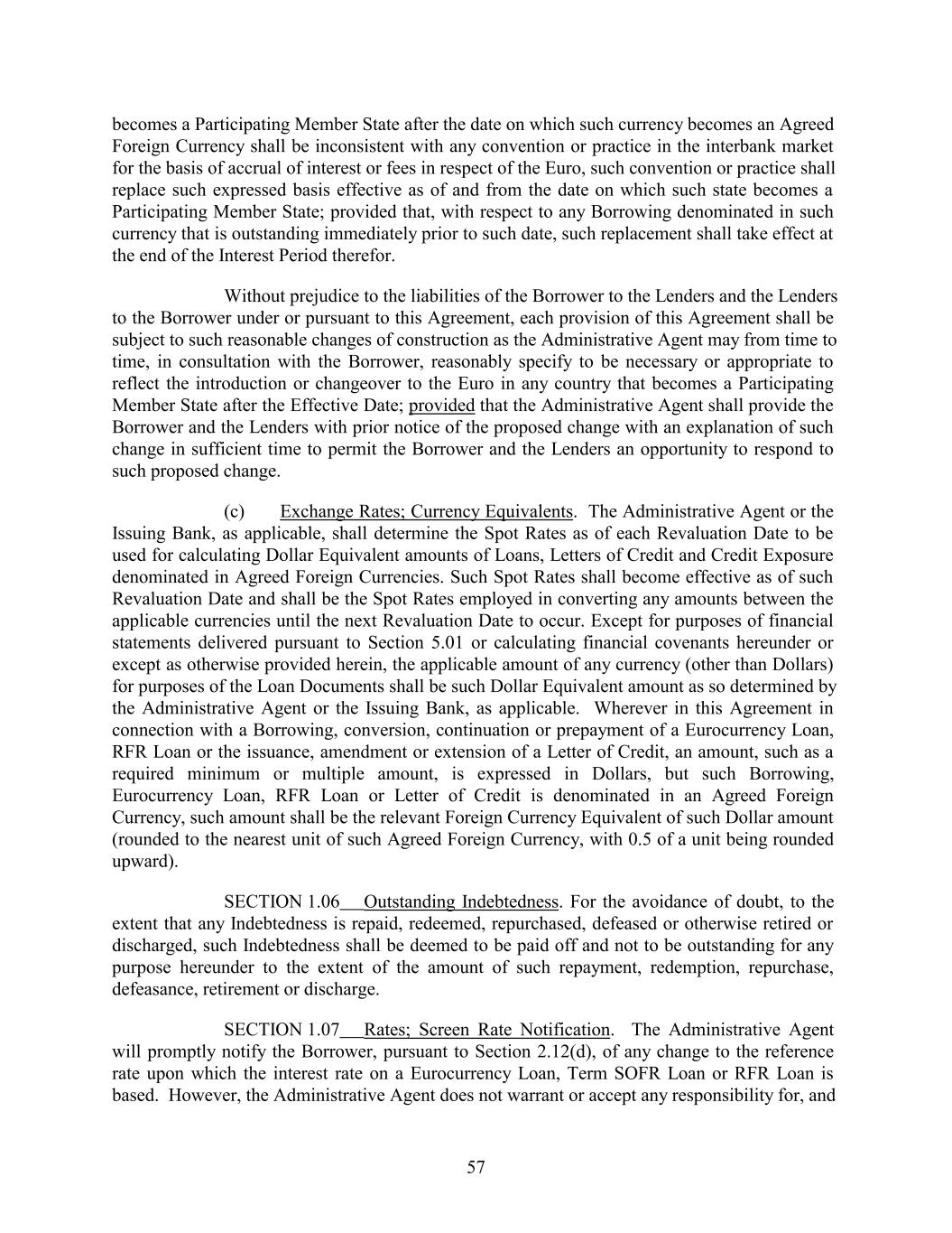 becomes a Participating Member State after the date on which such currency becomes an Agreed Foreign Currency shall be inconsistent with any convention or practice in the interbank market for the basis of accrual of interest or fees in respect of the Euro, such convention or practice shall replace such expressed basis effective as of and from the date on which such state becomes a Participating Member State; provided that, with respect to any Borrowing denominated in such currency that is outstanding immediately prior to such date, such replacement shall take effect at the end of the Interest Period therefor. Without prejudice to the liabilities of the Borrower to the Lenders and the Lenders to the Borrower under or pursuant to this Agreement, each provision of this Agreement shall be subject to such reasonable changes of construction as the Administrative Agent may from time to time, in consultation with the Borrower, reasonably specify to be necessary or appropriate to reflect the introduction or changeover to the Euro in any country that becomes a Participating Member State after the Effective Date; provided that the Administrative Agent shall provide the Borrower and the Lenders with prior notice of the proposed change with an explanation of such change in sufficient time to permit the Borrower and the Lenders an opportunity to respond to such proposed change. (c) Exchange Rates; Currency Equivalents. The Administrative Agent or the Issuing Bank, as applicable, shall determine the Spot Rates as of each Revaluation Date to be used for calculating Dollar Equivalent amounts of Loans, Letters of Credit and Credit Exposure denominated in Agreed Foreign Currencies. Such Spot Rates shall become effective as of such Revaluation Date and shall be the Spot Rates employed in converting any amounts between the applicable currencies until the next Revaluation Date to occur. Except for purposes of financial statements delivered pursuant to Section 5.01 or calculating financial covenants hereunder or except as otherwise provided herein, the applicable amount of any currency (other than Dollars) for purposes of the Loan Documents shall be such Dollar Equivalent amount as so determined by the Administrative Agent or the Issuing Bank, as applicable. Wherever in this Agreement in connection with a Borrowing, conversion, continuation or prepayment of a Eurocurrency Loan, RFR Loan or the issuance, amendment or extension of a Letter of Credit, an amount, such as a required minimum or multiple amount, is expressed in Dollars, but such Borrowing, Eurocurrency Loan, RFR Loan or Letter of Credit is denominated in an Agreed Foreign Currency, such amount shall be the relevant Foreign Currency Equivalent of such Dollar amount (rounded to the nearest unit of such Agreed Foreign Currency, with 0.5 of a unit being rounded upward). SECTION 1.06 Outstanding Indebtedness. For the avoidance of doubt, to the extent that any Indebtedness is repaid, redeemed, repurchased, defeased or otherwise retired or discharged, such Indebtedness shall be deemed to be paid off and not to be outstanding for any purpose hereunder to the extent of the amount of such repayment, redemption, repurchase, defeasance, retirement or discharge. SECTION 1.07 Rates; Screen Rate Notification. The Administrative Agent will promptly notify the Borrower, pursuant to Section 2.12(d), of any change to the reference rate upon which the interest rate on a Eurocurrency Loan, Term SOFR Loan or RFR Loan is based. However, the Administrative Agent does not warrant or accept any responsibility for, and 57