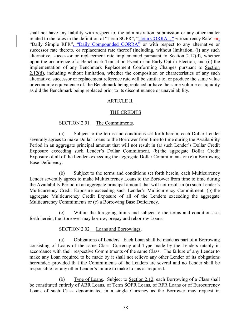 shall not have any liability with respect to, the administration, submission or any other matter related to the rates in the definition of “Term SOFR”, “Term CORRA”, “Eurocurrency Rate” or, “Daily Simple RFR”, “Daily Compounded CORRA” or with respect to any alternative or successor rate thereto, or replacement rate thereof (including, without limitation, (i) any such alternative, successor or replacement rate implemented pursuant to Section 2.12(d), whether upon the occurrence of a Benchmark Transition Event or an Early Opt-in Election, and (ii) the implementation of any Benchmark Replacement Conforming Changes pursuant to Section 2.12(d), including without limitation, whether the composition or characteristics of any such alternative, successor or replacement reference rate will be similar to, or produce the same value or economic equivalence of, the Benchmark being replaced or have the same volume or liquidity as did the Benchmark being replaced prior to its discontinuance or unavailability. ARTICLE II. THE CREDITS SECTION 2.01 The Commitments. (a) Subject to the terms and conditions set forth herein, each Dollar Lender severally agrees to make Dollar Loans to the Borrower from time to time during the Availability Period in an aggregate principal amount that will not result in (a) such Lender’s Dollar Credit Exposure exceeding such Lender’s Dollar Commitment, (b) the aggregate Dollar Credit Exposure of all of the Lenders exceeding the aggregate Dollar Commitments or (c) a Borrowing Base Deficiency. (b) Subject to the terms and conditions set forth herein, each Multicurrency Lender severally agrees to make Multicurrency Loans to the Borrower from time to time during the Availability Period in an aggregate principal amount that will not result in (a) such Lender’s Multicurrency Credit Exposure exceeding such Lender’s Multicurrency Commitment, (b) the aggregate Multicurrency Credit Exposure of all of the Lenders exceeding the aggregate Multicurrency Commitments or (c) a Borrowing Base Deficiency. (c) Within the foregoing limits and subject to the terms and conditions set forth herein, the Borrower may borrow, prepay and reborrow Loans. SECTION 2.02 Loans and Borrowings. (a) Obligations of Lenders. Each Loan shall be made as part of a Borrowing consisting of Loans of the same Class, Currency and Type made by the Lenders ratably in accordance with their respective Commitments of the same Class. The failure of any Lender to make any Loan required to be made by it shall not relieve any other Lender of its obligations hereunder; provided that the Commitments of the Lenders are several and no Lender shall be responsible for any other Lender’s failure to make Loans as required. (b) Type of Loans. Subject to Section 2.12, each Borrowing of a Class shall be constituted entirely of ABR Loans, of Term SOFR Loans, of RFR Loans or of Eurocurrency Loans of such Class denominated in a single Currency as the Borrower may request in 58