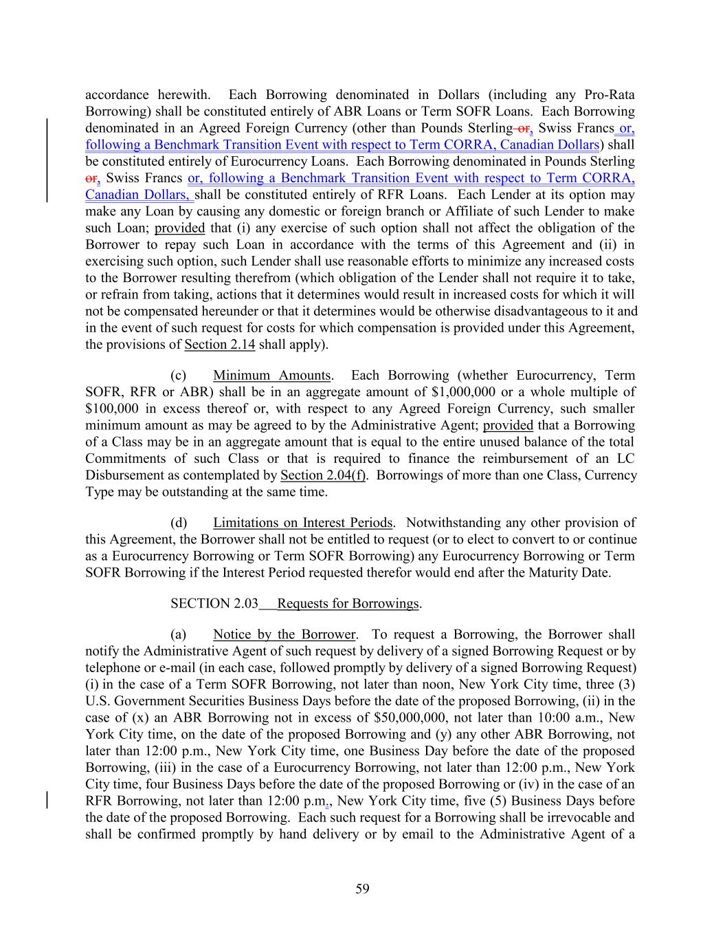 accordance herewith. Each Borrowing denominated in Dollars (including any Pro-Rata Borrowing) shall be constituted entirely of ABR Loans or Term SOFR Loans. Each Borrowing denominated in an Agreed Foreign Currency (other than Pounds Sterling or, Swiss Francs or, following a Benchmark Transition Event with respect to Term CORRA, Canadian Dollars) shall be constituted entirely of Eurocurrency Loans. Each Borrowing denominated in Pounds Sterling or, Swiss Francs or, following a Benchmark Transition Event with respect to Term CORRA, Canadian Dollars, shall be constituted entirely of RFR Loans. Each Lender at its option may make any Loan by causing any domestic or foreign branch or Affiliate of such Lender to make such Loan; provided that (i) any exercise of such option shall not affect the obligation of the Borrower to repay such Loan in accordance with the terms of this Agreement and (ii) in exercising such option, such Lender shall use reasonable efforts to minimize any increased costs to the Borrower resulting therefrom (which obligation of the Lender shall not require it to take, or refrain from taking, actions that it determines would result in increased costs for which it will not be compensated hereunder or that it determines would be otherwise disadvantageous to it and in the event of such request for costs for which compensation is provided under this Agreement, the provisions of Section 2.14 shall apply). (c) Minimum Amounts. Each Borrowing (whether Eurocurrency, Term SOFR, RFR or ABR) shall be in an aggregate amount of $1,000,000 or a whole multiple of $100,000 in excess thereof or, with respect to any Agreed Foreign Currency, such smaller minimum amount as may be agreed to by the Administrative Agent; provided that a Borrowing of a Class may be in an aggregate amount that is equal to the entire unused balance of the total Commitments of such Class or that is required to finance the reimbursement of an LC Disbursement as contemplated by Section 2.04(f). Borrowings of more than one Class, Currency Type may be outstanding at the same time. (d) Limitations on Interest Periods. Notwithstanding any other provision of this Agreement, the Borrower shall not be entitled to request (or to elect to convert to or continue as a Eurocurrency Borrowing or Term SOFR Borrowing) any Eurocurrency Borrowing or Term SOFR Borrowing if the Interest Period requested therefor would end after the Maturity Date. SECTION 2.03 Requests for Borrowings. (a) Notice by the Borrower. To request a Borrowing, the Borrower shall notify the Administrative Agent of such request by delivery of a signed Borrowing Request or by telephone or e-mail (in each case, followed promptly by delivery of a signed Borrowing Request) (i) in the case of a Term SOFR Borrowing, not later than noon, New York City time, three (3) U.S. Government Securities Business Days before the date of the proposed Borrowing, (ii) in the case of (x) an ABR Borrowing not in excess of $50,000,000, not later than 10:00 a.m., New York City time, on the date of the proposed Borrowing and (y) any other ABR Borrowing, not later than 12:00 p.m., New York City time, one Business Day before the date of the proposed Borrowing, (iii) in the case of a Eurocurrency Borrowing, not later than 12:00 p.m., New York City time, four Business Days before the date of the proposed Borrowing or (iv) in the case of an RFR Borrowing, not later than 12:00 p.m., New York City time, five (5) Business Days before the date of the proposed Borrowing. Each such request for a Borrowing shall be irrevocable and shall be confirmed promptly by hand delivery or by email to the Administrative Agent of a 59