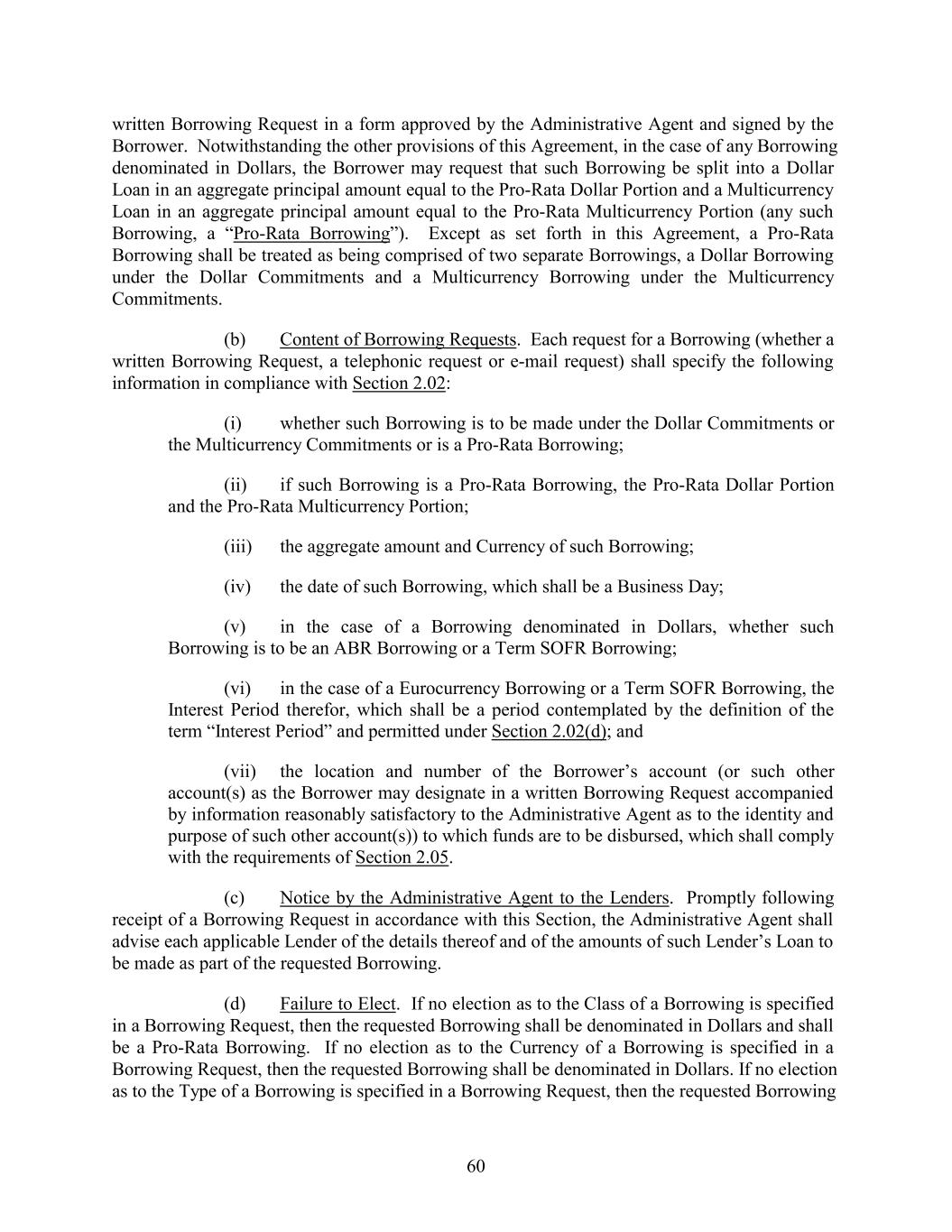 written Borrowing Request in a form approved by the Administrative Agent and signed by the Borrower. Notwithstanding the other provisions of this Agreement, in the case of any Borrowing denominated in Dollars, the Borrower may request that such Borrowing be split into a Dollar Loan in an aggregate principal amount equal to the Pro-Rata Dollar Portion and a Multicurrency Loan in an aggregate principal amount equal to the Pro-Rata Multicurrency Portion (any such Borrowing, a “Pro-Rata Borrowing”). Except as set forth in this Agreement, a Pro-Rata Borrowing shall be treated as being comprised of two separate Borrowings, a Dollar Borrowing under the Dollar Commitments and a Multicurrency Borrowing under the Multicurrency Commitments. (b) Content of Borrowing Requests. Each request for a Borrowing (whether a written Borrowing Request, a telephonic request or e-mail request) shall specify the following information in compliance with Section 2.02: (i) whether such Borrowing is to be made under the Dollar Commitments or the Multicurrency Commitments or is a Pro-Rata Borrowing; (ii) if such Borrowing is a Pro-Rata Borrowing, the Pro-Rata Dollar Portion and the Pro-Rata Multicurrency Portion; (iii) the aggregate amount and Currency of such Borrowing; (iv) the date of such Borrowing, which shall be a Business Day; (v) in the case of a Borrowing denominated in Dollars, whether such Borrowing is to be an ABR Borrowing or a Term SOFR Borrowing; (vi) in the case of a Eurocurrency Borrowing or a Term SOFR Borrowing, the Interest Period therefor, which shall be a period contemplated by the definition of the term “Interest Period” and permitted under Section 2.02(d); and (vii) the location and number of the Borrower’s account (or such other account(s) as the Borrower may designate in a written Borrowing Request accompanied by information reasonably satisfactory to the Administrative Agent as to the identity and purpose of such other account(s)) to which funds are to be disbursed, which shall comply with the requirements of Section 2.05. (c) Notice by the Administrative Agent to the Lenders. Promptly following receipt of a Borrowing Request in accordance with this Section, the Administrative Agent shall advise each applicable Lender of the details thereof and of the amounts of such Lender’s Loan to be made as part of the requested Borrowing. (d) Failure to Elect. If no election as to the Class of a Borrowing is specified in a Borrowing Request, then the requested Borrowing shall be denominated in Dollars and shall be a Pro-Rata Borrowing. If no election as to the Currency of a Borrowing is specified in a Borrowing Request, then the requested Borrowing shall be denominated in Dollars. If no election as to the Type of a Borrowing is specified in a Borrowing Request, then the requested Borrowing 60