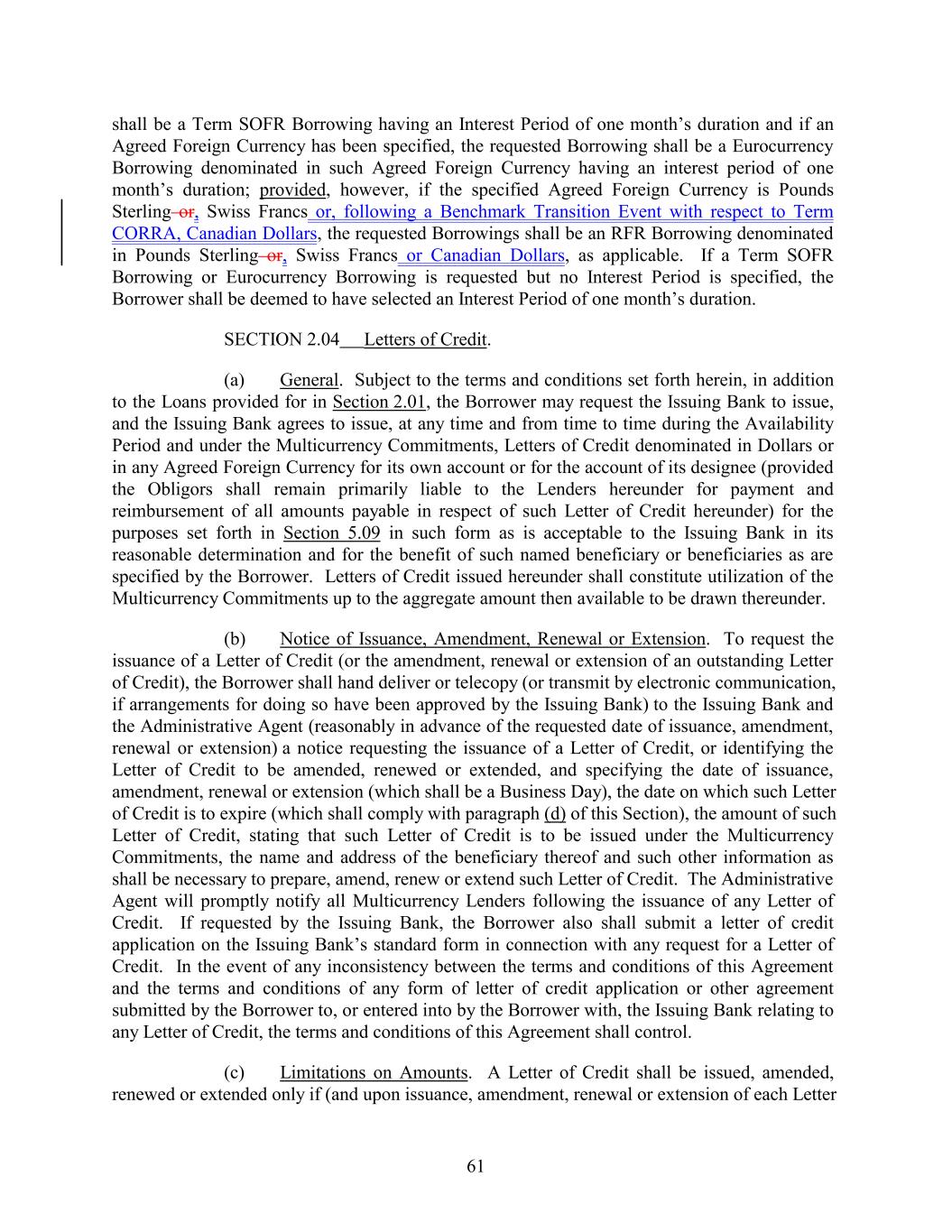 shall be a Term SOFR Borrowing having an Interest Period of one month’s duration and if an Agreed Foreign Currency has been specified, the requested Borrowing shall be a Eurocurrency Borrowing denominated in such Agreed Foreign Currency having an interest period of one month’s duration; provided, however, if the specified Agreed Foreign Currency is Pounds Sterling or, Swiss Francs or, following a Benchmark Transition Event with respect to Term CORRA, Canadian Dollars, the requested Borrowings shall be an RFR Borrowing denominated in Pounds Sterling or, Swiss Francs or Canadian Dollars, as applicable. If a Term SOFR Borrowing or Eurocurrency Borrowing is requested but no Interest Period is specified, the Borrower shall be deemed to have selected an Interest Period of one month’s duration. SECTION 2.04 Letters of Credit. (a) General. Subject to the terms and conditions set forth herein, in addition to the Loans provided for in Section 2.01, the Borrower may request the Issuing Bank to issue, and the Issuing Bank agrees to issue, at any time and from time to time during the Availability Period and under the Multicurrency Commitments, Letters of Credit denominated in Dollars or in any Agreed Foreign Currency for its own account or for the account of its designee (provided the Obligors shall remain primarily liable to the Lenders hereunder for payment and reimbursement of all amounts payable in respect of such Letter of Credit hereunder) for the purposes set forth in Section 5.09 in such form as is acceptable to the Issuing Bank in its reasonable determination and for the benefit of such named beneficiary or beneficiaries as are specified by the Borrower. Letters of Credit issued hereunder shall constitute utilization of the Multicurrency Commitments up to the aggregate amount then available to be drawn thereunder. (b) Notice of Issuance, Amendment, Renewal or Extension. To request the issuance of a Letter of Credit (or the amendment, renewal or extension of an outstanding Letter of Credit), the Borrower shall hand deliver or telecopy (or transmit by electronic communication, if arrangements for doing so have been approved by the Issuing Bank) to the Issuing Bank and the Administrative Agent (reasonably in advance of the requested date of issuance, amendment, renewal or extension) a notice requesting the issuance of a Letter of Credit, or identifying the Letter of Credit to be amended, renewed or extended, and specifying the date of issuance, amendment, renewal or extension (which shall be a Business Day), the date on which such Letter of Credit is to expire (which shall comply with paragraph (d) of this Section), the amount of such Letter of Credit, stating that such Letter of Credit is to be issued under the Multicurrency Commitments, the name and address of the beneficiary thereof and such other information as shall be necessary to prepare, amend, renew or extend such Letter of Credit. The Administrative Agent will promptly notify all Multicurrency Lenders following the issuance of any Letter of Credit. If requested by the Issuing Bank, the Borrower also shall submit a letter of credit application on the Issuing Bank’s standard form in connection with any request for a Letter of Credit. In the event of any inconsistency between the terms and conditions of this Agreement and the terms and conditions of any form of letter of credit application or other agreement submitted by the Borrower to, or entered into by the Borrower with, the Issuing Bank relating to any Letter of Credit, the terms and conditions of this Agreement shall control. (c) Limitations on Amounts. A Letter of Credit shall be issued, amended, renewed or extended only if (and upon issuance, amendment, renewal or extension of each Letter 61
