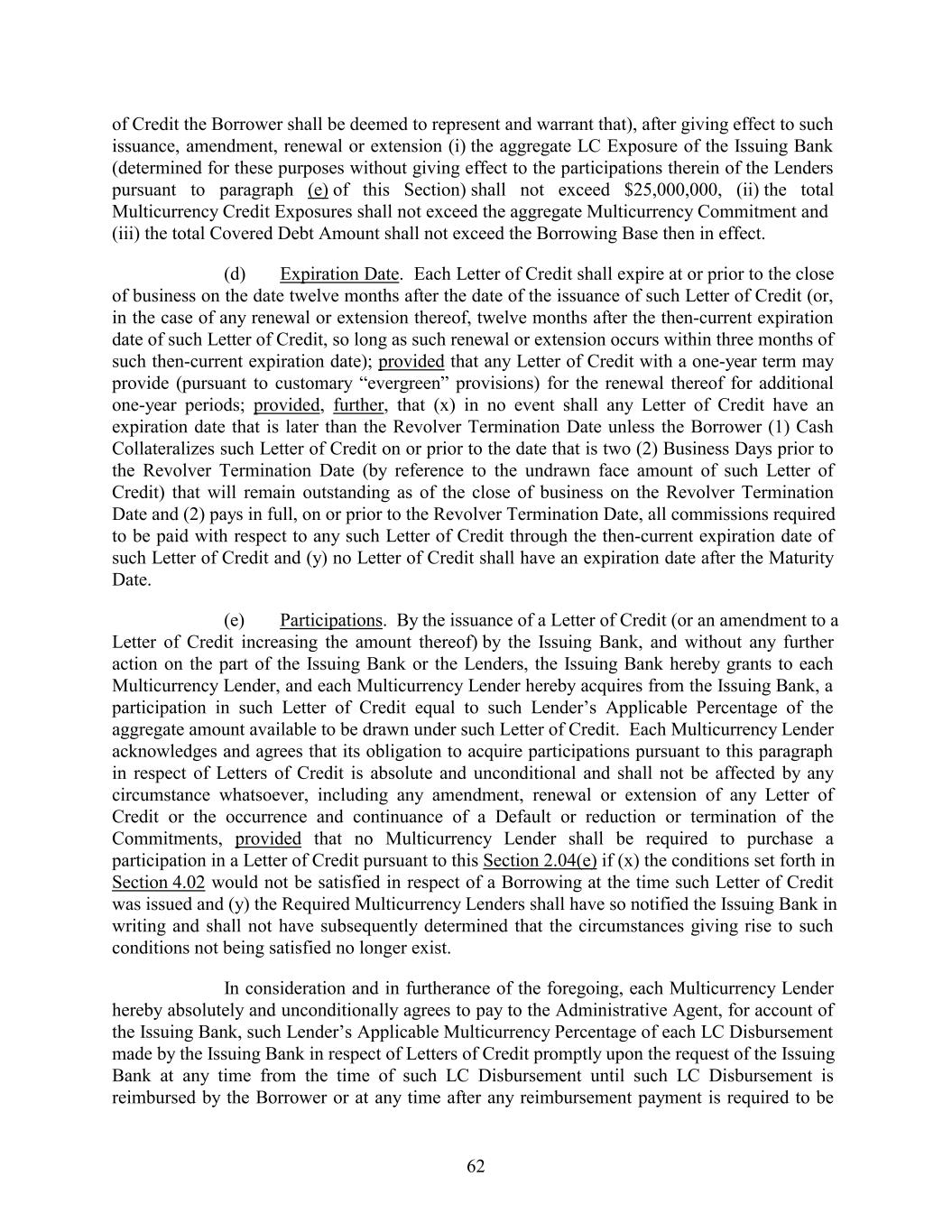 of Credit the Borrower shall be deemed to represent and warrant that), after giving effect to such issuance, amendment, renewal or extension (i) the aggregate LC Exposure of the Issuing Bank (determined for these purposes without giving effect to the participations therein of the Lenders pursuant to paragraph (e) of this Section) shall not exceed $25,000,000, (ii) the total Multicurrency Credit Exposures shall not exceed the aggregate Multicurrency Commitment and (iii) the total Covered Debt Amount shall not exceed the Borrowing Base then in effect. (d) Expiration Date. Each Letter of Credit shall expire at or prior to the close of business on the date twelve months after the date of the issuance of such Letter of Credit (or, in the case of any renewal or extension thereof, twelve months after the then-current expiration date of such Letter of Credit, so long as such renewal or extension occurs within three months of such then-current expiration date); provided that any Letter of Credit with a one-year term may provide (pursuant to customary “evergreen” provisions) for the renewal thereof for additional one-year periods; provided, further, that (x) in no event shall any Letter of Credit have an expiration date that is later than the Revolver Termination Date unless the Borrower (1) Cash Collateralizes such Letter of Credit on or prior to the date that is two (2) Business Days prior to the Revolver Termination Date (by reference to the undrawn face amount of such Letter of Credit) that will remain outstanding as of the close of business on the Revolver Termination Date and (2) pays in full, on or prior to the Revolver Termination Date, all commissions required to be paid with respect to any such Letter of Credit through the then-current expiration date of such Letter of Credit and (y) no Letter of Credit shall have an expiration date after the Maturity Date. (e) Participations. By the issuance of a Letter of Credit (or an amendment to a Letter of Credit increasing the amount thereof) by the Issuing Bank, and without any further action on the part of the Issuing Bank or the Lenders, the Issuing Bank hereby grants to each Multicurrency Lender, and each Multicurrency Lender hereby acquires from the Issuing Bank, a participation in such Letter of Credit equal to such Lender’s Applicable Percentage of the aggregate amount available to be drawn under such Letter of Credit. Each Multicurrency Lender acknowledges and agrees that its obligation to acquire participations pursuant to this paragraph in respect of Letters of Credit is absolute and unconditional and shall not be affected by any circumstance whatsoever, including any amendment, renewal or extension of any Letter of Credit or the occurrence and continuance of a Default or reduction or termination of the Commitments, provided that no Multicurrency Lender shall be required to purchase a participation in a Letter of Credit pursuant to this Section 2.04(e) if (x) the conditions set forth in Section 4.02 would not be satisfied in respect of a Borrowing at the time such Letter of Credit was issued and (y) the Required Multicurrency Lenders shall have so notified the Issuing Bank in writing and shall not have subsequently determined that the circumstances giving rise to such conditions not being satisfied no longer exist. In consideration and in furtherance of the foregoing, each Multicurrency Lender hereby absolutely and unconditionally agrees to pay to the Administrative Agent, for account of the Issuing Bank, such Lender’s Applicable Multicurrency Percentage of each LC Disbursement made by the Issuing Bank in respect of Letters of Credit promptly upon the request of the Issuing Bank at any time from the time of such LC Disbursement until such LC Disbursement is reimbursed by the Borrower or at any time after any reimbursement payment is required to be 62
