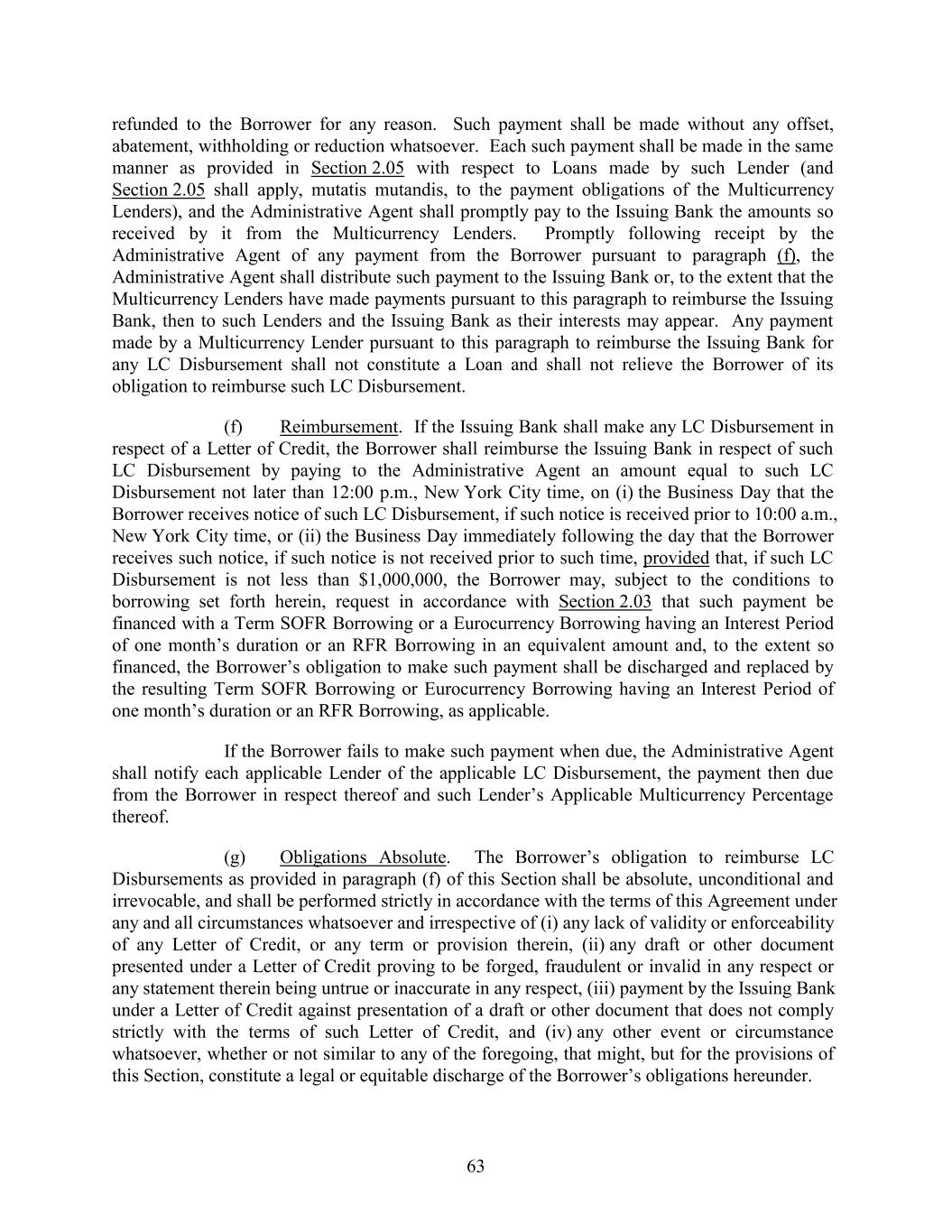 refunded to the Borrower for any reason. Such payment shall be made without any offset, abatement, withholding or reduction whatsoever. Each such payment shall be made in the same manner as provided in Section 2.05 with respect to Loans made by such Lender (and Section 2.05 shall apply, mutatis mutandis, to the payment obligations of the Multicurrency Lenders), and the Administrative Agent shall promptly pay to the Issuing Bank the amounts so received by it from the Multicurrency Lenders. Promptly following receipt by the Administrative Agent of any payment from the Borrower pursuant to paragraph (f), the Administrative Agent shall distribute such payment to the Issuing Bank or, to the extent that the Multicurrency Lenders have made payments pursuant to this paragraph to reimburse the Issuing Bank, then to such Lenders and the Issuing Bank as their interests may appear. Any payment made by a Multicurrency Lender pursuant to this paragraph to reimburse the Issuing Bank for any LC Disbursement shall not constitute a Loan and shall not relieve the Borrower of its obligation to reimburse such LC Disbursement. (f) Reimbursement. If the Issuing Bank shall make any LC Disbursement in respect of a Letter of Credit, the Borrower shall reimburse the Issuing Bank in respect of such LC Disbursement by paying to the Administrative Agent an amount equal to such LC Disbursement not later than 12:00 p.m., New York City time, on (i) the Business Day that the Borrower receives notice of such LC Disbursement, if such notice is received prior to 10:00 a.m., New York City time, or (ii) the Business Day immediately following the day that the Borrower receives such notice, if such notice is not received prior to such time, provided that, if such LC Disbursement is not less than $1,000,000, the Borrower may, subject to the conditions to borrowing set forth herein, request in accordance with Section 2.03 that such payment be financed with a Term SOFR Borrowing or a Eurocurrency Borrowing having an Interest Period of one month’s duration or an RFR Borrowing in an equivalent amount and, to the extent so financed, the Borrower’s obligation to make such payment shall be discharged and replaced by the resulting Term SOFR Borrowing or Eurocurrency Borrowing having an Interest Period of one month’s duration or an RFR Borrowing, as applicable. If the Borrower fails to make such payment when due, the Administrative Agent shall notify each applicable Lender of the applicable LC Disbursement, the payment then due from the Borrower in respect thereof and such Lender’s Applicable Multicurrency Percentage thereof. (g) Obligations Absolute. The Borrower’s obligation to reimburse LC Disbursements as provided in paragraph (f) of this Section shall be absolute, unconditional and irrevocable, and shall be performed strictly in accordance with the terms of this Agreement under any and all circumstances whatsoever and irrespective of (i) any lack of validity or enforceability of any Letter of Credit, or any term or provision therein, (ii) any draft or other document presented under a Letter of Credit proving to be forged, fraudulent or invalid in any respect or any statement therein being untrue or inaccurate in any respect, (iii) payment by the Issuing Bank under a Letter of Credit against presentation of a draft or other document that does not comply strictly with the terms of such Letter of Credit, and (iv) any other event or circumstance whatsoever, whether or not similar to any of the foregoing, that might, but for the provisions of this Section, constitute a legal or equitable discharge of the Borrower’s obligations hereunder. 63
