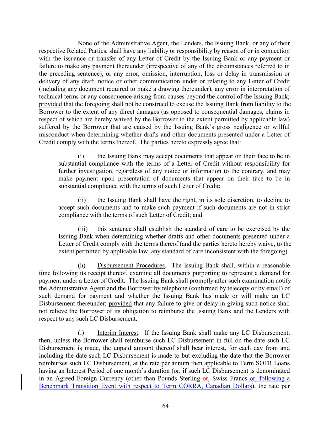 None of the Administrative Agent, the Lenders, the Issuing Bank, or any of their respective Related Parties, shall have any liability or responsibility by reason of or in connection with the issuance or transfer of any Letter of Credit by the Issuing Bank or any payment or failure to make any payment thereunder (irrespective of any of the circumstances referred to in the preceding sentence), or any error, omission, interruption, loss or delay in transmission or delivery of any draft, notice or other communication under or relating to any Letter of Credit (including any document required to make a drawing thereunder), any error in interpretation of technical terms or any consequence arising from causes beyond the control of the Issuing Bank; provided that the foregoing shall not be construed to excuse the Issuing Bank from liability to the Borrower to the extent of any direct damages (as opposed to consequential damages, claims in respect of which are hereby waived by the Borrower to the extent permitted by applicable law) suffered by the Borrower that are caused by the Issuing Bank’s gross negligence or willful misconduct when determining whether drafts and other documents presented under a Letter of Credit comply with the terms thereof. The parties hereto expressly agree that: (i) the Issuing Bank may accept documents that appear on their face to be in substantial compliance with the terms of a Letter of Credit without responsibility for further investigation, regardless of any notice or information to the contrary, and may make payment upon presentation of documents that appear on their face to be in substantial compliance with the terms of such Letter of Credit; (ii) the Issuing Bank shall have the right, in its sole discretion, to decline to accept such documents and to make such payment if such documents are not in strict compliance with the terms of such Letter of Credit; and (iii) this sentence shall establish the standard of care to be exercised by the Issuing Bank when determining whether drafts and other documents presented under a Letter of Credit comply with the terms thereof (and the parties hereto hereby waive, to the extent permitted by applicable law, any standard of care inconsistent with the foregoing). (h) Disbursement Procedures. The Issuing Bank shall, within a reasonable time following its receipt thereof, examine all documents purporting to represent a demand for payment under a Letter of Credit. The Issuing Bank shall promptly after such examination notify the Administrative Agent and the Borrower by telephone (confirmed by telecopy or by email) of such demand for payment and whether the Issuing Bank has made or will make an LC Disbursement thereunder; provided that any failure to give or delay in giving such notice shall not relieve the Borrower of its obligation to reimburse the Issuing Bank and the Lenders with respect to any such LC Disbursement. (i) Interim Interest. If the Issuing Bank shall make any LC Disbursement, then, unless the Borrower shall reimburse such LC Disbursement in full on the date such LC Disbursement is made, the unpaid amount thereof shall bear interest, for each day from and including the date such LC Disbursement is made to but excluding the date that the Borrower reimburses such LC Disbursement, at the rate per annum then applicable to Term SOFR Loans having an Interest Period of one month’s duration (or, if such LC Disbursement is denominated in an Agreed Foreign Currency (other than Pounds Sterling or, Swiss Francs or, following a Benchmark Transition Event with respect to Term CORRA, Canadian Dollars), the rate per 64