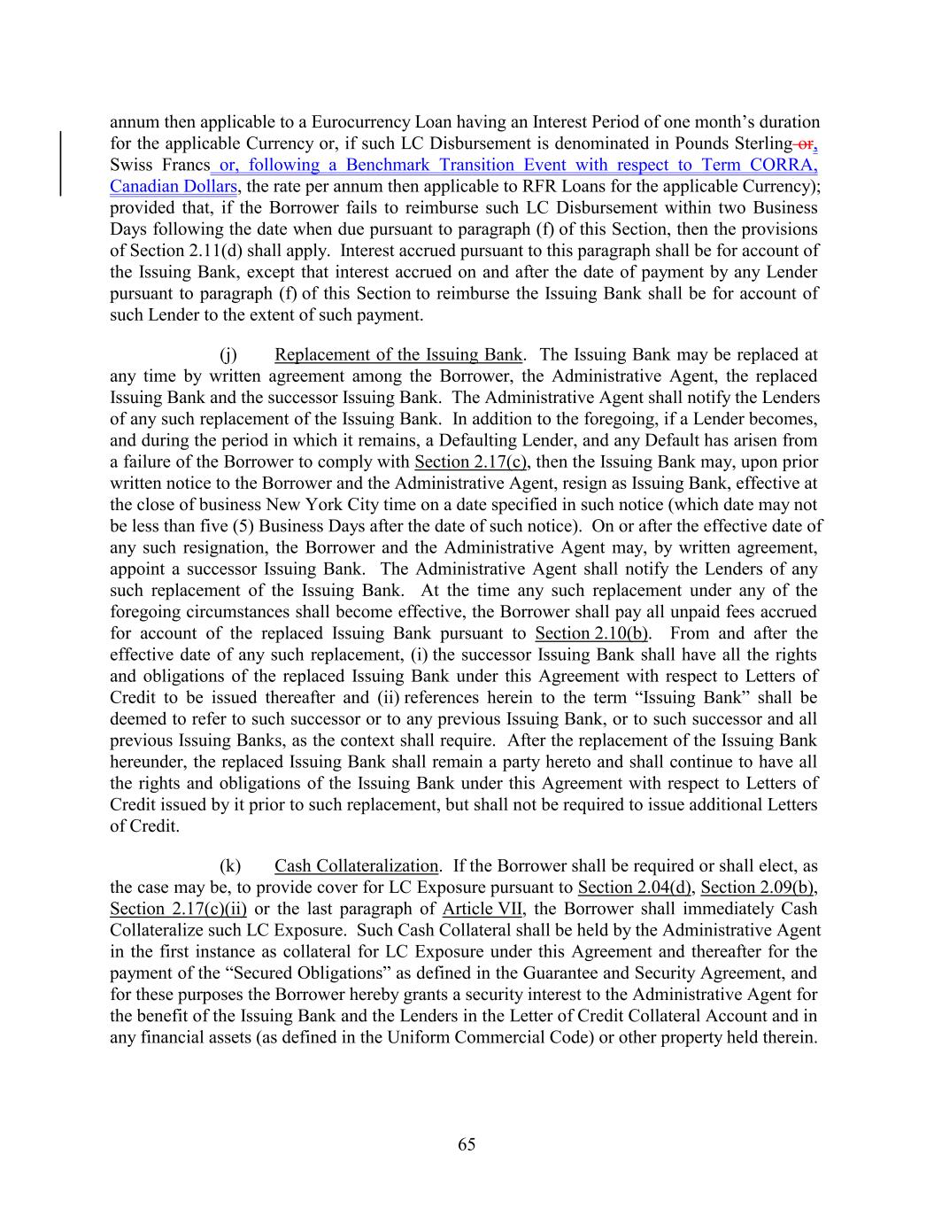 annum then applicable to a Eurocurrency Loan having an Interest Period of one month’s duration for the applicable Currency or, if such LC Disbursement is denominated in Pounds Sterling or, Swiss Francs or, following a Benchmark Transition Event with respect to Term CORRA, Canadian Dollars, the rate per annum then applicable to RFR Loans for the applicable Currency); provided that, if the Borrower fails to reimburse such LC Disbursement within two Business Days following the date when due pursuant to paragraph (f) of this Section, then the provisions of Section 2.11(d) shall apply. Interest accrued pursuant to this paragraph shall be for account of the Issuing Bank, except that interest accrued on and after the date of payment by any Lender pursuant to paragraph (f) of this Section to reimburse the Issuing Bank shall be for account of such Lender to the extent of such payment. (j) Replacement of the Issuing Bank. The Issuing Bank may be replaced at any time by written agreement among the Borrower, the Administrative Agent, the replaced Issuing Bank and the successor Issuing Bank. The Administrative Agent shall notify the Lenders of any such replacement of the Issuing Bank. In addition to the foregoing, if a Lender becomes, and during the period in which it remains, a Defaulting Lender, and any Default has arisen from a failure of the Borrower to comply with Section 2.17(c), then the Issuing Bank may, upon prior written notice to the Borrower and the Administrative Agent, resign as Issuing Bank, effective at the close of business New York City time on a date specified in such notice (which date may not be less than five (5) Business Days after the date of such notice). On or after the effective date of any such resignation, the Borrower and the Administrative Agent may, by written agreement, appoint a successor Issuing Bank. The Administrative Agent shall notify the Lenders of any such replacement of the Issuing Bank. At the time any such replacement under any of the foregoing circumstances shall become effective, the Borrower shall pay all unpaid fees accrued for account of the replaced Issuing Bank pursuant to Section 2.10(b). From and after the effective date of any such replacement, (i) the successor Issuing Bank shall have all the rights and obligations of the replaced Issuing Bank under this Agreement with respect to Letters of Credit to be issued thereafter and (ii) references herein to the term “Issuing Bank” shall be deemed to refer to such successor or to any previous Issuing Bank, or to such successor and all previous Issuing Banks, as the context shall require. After the replacement of the Issuing Bank hereunder, the replaced Issuing Bank shall remain a party hereto and shall continue to have all the rights and obligations of the Issuing Bank under this Agreement with respect to Letters of Credit issued by it prior to such replacement, but shall not be required to issue additional Letters of Credit. (k) Cash Collateralization. If the Borrower shall be required or shall elect, as the case may be, to provide cover for LC Exposure pursuant to Section 2.04(d), Section 2.09(b), Section 2.17(c)(ii) or the last paragraph of Article VII, the Borrower shall immediately Cash Collateralize such LC Exposure. Such Cash Collateral shall be held by the Administrative Agent in the first instance as collateral for LC Exposure under this Agreement and thereafter for the payment of the “Secured Obligations” as defined in the Guarantee and Security Agreement, and for these purposes the Borrower hereby grants a security interest to the Administrative Agent for the benefit of the Issuing Bank and the Lenders in the Letter of Credit Collateral Account and in any financial assets (as defined in the Uniform Commercial Code) or other property held therein. 65