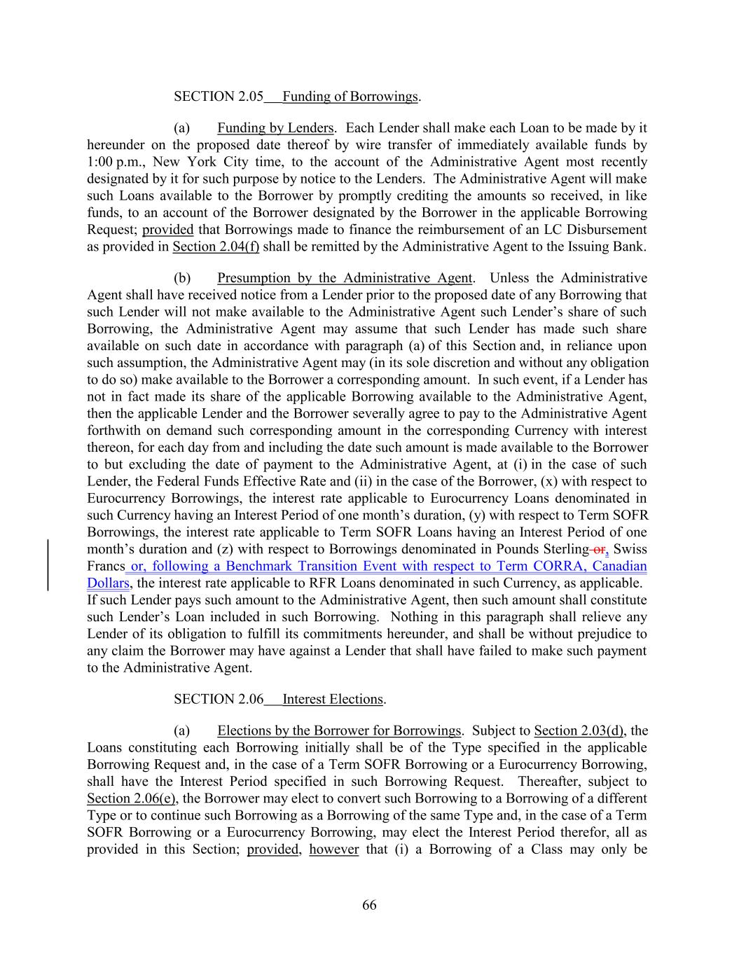 SECTION 2.05 Funding of Borrowings. (a) Funding by Lenders. Each Lender shall make each Loan to be made by it hereunder on the proposed date thereof by wire transfer of immediately available funds by 1:00 p.m., New York City time, to the account of the Administrative Agent most recently designated by it for such purpose by notice to the Lenders. The Administrative Agent will make such Loans available to the Borrower by promptly crediting the amounts so received, in like funds, to an account of the Borrower designated by the Borrower in the applicable Borrowing Request; provided that Borrowings made to finance the reimbursement of an LC Disbursement as provided in Section 2.04(f) shall be remitted by the Administrative Agent to the Issuing Bank. (b) Presumption by the Administrative Agent. Unless the Administrative Agent shall have received notice from a Lender prior to the proposed date of any Borrowing that such Lender will not make available to the Administrative Agent such Lender’s share of such Borrowing, the Administrative Agent may assume that such Lender has made such share available on such date in accordance with paragraph (a) of this Section and, in reliance upon such assumption, the Administrative Agent may (in its sole discretion and without any obligation to do so) make available to the Borrower a corresponding amount. In such event, if a Lender has not in fact made its share of the applicable Borrowing available to the Administrative Agent, then the applicable Lender and the Borrower severally agree to pay to the Administrative Agent forthwith on demand such corresponding amount in the corresponding Currency with interest thereon, for each day from and including the date such amount is made available to the Borrower to but excluding the date of payment to the Administrative Agent, at (i) in the case of such Lender, the Federal Funds Effective Rate and (ii) in the case of the Borrower, (x) with respect to Eurocurrency Borrowings, the interest rate applicable to Eurocurrency Loans denominated in such Currency having an Interest Period of one month’s duration, (y) with respect to Term SOFR Borrowings, the interest rate applicable to Term SOFR Loans having an Interest Period of one month’s duration and (z) with respect to Borrowings denominated in Pounds Sterling or, Swiss Francs or, following a Benchmark Transition Event with respect to Term CORRA, Canadian Dollars, the interest rate applicable to RFR Loans denominated in such Currency, as applicable. If such Lender pays such amount to the Administrative Agent, then such amount shall constitute such Lender’s Loan included in such Borrowing. Nothing in this paragraph shall relieve any Lender of its obligation to fulfill its commitments hereunder, and shall be without prejudice to any claim the Borrower may have against a Lender that shall have failed to make such payment to the Administrative Agent. SECTION 2.06 Interest Elections. (a) Elections by the Borrower for Borrowings. Subject to Section 2.03(d), the Loans constituting each Borrowing initially shall be of the Type specified in the applicable Borrowing Request and, in the case of a Term SOFR Borrowing or a Eurocurrency Borrowing, shall have the Interest Period specified in such Borrowing Request. Thereafter, subject to Section 2.06(e), the Borrower may elect to convert such Borrowing to a Borrowing of a different Type or to continue such Borrowing as a Borrowing of the same Type and, in the case of a Term SOFR Borrowing or a Eurocurrency Borrowing, may elect the Interest Period therefor, all as provided in this Section; provided, however that (i) a Borrowing of a Class may only be 66