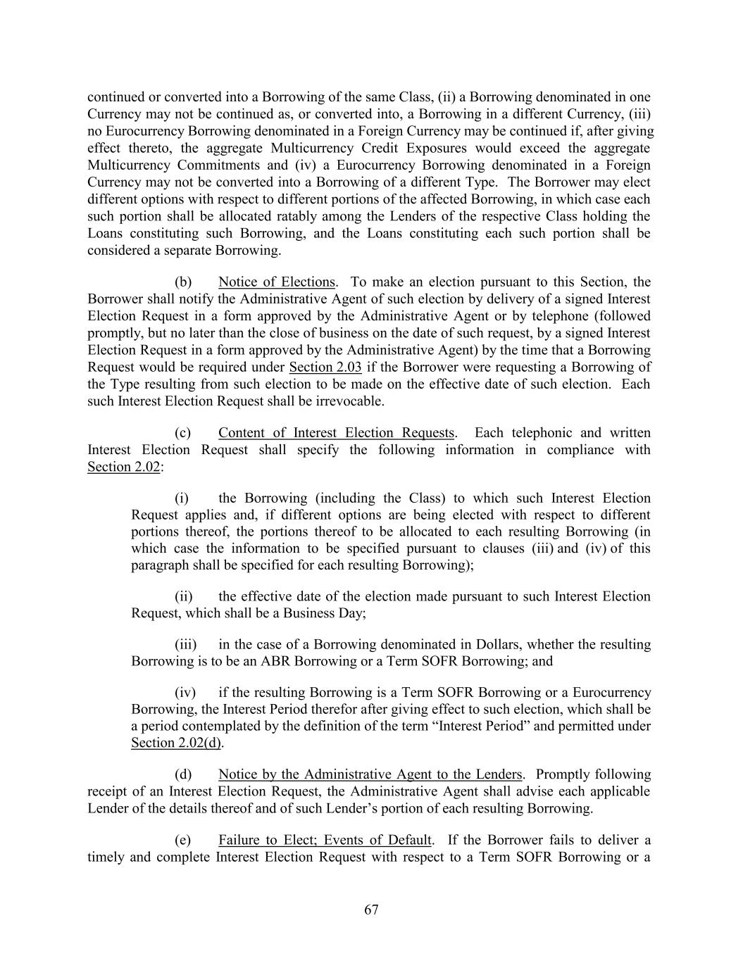 continued or converted into a Borrowing of the same Class, (ii) a Borrowing denominated in one Currency may not be continued as, or converted into, a Borrowing in a different Currency, (iii) no Eurocurrency Borrowing denominated in a Foreign Currency may be continued if, after giving effect thereto, the aggregate Multicurrency Credit Exposures would exceed the aggregate Multicurrency Commitments and (iv) a Eurocurrency Borrowing denominated in a Foreign Currency may not be converted into a Borrowing of a different Type. The Borrower may elect different options with respect to different portions of the affected Borrowing, in which case each such portion shall be allocated ratably among the Lenders of the respective Class holding the Loans constituting such Borrowing, and the Loans constituting each such portion shall be considered a separate Borrowing. (b) Notice of Elections. To make an election pursuant to this Section, the Borrower shall notify the Administrative Agent of such election by delivery of a signed Interest Election Request in a form approved by the Administrative Agent or by telephone (followed promptly, but no later than the close of business on the date of such request, by a signed Interest Election Request in a form approved by the Administrative Agent) by the time that a Borrowing Request would be required under Section 2.03 if the Borrower were requesting a Borrowing of the Type resulting from such election to be made on the effective date of such election. Each such Interest Election Request shall be irrevocable. (c) Content of Interest Election Requests. Each telephonic and written Interest Election Request shall specify the following information in compliance with Section 2.02: (i) the Borrowing (including the Class) to which such Interest Election Request applies and, if different options are being elected with respect to different portions thereof, the portions thereof to be allocated to each resulting Borrowing (in which case the information to be specified pursuant to clauses (iii) and (iv) of this paragraph shall be specified for each resulting Borrowing); (ii) the effective date of the election made pursuant to such Interest Election Request, which shall be a Business Day; (iii) in the case of a Borrowing denominated in Dollars, whether the resulting Borrowing is to be an ABR Borrowing or a Term SOFR Borrowing; and (iv) if the resulting Borrowing is a Term SOFR Borrowing or a Eurocurrency Borrowing, the Interest Period therefor after giving effect to such election, which shall be a period contemplated by the definition of the term “Interest Period” and permitted under Section 2.02(d). (d) Notice by the Administrative Agent to the Lenders. Promptly following receipt of an Interest Election Request, the Administrative Agent shall advise each applicable Lender of the details thereof and of such Lender’s portion of each resulting Borrowing. (e) Failure to Elect; Events of Default. If the Borrower fails to deliver a timely and complete Interest Election Request with respect to a Term SOFR Borrowing or a 67