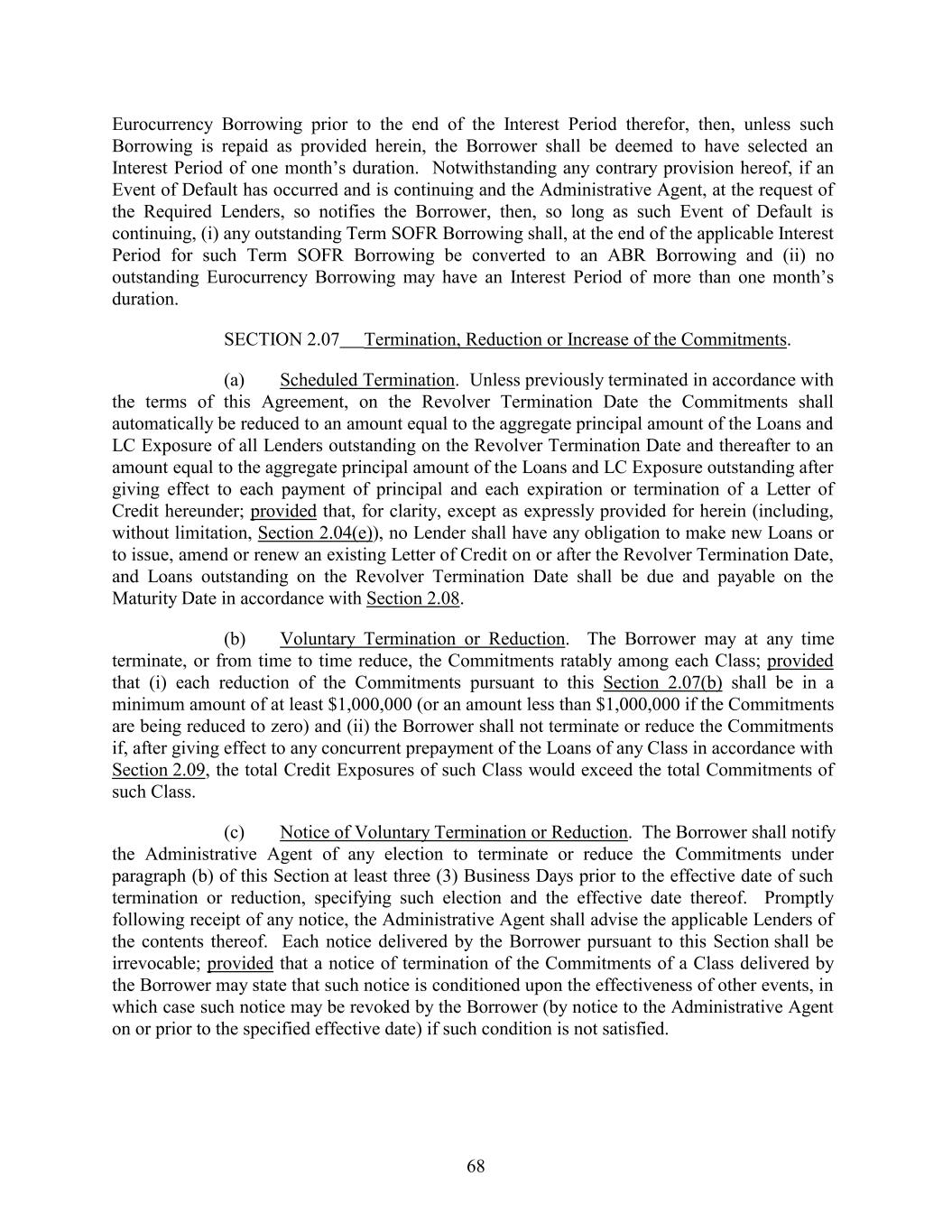 Eurocurrency Borrowing prior to the end of the Interest Period therefor, then, unless such Borrowing is repaid as provided herein, the Borrower shall be deemed to have selected an Interest Period of one month’s duration. Notwithstanding any contrary provision hereof, if an Event of Default has occurred and is continuing and the Administrative Agent, at the request of the Required Lenders, so notifies the Borrower, then, so long as such Event of Default is continuing, (i) any outstanding Term SOFR Borrowing shall, at the end of the applicable Interest Period for such Term SOFR Borrowing be converted to an ABR Borrowing and (ii) no outstanding Eurocurrency Borrowing may have an Interest Period of more than one month’s duration. SECTION 2.07 Termination, Reduction or Increase of the Commitments. (a) Scheduled Termination. Unless previously terminated in accordance with the terms of this Agreement, on the Revolver Termination Date the Commitments shall automatically be reduced to an amount equal to the aggregate principal amount of the Loans and LC Exposure of all Lenders outstanding on the Revolver Termination Date and thereafter to an amount equal to the aggregate principal amount of the Loans and LC Exposure outstanding after giving effect to each payment of principal and each expiration or termination of a Letter of Credit hereunder; provided that, for clarity, except as expressly provided for herein (including, without limitation, Section 2.04(e)), no Lender shall have any obligation to make new Loans or to issue, amend or renew an existing Letter of Credit on or after the Revolver Termination Date, and Loans outstanding on the Revolver Termination Date shall be due and payable on the Maturity Date in accordance with Section 2.08. (b) Voluntary Termination or Reduction. The Borrower may at any time terminate, or from time to time reduce, the Commitments ratably among each Class; provided that (i) each reduction of the Commitments pursuant to this Section 2.07(b) shall be in a minimum amount of at least $1,000,000 (or an amount less than $1,000,000 if the Commitments are being reduced to zero) and (ii) the Borrower shall not terminate or reduce the Commitments if, after giving effect to any concurrent prepayment of the Loans of any Class in accordance with Section 2.09, the total Credit Exposures of such Class would exceed the total Commitments of such Class. (c) Notice of Voluntary Termination or Reduction. The Borrower shall notify the Administrative Agent of any election to terminate or reduce the Commitments under paragraph (b) of this Section at least three (3) Business Days prior to the effective date of such termination or reduction, specifying such election and the effective date thereof. Promptly following receipt of any notice, the Administrative Agent shall advise the applicable Lenders of the contents thereof. Each notice delivered by the Borrower pursuant to this Section shall be irrevocable; provided that a notice of termination of the Commitments of a Class delivered by the Borrower may state that such notice is conditioned upon the effectiveness of other events, in which case such notice may be revoked by the Borrower (by notice to the Administrative Agent on or prior to the specified effective date) if such condition is not satisfied. 68