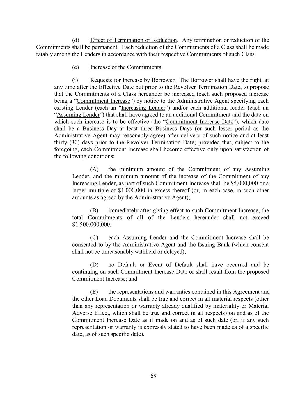 (d) Effect of Termination or Reduction. Any termination or reduction of the Commitments shall be permanent. Each reduction of the Commitments of a Class shall be made ratably among the Lenders in accordance with their respective Commitments of such Class. (e) Increase of the Commitments. (i) Requests for Increase by Borrower. The Borrower shall have the right, at any time after the Effective Date but prior to the Revolver Termination Date, to propose that the Commitments of a Class hereunder be increased (each such proposed increase being a “Commitment Increase”) by notice to the Administrative Agent specifying each existing Lender (each an “Increasing Lender”) and/or each additional lender (each an “Assuming Lender”) that shall have agreed to an additional Commitment and the date on which such increase is to be effective (the “Commitment Increase Date”), which date shall be a Business Day at least three Business Days (or such lesser period as the Administrative Agent may reasonably agree) after delivery of such notice and at least thirty (30) days prior to the Revolver Termination Date; provided that, subject to the foregoing, each Commitment Increase shall become effective only upon satisfaction of the following conditions: (A) the minimum amount of the Commitment of any Assuming Lender, and the minimum amount of the increase of the Commitment of any Increasing Lender, as part of such Commitment Increase shall be $5,000,000 or a larger multiple of $1,000,000 in excess thereof (or, in each case, in such other amounts as agreed by the Administrative Agent); (B) immediately after giving effect to such Commitment Increase, the total Commitments of all of the Lenders hereunder shall not exceed $1,500,000,000; (C) each Assuming Lender and the Commitment Increase shall be consented to by the Administrative Agent and the Issuing Bank (which consent shall not be unreasonably withheld or delayed); (D) no Default or Event of Default shall have occurred and be continuing on such Commitment Increase Date or shall result from the proposed Commitment Increase; and (E) the representations and warranties contained in this Agreement and the other Loan Documents shall be true and correct in all material respects (other than any representation or warranty already qualified by materiality or Material Adverse Effect, which shall be true and correct in all respects) on and as of the Commitment Increase Date as if made on and as of such date (or, if any such representation or warranty is expressly stated to have been made as of a specific date, as of such specific date). 69