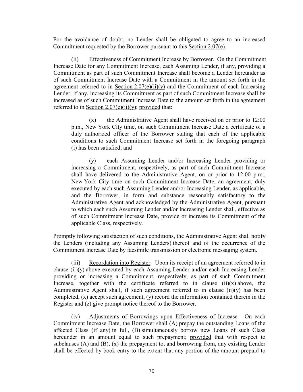 For the avoidance of doubt, no Lender shall be obligated to agree to an increased Commitment requested by the Borrower pursuant to this Section 2.07(e). (ii) Effectiveness of Commitment Increase by Borrower. On the Commitment Increase Date for any Commitment Increase, each Assuming Lender, if any, providing a Commitment as part of such Commitment Increase shall become a Lender hereunder as of such Commitment Increase Date with a Commitment in the amount set forth in the agreement referred to in Section 2.07(e)(ii)(y) and the Commitment of each Increasing Lender, if any, increasing its Commitment as part of such Commitment Increase shall be increased as of such Commitment Increase Date to the amount set forth in the agreement referred to in Section 2.07(e)(ii)(y); provided that: (x) the Administrative Agent shall have received on or prior to 12:00 p.m., New York City time, on such Commitment Increase Date a certificate of a duly authorized officer of the Borrower stating that each of the applicable conditions to such Commitment Increase set forth in the foregoing paragraph (i) has been satisfied; and (y) each Assuming Lender and/or Increasing Lender providing or increasing a Commitment, respectively, as part of such Commitment Increase shall have delivered to the Administrative Agent, on or prior to 12:00 p.m., New York City time on such Commitment Increase Date, an agreement, duly executed by each such Assuming Lender and/or Increasing Lender, as applicable, and the Borrower, in form and substance reasonably satisfactory to the Administrative Agent and acknowledged by the Administrative Agent, pursuant to which each such Assuming Lender and/or Increasing Lender shall, effective as of such Commitment Increase Date, provide or increase its Commitment of the applicable Class, respectively. Promptly following satisfaction of such conditions, the Administrative Agent shall notify the Lenders (including any Assuming Lenders) thereof and of the occurrence of the Commitment Increase Date by facsimile transmission or electronic messaging system. (iii) Recordation into Register. Upon its receipt of an agreement referred to in clause (ii)(y) above executed by each Assuming Lender and/or each Increasing Lender providing or increasing a Commitment, respectively, as part of such Commitment Increase, together with the certificate referred to in clause (ii)(x) above, the Administrative Agent shall, if such agreement referred to in clause (ii)(y) has been completed, (x) accept such agreement, (y) record the information contained therein in the Register and (z) give prompt notice thereof to the Borrower. (iv) Adjustments of Borrowings upon Effectiveness of Increase. On each Commitment Increase Date, the Borrower shall (A) prepay the outstanding Loans of the affected Class (if any) in full, (B) simultaneously borrow new Loans of such Class hereunder in an amount equal to such prepayment; provided that with respect to subclauses (A) and (B), (x) the prepayment to, and borrowing from, any existing Lender shall be effected by book entry to the extent that any portion of the amount prepaid to 70