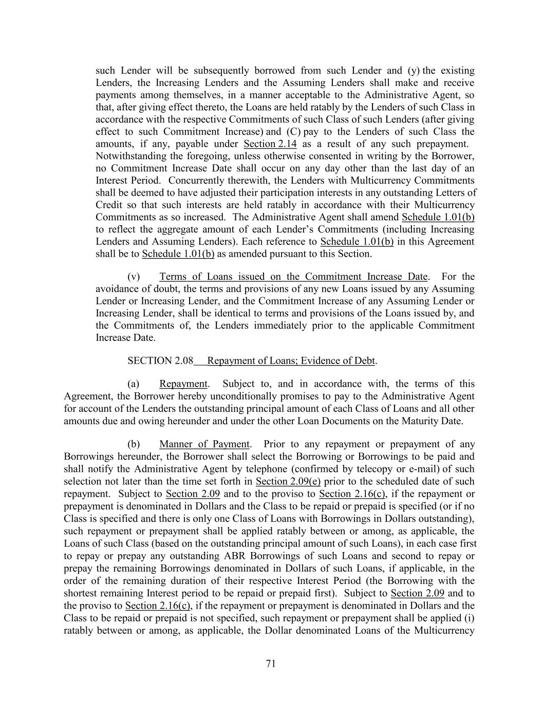 such Lender will be subsequently borrowed from such Lender and (y) the existing Lenders, the Increasing Lenders and the Assuming Lenders shall make and receive payments among themselves, in a manner acceptable to the Administrative Agent, so that, after giving effect thereto, the Loans are held ratably by the Lenders of such Class in accordance with the respective Commitments of such Class of such Lenders (after giving effect to such Commitment Increase) and (C) pay to the Lenders of such Class the amounts, if any, payable under Section 2.14 as a result of any such prepayment. Notwithstanding the foregoing, unless otherwise consented in writing by the Borrower, no Commitment Increase Date shall occur on any day other than the last day of an Interest Period. Concurrently therewith, the Lenders with Multicurrency Commitments shall be deemed to have adjusted their participation interests in any outstanding Letters of Credit so that such interests are held ratably in accordance with their Multicurrency Commitments as so increased. The Administrative Agent shall amend Schedule 1.01(b) to reflect the aggregate amount of each Lender’s Commitments (including Increasing Lenders and Assuming Lenders). Each reference to Schedule 1.01(b) in this Agreement shall be to Schedule 1.01(b) as amended pursuant to this Section. (v) Terms of Loans issued on the Commitment Increase Date. For the avoidance of doubt, the terms and provisions of any new Loans issued by any Assuming Lender or Increasing Lender, and the Commitment Increase of any Assuming Lender or Increasing Lender, shall be identical to terms and provisions of the Loans issued by, and the Commitments of, the Lenders immediately prior to the applicable Commitment Increase Date. SECTION 2.08 Repayment of Loans; Evidence of Debt. (a) Repayment. Subject to, and in accordance with, the terms of this Agreement, the Borrower hereby unconditionally promises to pay to the Administrative Agent for account of the Lenders the outstanding principal amount of each Class of Loans and all other amounts due and owing hereunder and under the other Loan Documents on the Maturity Date. (b) Manner of Payment. Prior to any repayment or prepayment of any Borrowings hereunder, the Borrower shall select the Borrowing or Borrowings to be paid and shall notify the Administrative Agent by telephone (confirmed by telecopy or e-mail) of such selection not later than the time set forth in Section 2.09(e) prior to the scheduled date of such repayment. Subject to Section 2.09 and to the proviso to Section 2.16(c), if the repayment or prepayment is denominated in Dollars and the Class to be repaid or prepaid is specified (or if no Class is specified and there is only one Class of Loans with Borrowings in Dollars outstanding), such repayment or prepayment shall be applied ratably between or among, as applicable, the Loans of such Class (based on the outstanding principal amount of such Loans), in each case first to repay or prepay any outstanding ABR Borrowings of such Loans and second to repay or prepay the remaining Borrowings denominated in Dollars of such Loans, if applicable, in the order of the remaining duration of their respective Interest Period (the Borrowing with the shortest remaining Interest period to be repaid or prepaid first). Subject to Section 2.09 and to the proviso to Section 2.16(c), if the repayment or prepayment is denominated in Dollars and the Class to be repaid or prepaid is not specified, such repayment or prepayment shall be applied (i) ratably between or among, as applicable, the Dollar denominated Loans of the Multicurrency 71