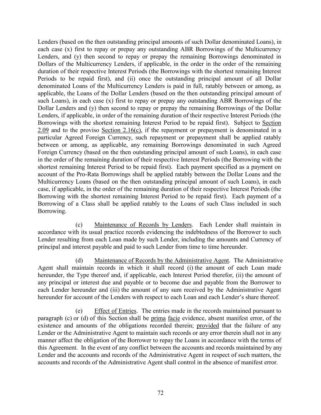 Lenders (based on the then outstanding principal amounts of such Dollar denominated Loans), in each case (x) first to repay or prepay any outstanding ABR Borrowings of the Multicurrency Lenders, and (y) then second to repay or prepay the remaining Borrowings denominated in Dollars of the Multicurrency Lenders, if applicable, in the order in the order of the remaining duration of their respective Interest Periods (the Borrowings with the shortest remaining Interest Periods to be repaid first), and (ii) once the outstanding principal amount of all Dollar denominated Loans of the Multicurrency Lenders is paid in full, ratably between or among, as applicable, the Loans of the Dollar Lenders (based on the then outstanding principal amount of such Loans), in each case (x) first to repay or prepay any outstanding ABR Borrowings of the Dollar Lenders and (y) then second to repay or prepay the remaining Borrowings of the Dollar Lenders, if applicable, in order of the remaining duration of their respective Interest Periods (the Borrowings with the shortest remaining Interest Period to be repaid first). Subject to Section 2.09 and to the proviso Section 2.16(c), if the repayment or prepayment is denominated in a particular Agreed Foreign Currency, such repayment or prepayment shall be applied ratably between or among, as applicable, any remaining Borrowings denominated in such Agreed Foreign Currency (based on the then outstanding principal amount of such Loans), in each case in the order of the remaining duration of their respective Interest Periods (the Borrowing with the shortest remaining Interest Period to be repaid first). Each payment specified as a payment on account of the Pro-Rata Borrowings shall be applied ratably between the Dollar Loans and the Multicurrency Loans (based on the then outstanding principal amount of such Loans), in each case, if applicable, in the order of the remaining duration of their respective Interest Periods (the Borrowing with the shortest remaining Interest Period to be repaid first). Each payment of a Borrowing of a Class shall be applied ratably to the Loans of such Class included in such Borrowing. (c) Maintenance of Records by Lenders. Each Lender shall maintain in accordance with its usual practice records evidencing the indebtedness of the Borrower to such Lender resulting from each Loan made by such Lender, including the amounts and Currency of principal and interest payable and paid to such Lender from time to time hereunder. (d) Maintenance of Records by the Administrative Agent. The Administrative Agent shall maintain records in which it shall record (i) the amount of each Loan made hereunder, the Type thereof and, if applicable, each Interest Period therefor, (ii) the amount of any principal or interest due and payable or to become due and payable from the Borrower to each Lender hereunder and (iii) the amount of any sum received by the Administrative Agent hereunder for account of the Lenders with respect to each Loan and each Lender’s share thereof. (e) Effect of Entries. The entries made in the records maintained pursuant to paragraph (c) or (d) of this Section shall be prima facie evidence, absent manifest error, of the existence and amounts of the obligations recorded therein; provided that the failure of any Lender or the Administrative Agent to maintain such records or any error therein shall not in any manner affect the obligation of the Borrower to repay the Loans in accordance with the terms of this Agreement. In the event of any conflict between the accounts and records maintained by any Lender and the accounts and records of the Administrative Agent in respect of such matters, the accounts and records of the Administrative Agent shall control in the absence of manifest error. 72