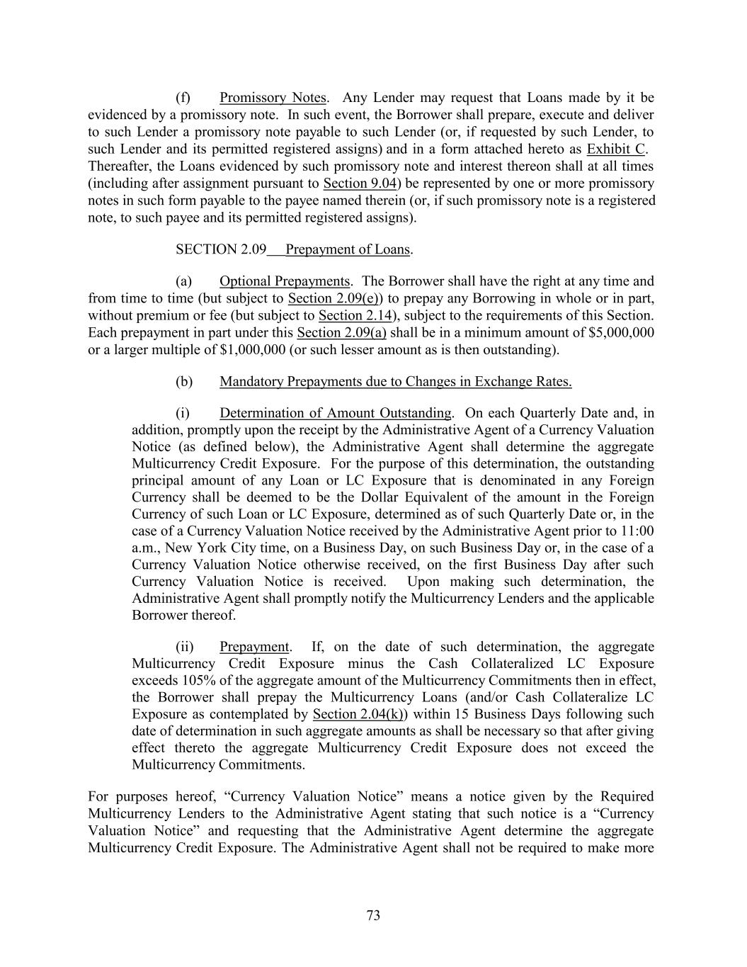 (f) Promissory Notes. Any Lender may request that Loans made by it be evidenced by a promissory note. In such event, the Borrower shall prepare, execute and deliver to such Lender a promissory note payable to such Lender (or, if requested by such Lender, to such Lender and its permitted registered assigns) and in a form attached hereto as Exhibit C. Thereafter, the Loans evidenced by such promissory note and interest thereon shall at all times (including after assignment pursuant to Section 9.04) be represented by one or more promissory notes in such form payable to the payee named therein (or, if such promissory note is a registered note, to such payee and its permitted registered assigns). SECTION 2.09 Prepayment of Loans. (a) Optional Prepayments. The Borrower shall have the right at any time and from time to time (but subject to Section 2.09(e)) to prepay any Borrowing in whole or in part, without premium or fee (but subject to Section 2.14), subject to the requirements of this Section. Each prepayment in part under this Section 2.09(a) shall be in a minimum amount of $5,000,000 or a larger multiple of $1,000,000 (or such lesser amount as is then outstanding). (b) Mandatory Prepayments due to Changes in Exchange Rates. (i) Determination of Amount Outstanding. On each Quarterly Date and, in addition, promptly upon the receipt by the Administrative Agent of a Currency Valuation Notice (as defined below), the Administrative Agent shall determine the aggregate Multicurrency Credit Exposure. For the purpose of this determination, the outstanding principal amount of any Loan or LC Exposure that is denominated in any Foreign Currency shall be deemed to be the Dollar Equivalent of the amount in the Foreign Currency of such Loan or LC Exposure, determined as of such Quarterly Date or, in the case of a Currency Valuation Notice received by the Administrative Agent prior to 11:00 a.m., New York City time, on a Business Day, on such Business Day or, in the case of a Currency Valuation Notice otherwise received, on the first Business Day after such Currency Valuation Notice is received. Upon making such determination, the Administrative Agent shall promptly notify the Multicurrency Lenders and the applicable Borrower thereof. (ii) Prepayment. If, on the date of such determination, the aggregate Multicurrency Credit Exposure minus the Cash Collateralized LC Exposure exceeds 105% of the aggregate amount of the Multicurrency Commitments then in effect, the Borrower shall prepay the Multicurrency Loans (and/or Cash Collateralize LC Exposure as contemplated by Section 2.04(k)) within 15 Business Days following such date of determination in such aggregate amounts as shall be necessary so that after giving effect thereto the aggregate Multicurrency Credit Exposure does not exceed the Multicurrency Commitments. For purposes hereof, “Currency Valuation Notice” means a notice given by the Required Multicurrency Lenders to the Administrative Agent stating that such notice is a “Currency Valuation Notice” and requesting that the Administrative Agent determine the aggregate Multicurrency Credit Exposure. The Administrative Agent shall not be required to make more 73