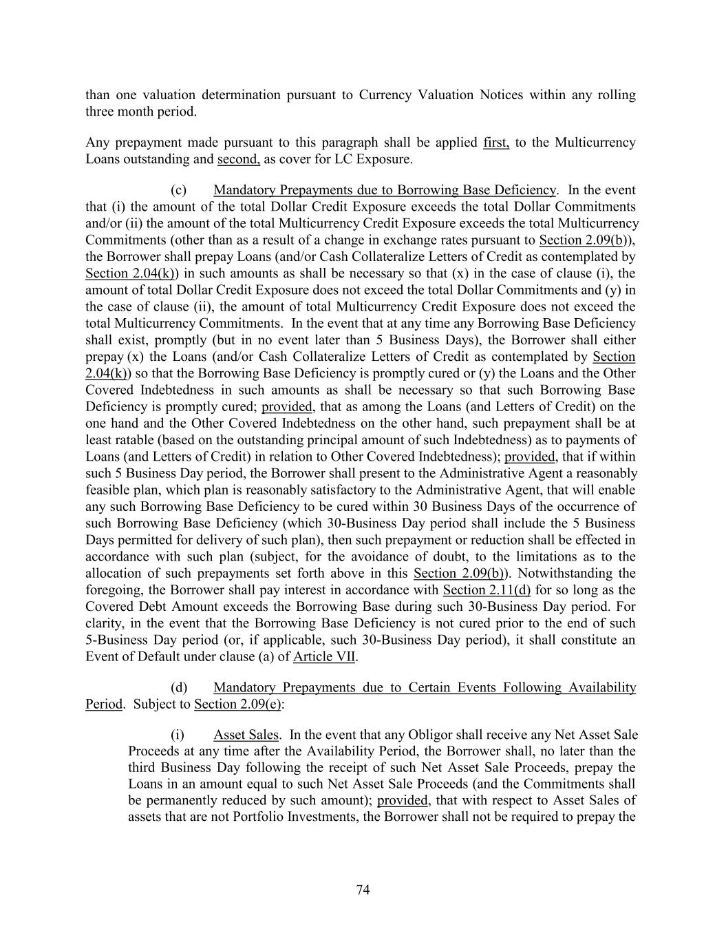 than one valuation determination pursuant to Currency Valuation Notices within any rolling three month period. Any prepayment made pursuant to this paragraph shall be applied first, to the Multicurrency Loans outstanding and second, as cover for LC Exposure. (c) Mandatory Prepayments due to Borrowing Base Deficiency. In the event that (i) the amount of the total Dollar Credit Exposure exceeds the total Dollar Commitments and/or (ii) the amount of the total Multicurrency Credit Exposure exceeds the total Multicurrency Commitments (other than as a result of a change in exchange rates pursuant to Section 2.09(b)), the Borrower shall prepay Loans (and/or Cash Collateralize Letters of Credit as contemplated by Section 2.04(k)) in such amounts as shall be necessary so that (x) in the case of clause (i), the amount of total Dollar Credit Exposure does not exceed the total Dollar Commitments and (y) in the case of clause (ii), the amount of total Multicurrency Credit Exposure does not exceed the total Multicurrency Commitments. In the event that at any time any Borrowing Base Deficiency shall exist, promptly (but in no event later than 5 Business Days), the Borrower shall either prepay (x) the Loans (and/or Cash Collateralize Letters of Credit as contemplated by Section 2.04(k)) so that the Borrowing Base Deficiency is promptly cured or (y) the Loans and the Other Covered Indebtedness in such amounts as shall be necessary so that such Borrowing Base Deficiency is promptly cured; provided, that as among the Loans (and Letters of Credit) on the one hand and the Other Covered Indebtedness on the other hand, such prepayment shall be at least ratable (based on the outstanding principal amount of such Indebtedness) as to payments of Loans (and Letters of Credit) in relation to Other Covered Indebtedness); provided, that if within such 5 Business Day period, the Borrower shall present to the Administrative Agent a reasonably feasible plan, which plan is reasonably satisfactory to the Administrative Agent, that will enable any such Borrowing Base Deficiency to be cured within 30 Business Days of the occurrence of such Borrowing Base Deficiency (which 30-Business Day period shall include the 5 Business Days permitted for delivery of such plan), then such prepayment or reduction shall be effected in accordance with such plan (subject, for the avoidance of doubt, to the limitations as to the allocation of such prepayments set forth above in this Section 2.09(b)). Notwithstanding the foregoing, the Borrower shall pay interest in accordance with Section 2.11(d) for so long as the Covered Debt Amount exceeds the Borrowing Base during such 30-Business Day period. For clarity, in the event that the Borrowing Base Deficiency is not cured prior to the end of such 5-Business Day period (or, if applicable, such 30-Business Day period), it shall constitute an Event of Default under clause (a) of Article VII. (d) Mandatory Prepayments due to Certain Events Following Availability Period. Subject to Section 2.09(e): (i) Asset Sales. In the event that any Obligor shall receive any Net Asset Sale Proceeds at any time after the Availability Period, the Borrower shall, no later than the third Business Day following the receipt of such Net Asset Sale Proceeds, prepay the Loans in an amount equal to such Net Asset Sale Proceeds (and the Commitments shall be permanently reduced by such amount); provided, that with respect to Asset Sales of assets that are not Portfolio Investments, the Borrower shall not be required to prepay the 74