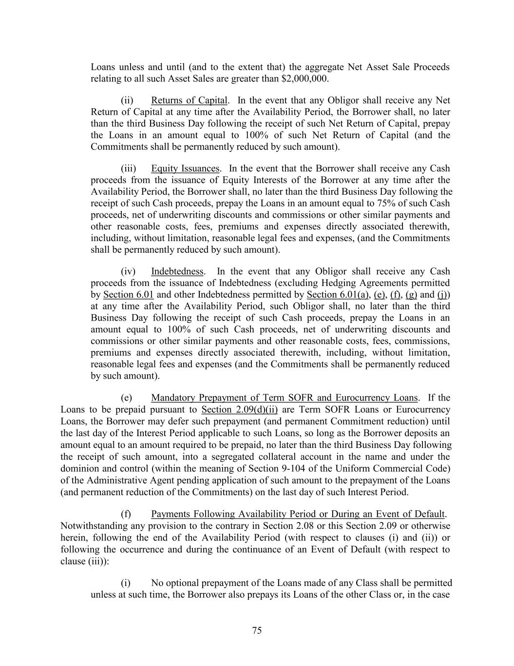 Loans unless and until (and to the extent that) the aggregate Net Asset Sale Proceeds relating to all such Asset Sales are greater than $2,000,000. (ii) Returns of Capital. In the event that any Obligor shall receive any Net Return of Capital at any time after the Availability Period, the Borrower shall, no later than the third Business Day following the receipt of such Net Return of Capital, prepay the Loans in an amount equal to 100% of such Net Return of Capital (and the Commitments shall be permanently reduced by such amount). (iii) Equity Issuances. In the event that the Borrower shall receive any Cash proceeds from the issuance of Equity Interests of the Borrower at any time after the Availability Period, the Borrower shall, no later than the third Business Day following the receipt of such Cash proceeds, prepay the Loans in an amount equal to 75% of such Cash proceeds, net of underwriting discounts and commissions or other similar payments and other reasonable costs, fees, premiums and expenses directly associated therewith, including, without limitation, reasonable legal fees and expenses, (and the Commitments shall be permanently reduced by such amount). (iv) Indebtedness. In the event that any Obligor shall receive any Cash proceeds from the issuance of Indebtedness (excluding Hedging Agreements permitted by Section 6.01 and other Indebtedness permitted by Section 6.01(a), (e), (f), (g) and (j)) at any time after the Availability Period, such Obligor shall, no later than the third Business Day following the receipt of such Cash proceeds, prepay the Loans in an amount equal to 100% of such Cash proceeds, net of underwriting discounts and commissions or other similar payments and other reasonable costs, fees, commissions, premiums and expenses directly associated therewith, including, without limitation, reasonable legal fees and expenses (and the Commitments shall be permanently reduced by such amount). (e) Mandatory Prepayment of Term SOFR and Eurocurrency Loans. If the Loans to be prepaid pursuant to Section 2.09(d)(ii) are Term SOFR Loans or Eurocurrency Loans, the Borrower may defer such prepayment (and permanent Commitment reduction) until the last day of the Interest Period applicable to such Loans, so long as the Borrower deposits an amount equal to an amount required to be prepaid, no later than the third Business Day following the receipt of such amount, into a segregated collateral account in the name and under the dominion and control (within the meaning of Section 9-104 of the Uniform Commercial Code) of the Administrative Agent pending application of such amount to the prepayment of the Loans (and permanent reduction of the Commitments) on the last day of such Interest Period. (f) Payments Following Availability Period or During an Event of Default. Notwithstanding any provision to the contrary in Section 2.08 or this Section 2.09 or otherwise herein, following the end of the Availability Period (with respect to clauses (i) and (ii)) or following the occurrence and during the continuance of an Event of Default (with respect to clause (iii)): (i) No optional prepayment of the Loans made of any Class shall be permitted unless at such time, the Borrower also prepays its Loans of the other Class or, in the case 75