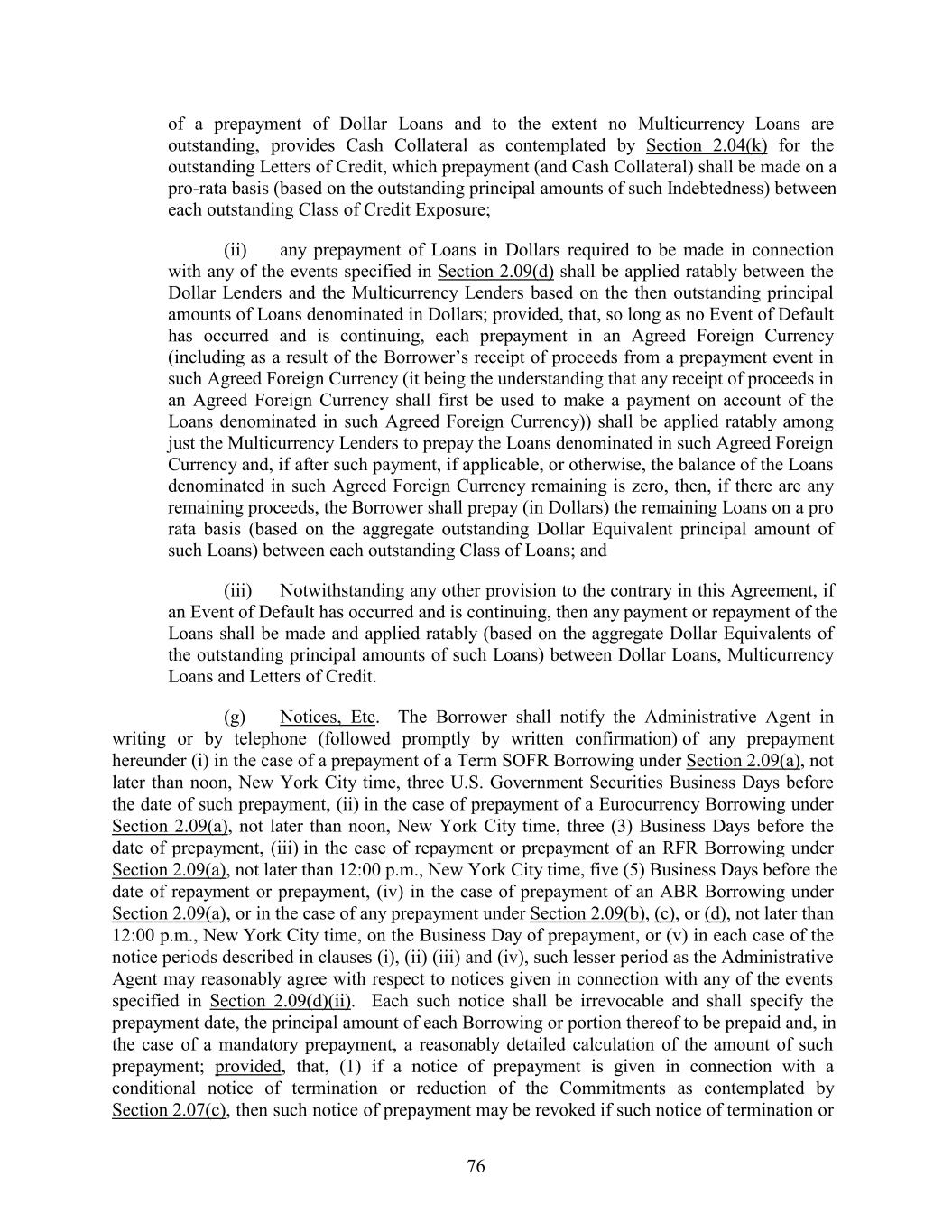 of a prepayment of Dollar Loans and to the extent no Multicurrency Loans are outstanding, provides Cash Collateral as contemplated by Section 2.04(k) for the outstanding Letters of Credit, which prepayment (and Cash Collateral) shall be made on a pro-rata basis (based on the outstanding principal amounts of such Indebtedness) between each outstanding Class of Credit Exposure; (ii) any prepayment of Loans in Dollars required to be made in connection with any of the events specified in Section 2.09(d) shall be applied ratably between the Dollar Lenders and the Multicurrency Lenders based on the then outstanding principal amounts of Loans denominated in Dollars; provided, that, so long as no Event of Default has occurred and is continuing, each prepayment in an Agreed Foreign Currency (including as a result of the Borrower’s receipt of proceeds from a prepayment event in such Agreed Foreign Currency (it being the understanding that any receipt of proceeds in an Agreed Foreign Currency shall first be used to make a payment on account of the Loans denominated in such Agreed Foreign Currency)) shall be applied ratably among just the Multicurrency Lenders to prepay the Loans denominated in such Agreed Foreign Currency and, if after such payment, if applicable, or otherwise, the balance of the Loans denominated in such Agreed Foreign Currency remaining is zero, then, if there are any remaining proceeds, the Borrower shall prepay (in Dollars) the remaining Loans on a pro rata basis (based on the aggregate outstanding Dollar Equivalent principal amount of such Loans) between each outstanding Class of Loans; and (iii) Notwithstanding any other provision to the contrary in this Agreement, if an Event of Default has occurred and is continuing, then any payment or repayment of the Loans shall be made and applied ratably (based on the aggregate Dollar Equivalents of the outstanding principal amounts of such Loans) between Dollar Loans, Multicurrency Loans and Letters of Credit. (g) Notices, Etc. The Borrower shall notify the Administrative Agent in writing or by telephone (followed promptly by written confirmation) of any prepayment hereunder (i) in the case of a prepayment of a Term SOFR Borrowing under Section 2.09(a), not later than noon, New York City time, three U.S. Government Securities Business Days before the date of such prepayment, (ii) in the case of prepayment of a Eurocurrency Borrowing under Section 2.09(a), not later than noon, New York City time, three (3) Business Days before the date of prepayment, (iii) in the case of repayment or prepayment of an RFR Borrowing under Section 2.09(a), not later than 12:00 p.m., New York City time, five (5) Business Days before the date of repayment or prepayment, (iv) in the case of prepayment of an ABR Borrowing under Section 2.09(a), or in the case of any prepayment under Section 2.09(b), (c), or (d), not later than 12:00 p.m., New York City time, on the Business Day of prepayment, or (v) in each case of the notice periods described in clauses (i), (ii) (iii) and (iv), such lesser period as the Administrative Agent may reasonably agree with respect to notices given in connection with any of the events specified in Section 2.09(d)(ii). Each such notice shall be irrevocable and shall specify the prepayment date, the principal amount of each Borrowing or portion thereof to be prepaid and, in the case of a mandatory prepayment, a reasonably detailed calculation of the amount of such prepayment; provided, that, (1) if a notice of prepayment is given in connection with a conditional notice of termination or reduction of the Commitments as contemplated by Section 2.07(c), then such notice of prepayment may be revoked if such notice of termination or 76