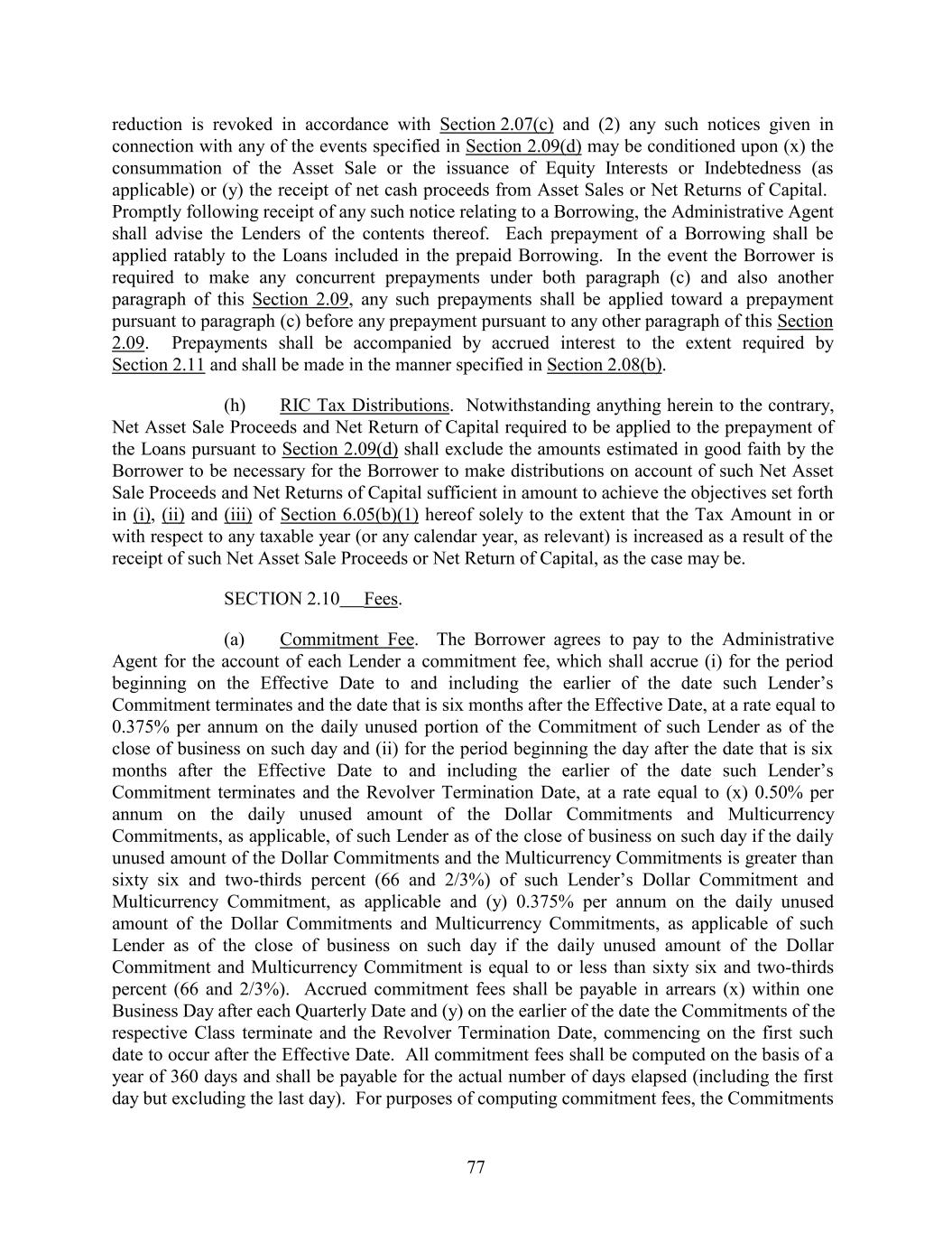 reduction is revoked in accordance with Section 2.07(c) and (2) any such notices given in connection with any of the events specified in Section 2.09(d) may be conditioned upon (x) the consummation of the Asset Sale or the issuance of Equity Interests or Indebtedness (as applicable) or (y) the receipt of net cash proceeds from Asset Sales or Net Returns of Capital. Promptly following receipt of any such notice relating to a Borrowing, the Administrative Agent shall advise the Lenders of the contents thereof. Each prepayment of a Borrowing shall be applied ratably to the Loans included in the prepaid Borrowing. In the event the Borrower is required to make any concurrent prepayments under both paragraph (c) and also another paragraph of this Section 2.09, any such prepayments shall be applied toward a prepayment pursuant to paragraph (c) before any prepayment pursuant to any other paragraph of this Section 2.09. Prepayments shall be accompanied by accrued interest to the extent required by Section 2.11 and shall be made in the manner specified in Section 2.08(b). (h) RIC Tax Distributions. Notwithstanding anything herein to the contrary, Net Asset Sale Proceeds and Net Return of Capital required to be applied to the prepayment of the Loans pursuant to Section 2.09(d) shall exclude the amounts estimated in good faith by the Borrower to be necessary for the Borrower to make distributions on account of such Net Asset Sale Proceeds and Net Returns of Capital sufficient in amount to achieve the objectives set forth in (i), (ii) and (iii) of Section 6.05(b)(1) hereof solely to the extent that the Tax Amount in or with respect to any taxable year (or any calendar year, as relevant) is increased as a result of the receipt of such Net Asset Sale Proceeds or Net Return of Capital, as the case may be. SECTION 2.10 Fees. (a) Commitment Fee. The Borrower agrees to pay to the Administrative Agent for the account of each Lender a commitment fee, which shall accrue (i) for the period beginning on the Effective Date to and including the earlier of the date such Lender’s Commitment terminates and the date that is six months after the Effective Date, at a rate equal to 0.375% per annum on the daily unused portion of the Commitment of such Lender as of the close of business on such day and (ii) for the period beginning the day after the date that is six months after the Effective Date to and including the earlier of the date such Lender’s Commitment terminates and the Revolver Termination Date, at a rate equal to (x) 0.50% per annum on the daily unused amount of the Dollar Commitments and Multicurrency Commitments, as applicable, of such Lender as of the close of business on such day if the daily unused amount of the Dollar Commitments and the Multicurrency Commitments is greater than sixty six and two-thirds percent (66 and 2/3%) of such Lender’s Dollar Commitment and Multicurrency Commitment, as applicable and (y) 0.375% per annum on the daily unused amount of the Dollar Commitments and Multicurrency Commitments, as applicable of such Lender as of the close of business on such day if the daily unused amount of the Dollar Commitment and Multicurrency Commitment is equal to or less than sixty six and two-thirds percent (66 and 2/3%). Accrued commitment fees shall be payable in arrears (x) within one Business Day after each Quarterly Date and (y) on the earlier of the date the Commitments of the respective Class terminate and the Revolver Termination Date, commencing on the first such date to occur after the Effective Date. All commitment fees shall be computed on the basis of a year of 360 days and shall be payable for the actual number of days elapsed (including the first day but excluding the last day). For purposes of computing commitment fees, the Commitments 77
