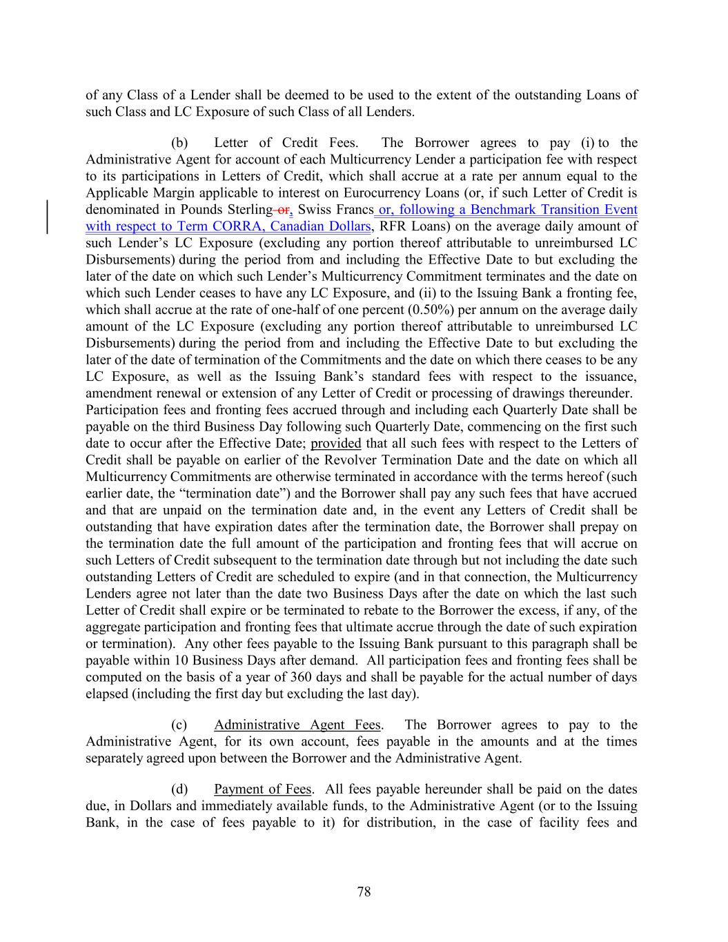 of any Class of a Lender shall be deemed to be used to the extent of the outstanding Loans of such Class and LC Exposure of such Class of all Lenders. (b) Letter of Credit Fees. The Borrower agrees to pay (i) to the Administrative Agent for account of each Multicurrency Lender a participation fee with respect to its participations in Letters of Credit, which shall accrue at a rate per annum equal to the Applicable Margin applicable to interest on Eurocurrency Loans (or, if such Letter of Credit is denominated in Pounds Sterling or, Swiss Francs or, following a Benchmark Transition Event with respect to Term CORRA, Canadian Dollars, RFR Loans) on the average daily amount of such Lender’s LC Exposure (excluding any portion thereof attributable to unreimbursed LC Disbursements) during the period from and including the Effective Date to but excluding the later of the date on which such Lender’s Multicurrency Commitment terminates and the date on which such Lender ceases to have any LC Exposure, and (ii) to the Issuing Bank a fronting fee, which shall accrue at the rate of one-half of one percent (0.50%) per annum on the average daily amount of the LC Exposure (excluding any portion thereof attributable to unreimbursed LC Disbursements) during the period from and including the Effective Date to but excluding the later of the date of termination of the Commitments and the date on which there ceases to be any LC Exposure, as well as the Issuing Bank’s standard fees with respect to the issuance, amendment renewal or extension of any Letter of Credit or processing of drawings thereunder. Participation fees and fronting fees accrued through and including each Quarterly Date shall be payable on the third Business Day following such Quarterly Date, commencing on the first such date to occur after the Effective Date; provided that all such fees with respect to the Letters of Credit shall be payable on earlier of the Revolver Termination Date and the date on which all Multicurrency Commitments are otherwise terminated in accordance with the terms hereof (such earlier date, the “termination date”) and the Borrower shall pay any such fees that have accrued and that are unpaid on the termination date and, in the event any Letters of Credit shall be outstanding that have expiration dates after the termination date, the Borrower shall prepay on the termination date the full amount of the participation and fronting fees that will accrue on such Letters of Credit subsequent to the termination date through but not including the date such outstanding Letters of Credit are scheduled to expire (and in that connection, the Multicurrency Lenders agree not later than the date two Business Days after the date on which the last such Letter of Credit shall expire or be terminated to rebate to the Borrower the excess, if any, of the aggregate participation and fronting fees that ultimate accrue through the date of such expiration or termination). Any other fees payable to the Issuing Bank pursuant to this paragraph shall be payable within 10 Business Days after demand. All participation fees and fronting fees shall be computed on the basis of a year of 360 days and shall be payable for the actual number of days elapsed (including the first day but excluding the last day). (c) Administrative Agent Fees. The Borrower agrees to pay to the Administrative Agent, for its own account, fees payable in the amounts and at the times separately agreed upon between the Borrower and the Administrative Agent. (d) Payment of Fees. All fees payable hereunder shall be paid on the dates due, in Dollars and immediately available funds, to the Administrative Agent (or to the Issuing Bank, in the case of fees payable to it) for distribution, in the case of facility fees and 78