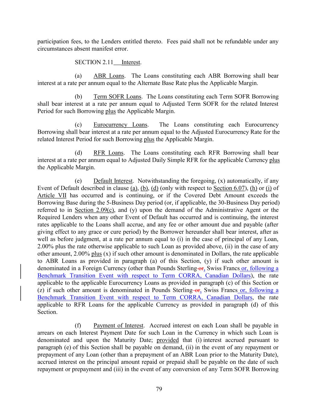 participation fees, to the Lenders entitled thereto. Fees paid shall not be refundable under any circumstances absent manifest error. SECTION 2.11 Interest. (a) ABR Loans. The Loans constituting each ABR Borrowing shall bear interest at a rate per annum equal to the Alternate Base Rate plus the Applicable Margin. (b) Term SOFR Loans. The Loans constituting each Term SOFR Borrowing shall bear interest at a rate per annum equal to Adjusted Term SOFR for the related Interest Period for such Borrowing plus the Applicable Margin. (c) Eurocurrency Loans. The Loans constituting each Eurocurrency Borrowing shall bear interest at a rate per annum equal to the Adjusted Eurocurrency Rate for the related Interest Period for such Borrowing plus the Applicable Margin. (d) RFR Loans. The Loans constituting each RFR Borrowing shall bear interest at a rate per annum equal to Adjusted Daily Simple RFR for the applicable Currency plus the Applicable Margin. (e) Default Interest. Notwithstanding the foregoing, (x) automatically, if any Event of Default described in clause (a), (b), (d) (only with respect to Section 6.07), (h) or (i) of Article VII has occurred and is continuing, or if the Covered Debt Amount exceeds the Borrowing Base during the 5-Business Day period (or, if applicable, the 30-Business Day period) referred to in Section 2.09(c), and (y) upon the demand of the Administrative Agent or the Required Lenders when any other Event of Default has occurred and is continuing, the interest rates applicable to the Loans shall accrue, and any fee or other amount due and payable (after giving effect to any grace or cure period) by the Borrower hereunder shall bear interest, after as well as before judgment, at a rate per annum equal to (i) in the case of principal of any Loan, 2.00% plus the rate otherwise applicable to such Loan as provided above, (ii) in the case of any other amount, 2.00% plus (x) if such other amount is denominated in Dollars, the rate applicable to ABR Loans as provided in paragraph (a) of this Section, (y) if such other amount is denominated in a Foreign Currency (other than Pounds Sterling or, Swiss Francs or, following a Benchmark Transition Event with respect to Term CORRA, Canadian Dollars), the rate applicable to the applicable Eurocurrency Loans as provided in paragraph (c) of this Section or (z) if such other amount is denominated in Pounds Sterling or, Swiss Francs or, following a Benchmark Transition Event with respect to Term CORRA, Canadian Dollars, the rate applicable to RFR Loans for the applicable Currency as provided in paragraph (d) of this Section. (f) Payment of Interest. Accrued interest on each Loan shall be payable in arrears on each Interest Payment Date for such Loan in the Currency in which such Loan is denominated and upon the Maturity Date; provided that (i) interest accrued pursuant to paragraph (e) of this Section shall be payable on demand, (ii) in the event of any repayment or prepayment of any Loan (other than a prepayment of an ABR Loan prior to the Maturity Date), accrued interest on the principal amount repaid or prepaid shall be payable on the date of such repayment or prepayment and (iii) in the event of any conversion of any Term SOFR Borrowing 79
